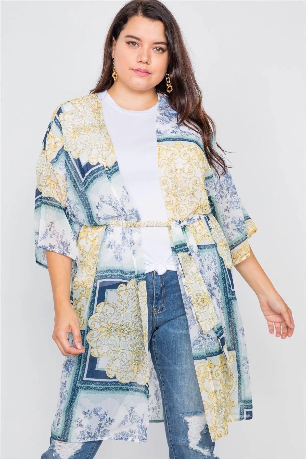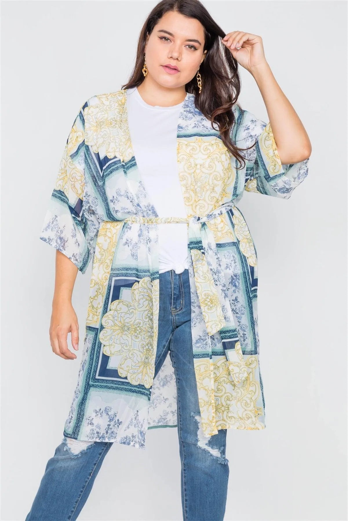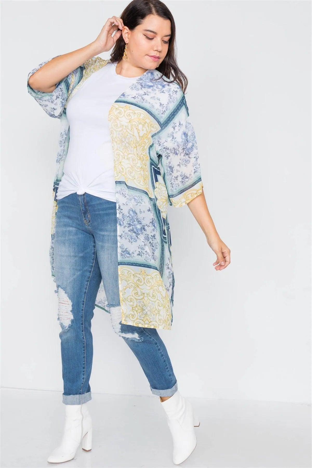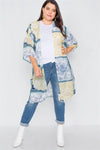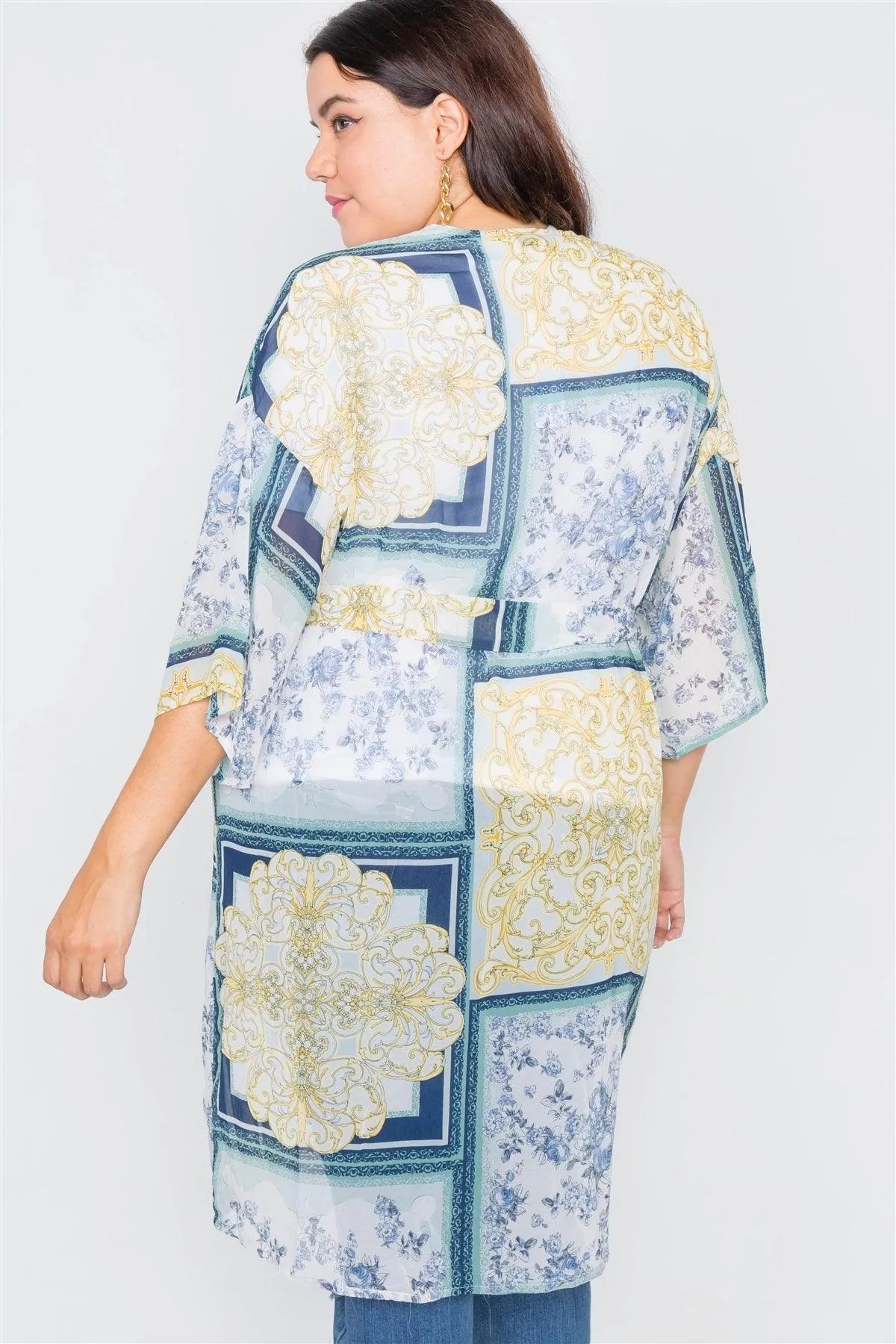 Plus Size Blue Multi Boho Festival Print Sheer Midi Kimono /3-3