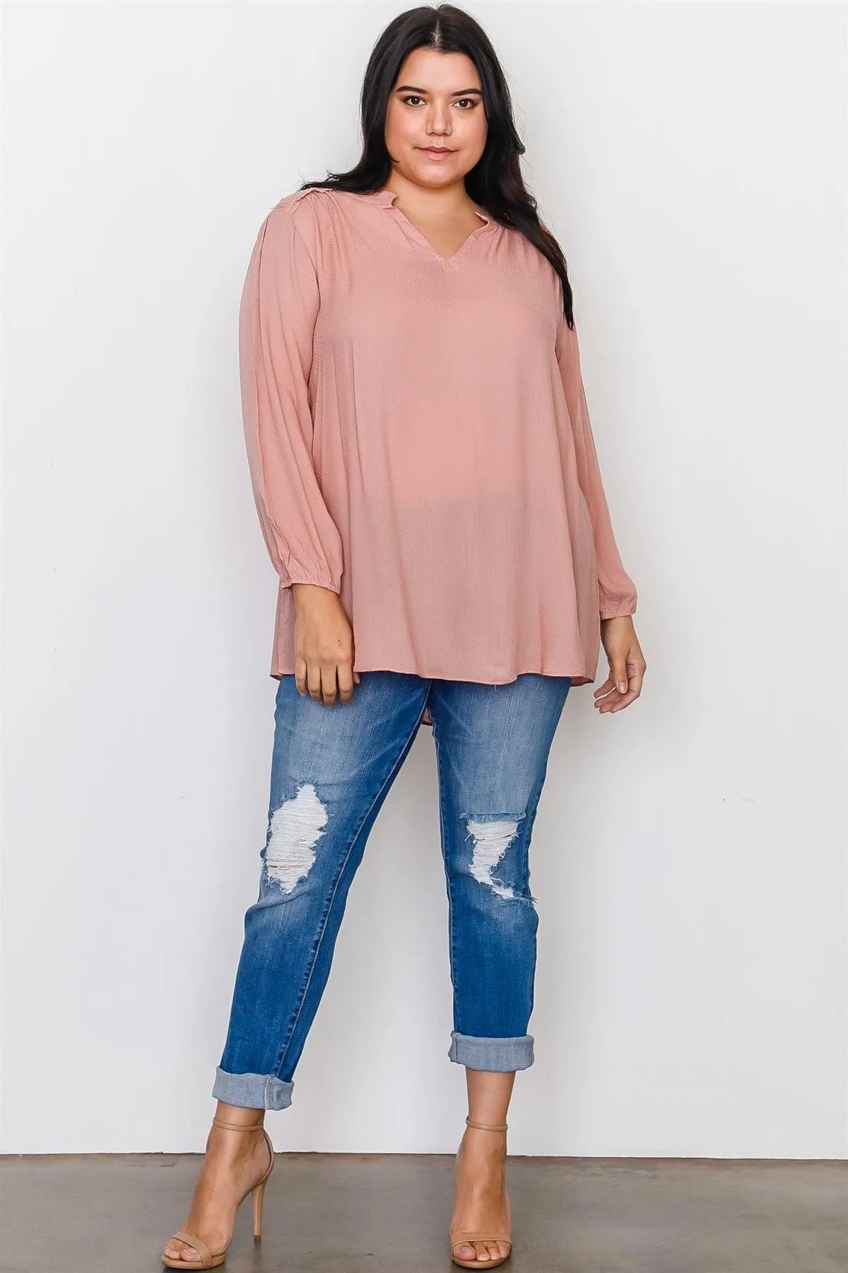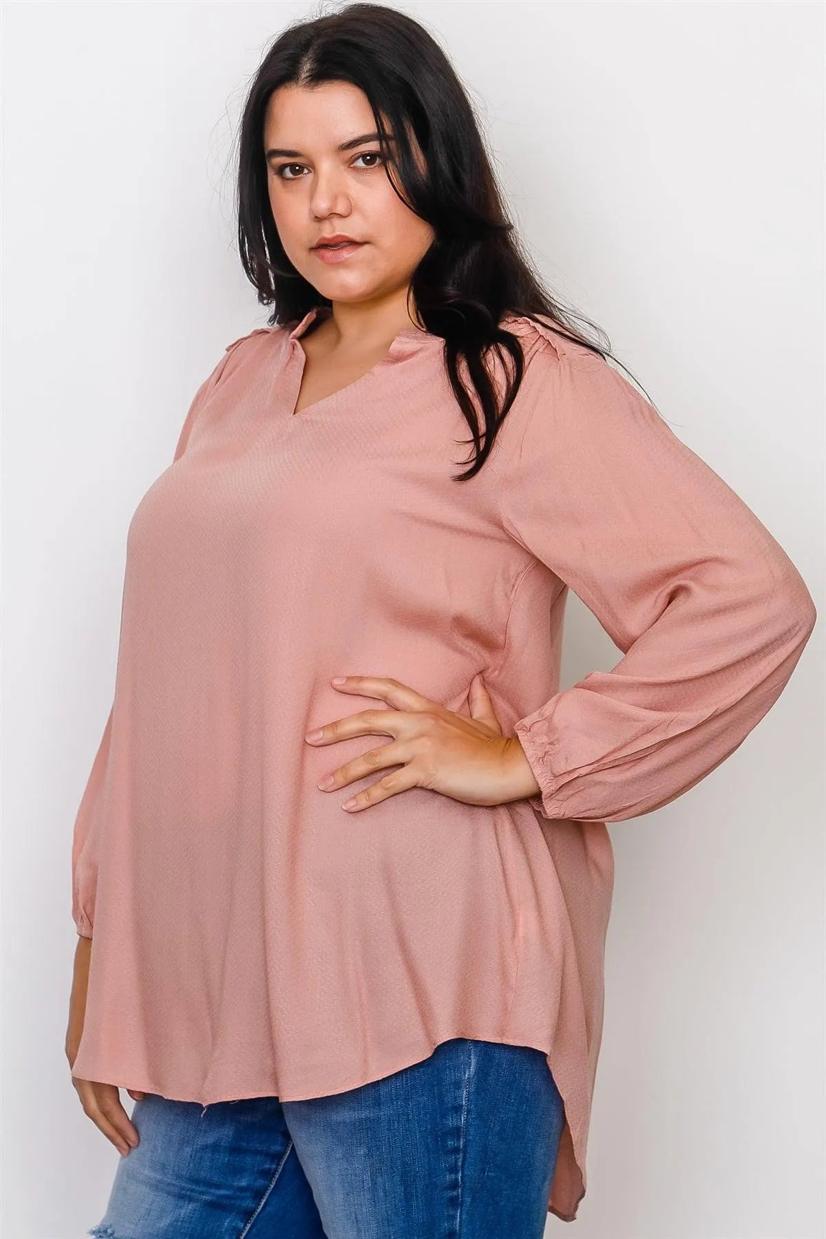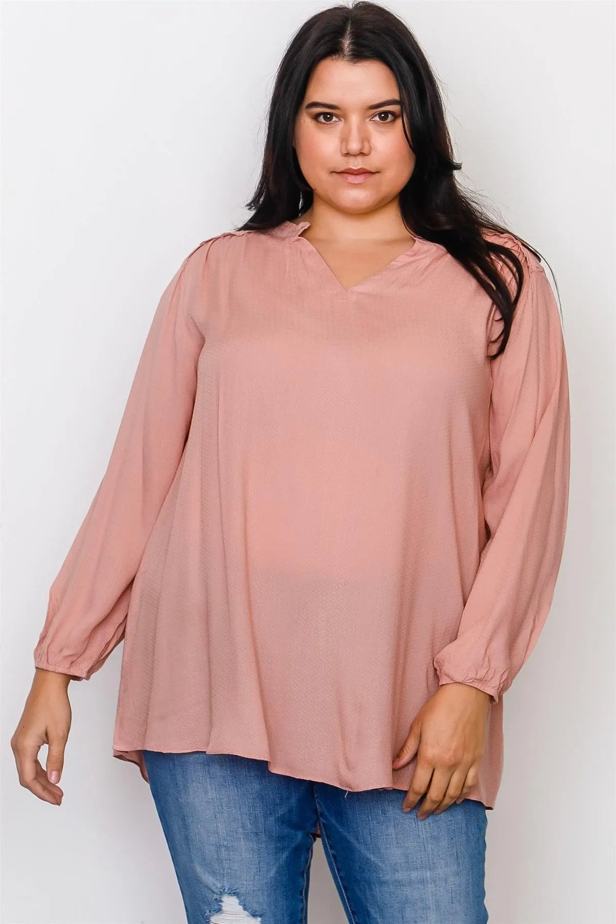 Junior Plus Size Top features: unlined, long sleeves with elastic cuffs, V neckline, frill neckline, frill trim, hi-low hem, relaxed fit.Model is 5'9 and wearing 1X (Waist: 37", Bust: 38DD, Hips: 47")Item Measurements: Length: 30", Bust: 49", Sleeve Length: 22"