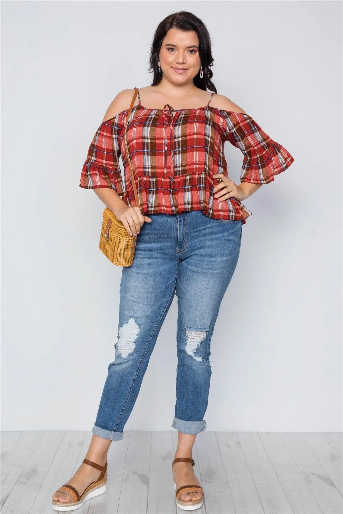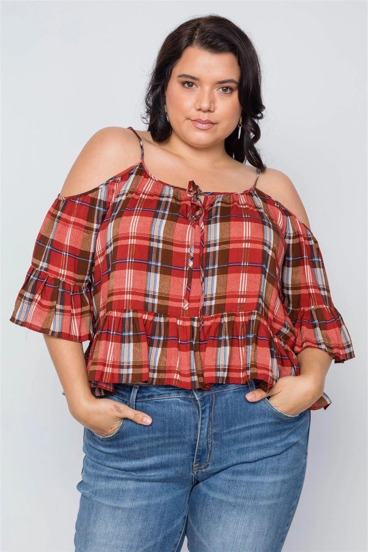 Plus Size Burgundy Rust Plaid Print Cold Shoulder Top /2-3-3
