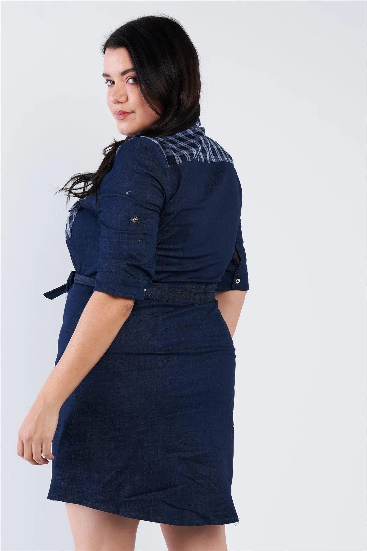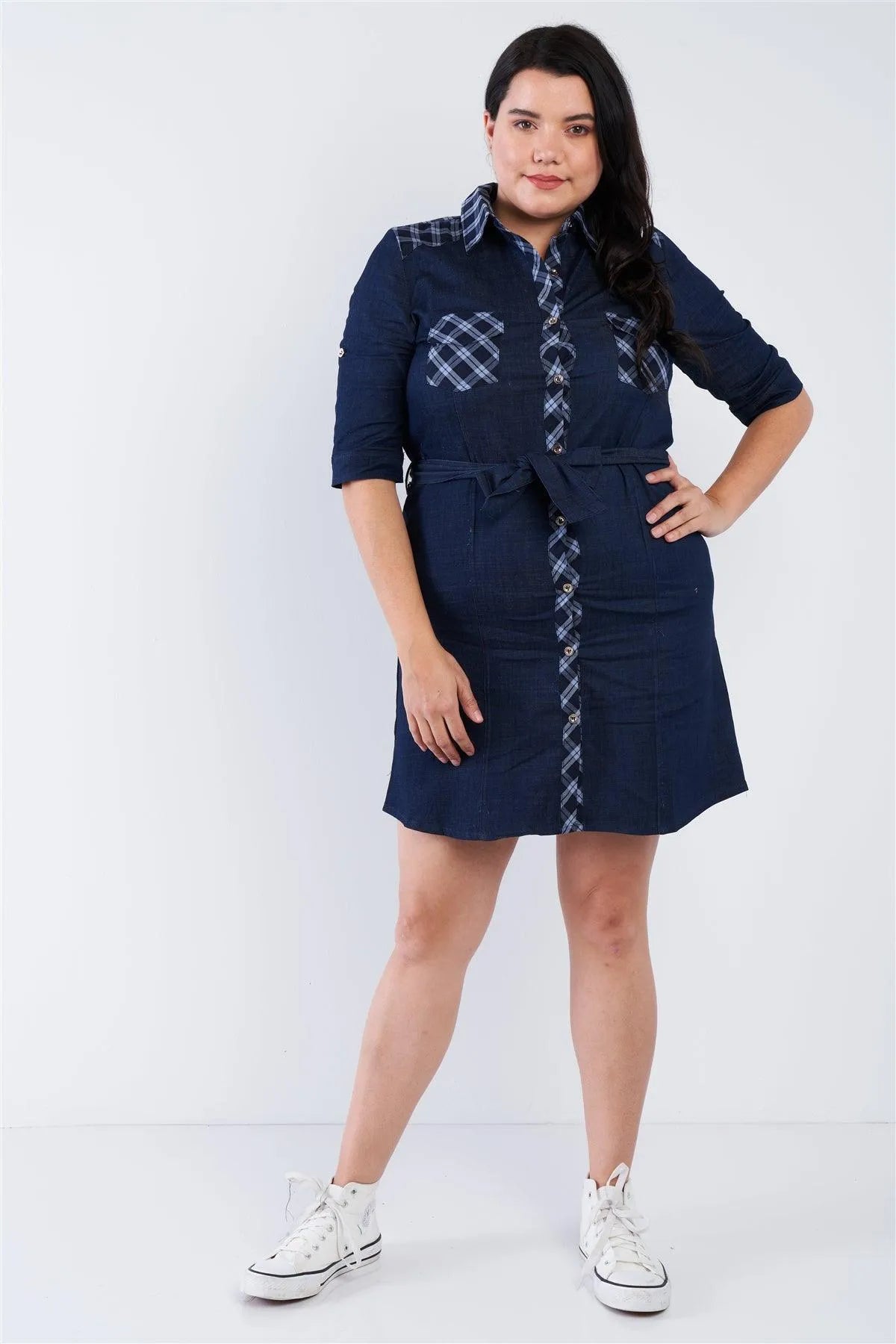 Plus Size Denim Blue Plaid Stripe Trim Front Button Jean Mini Dress /2-2-2