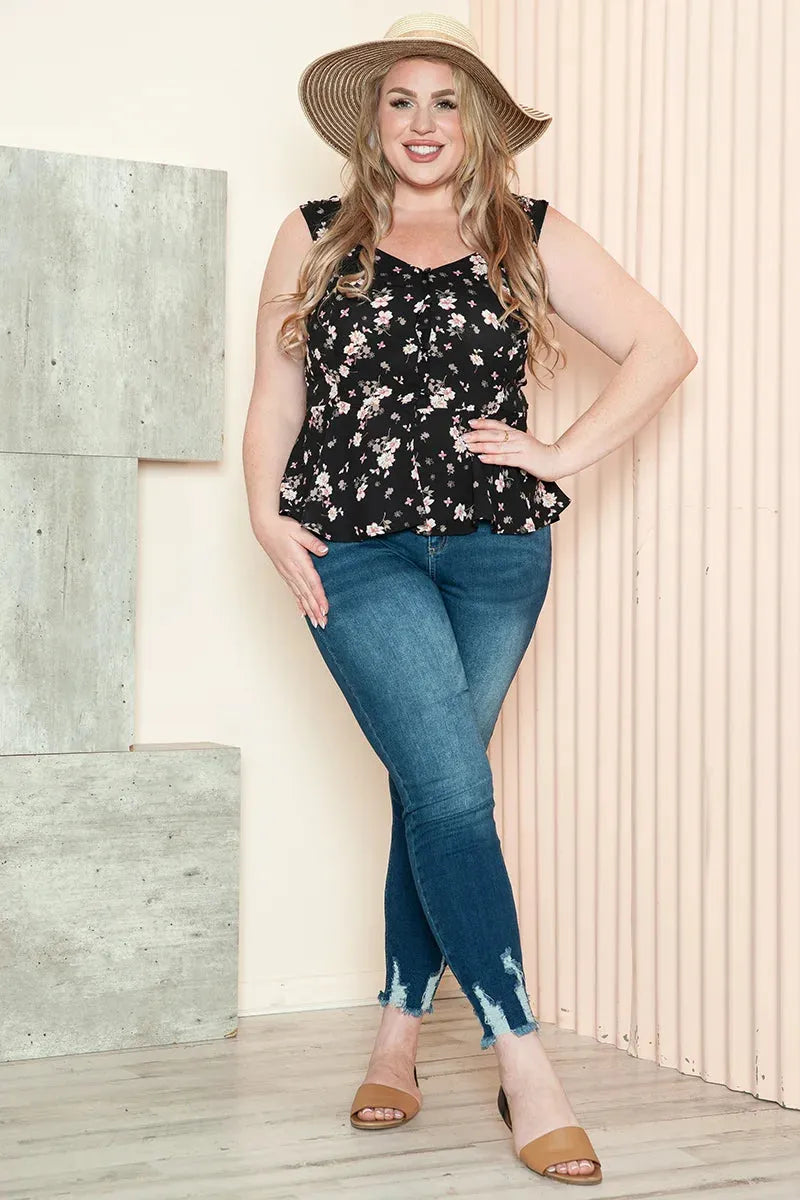 Junior Plus Size Floral Print Sweetheart Neckline Peplum Sleeveless Summer Top