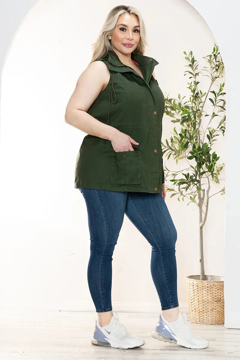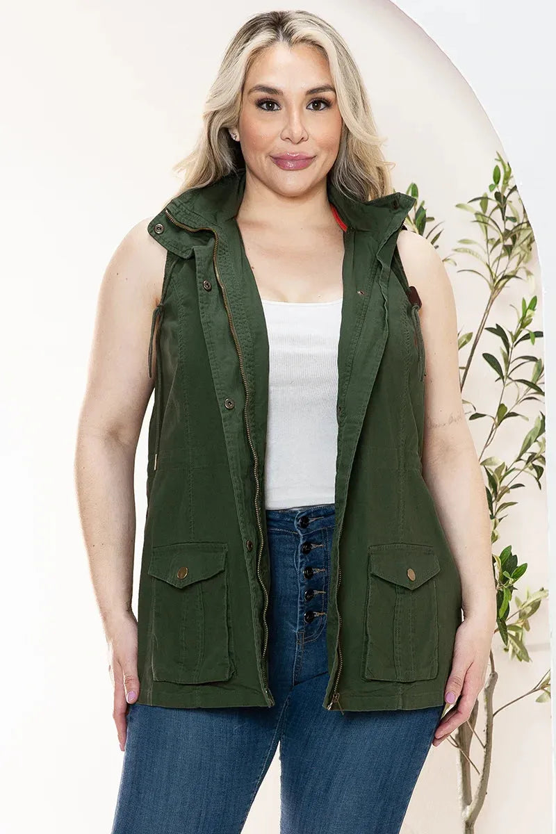 Stay stylish and ready for anything with our versatile Plus Size Hooded Military Utility Jacket Vest. This multifunctional piece features a sleeveless design perfect for layering, combining the sophistication of a utility jacket with the ease of a vest. Whether your customers style it for a casual weekend or a trendy streetwear look, this piece offers endless possibilities for your boutique's fashion-forward clientele.