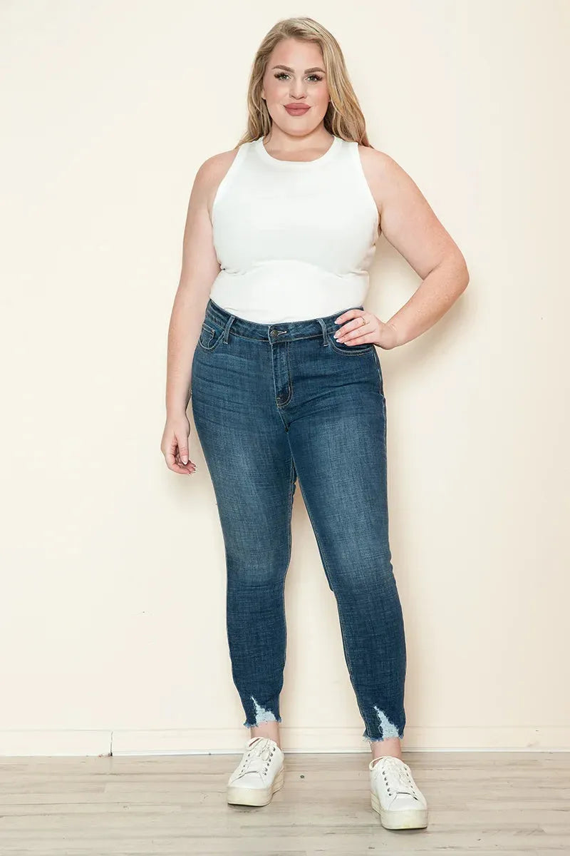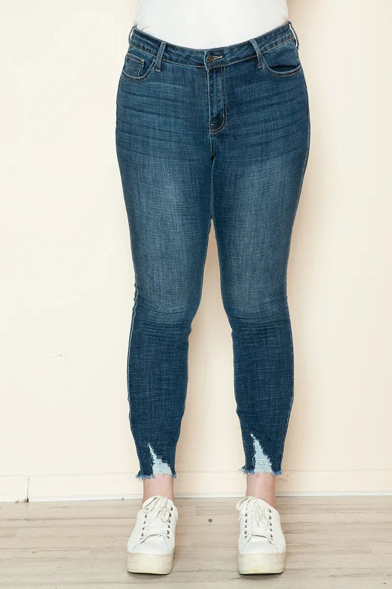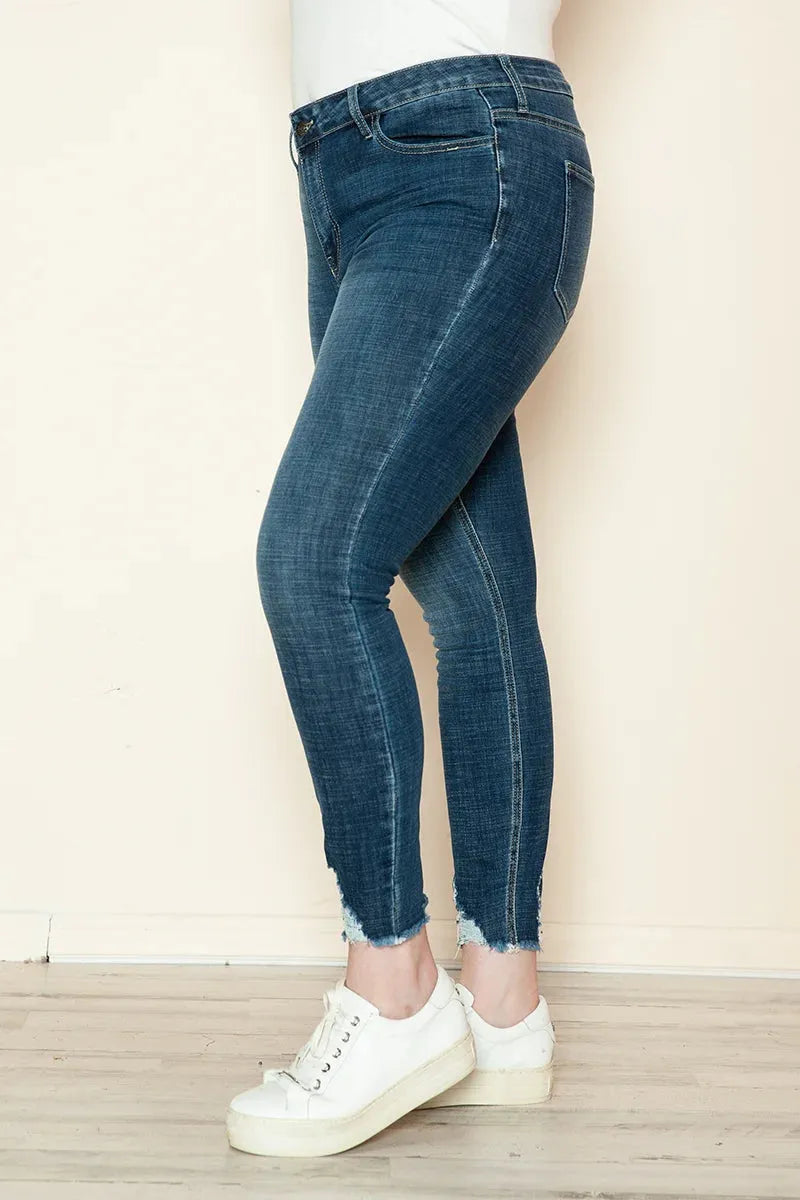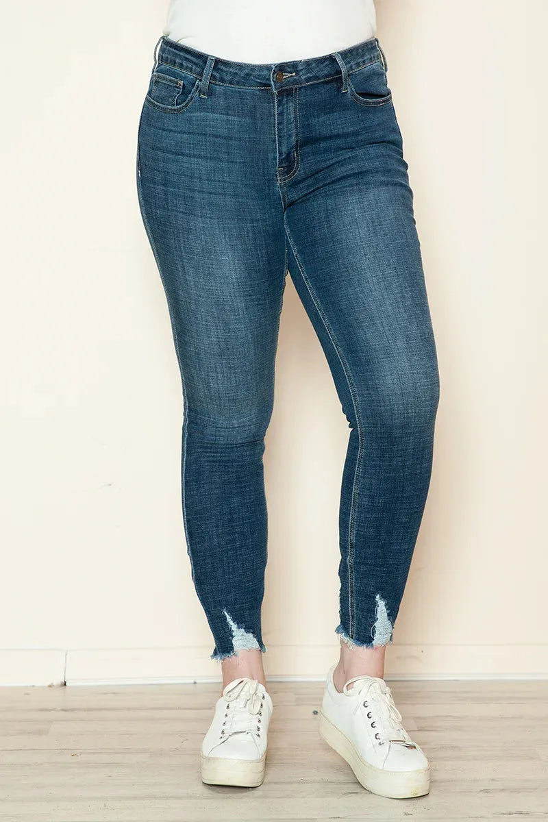Plus Size Medium Wash High Rise Frayed Hem Stretch Skinny Jeans