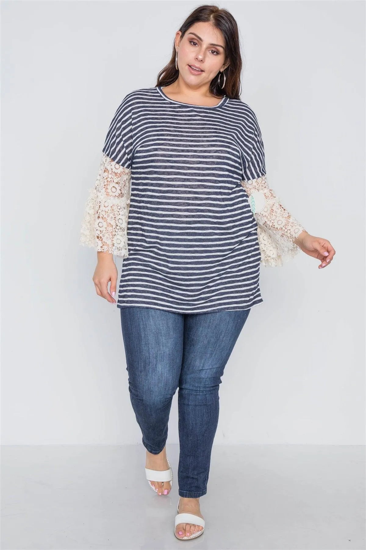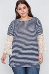 Plus Size Navy Taupe Stripe Lace Sleeves Knit Top /2-2-2