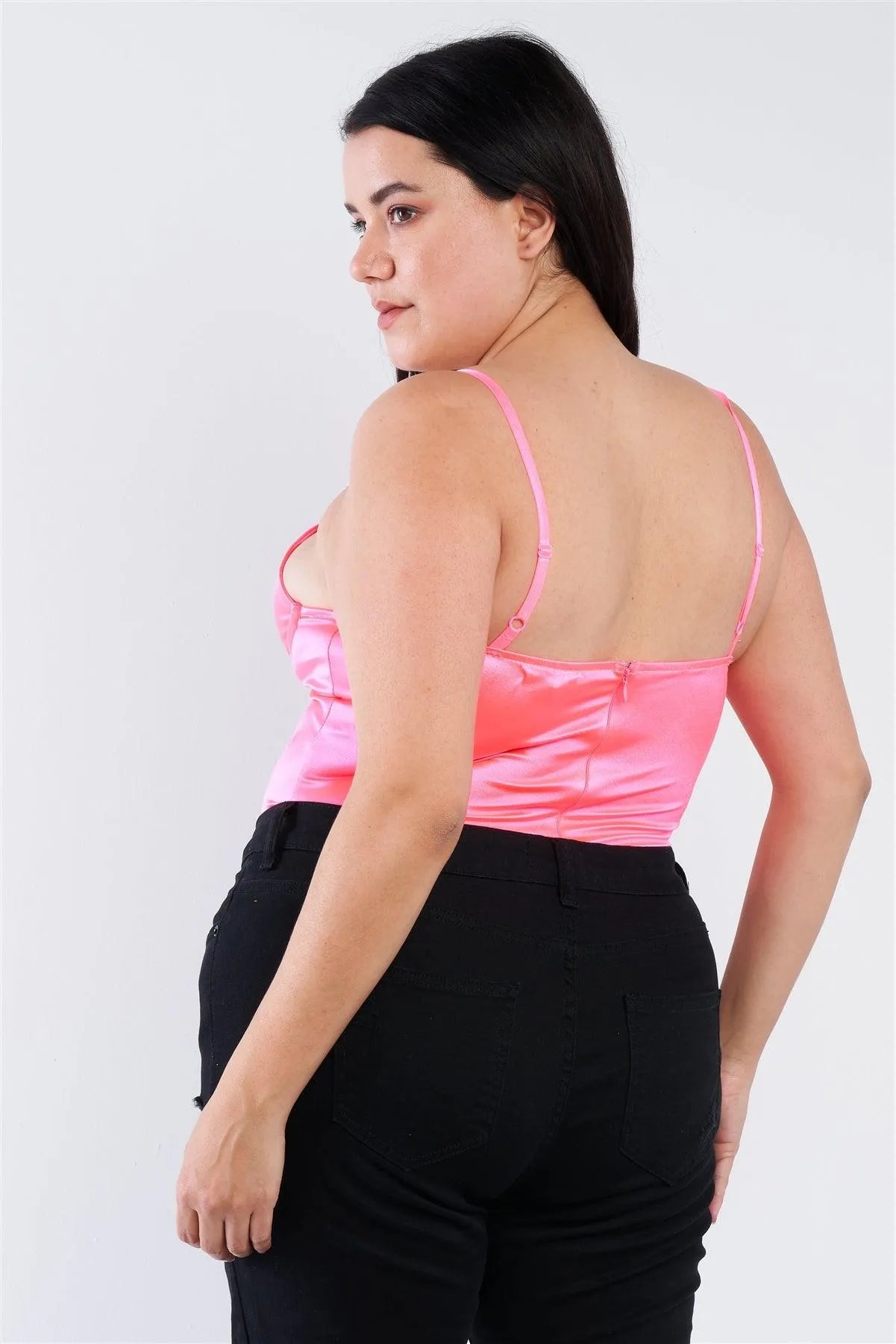 Plus Size Neon Pink Silk Chain Spaghetti Strap High Thong Center Cut Out Bodysuit /2-2-2