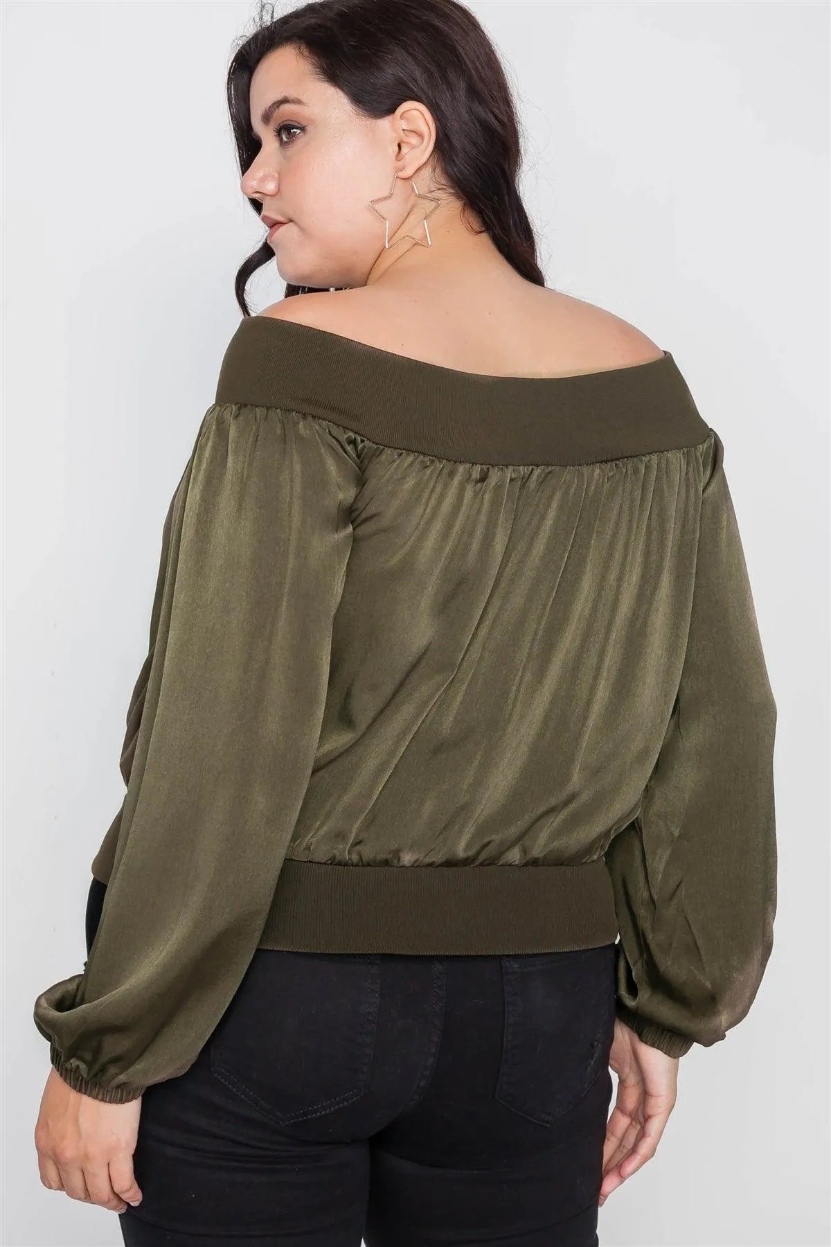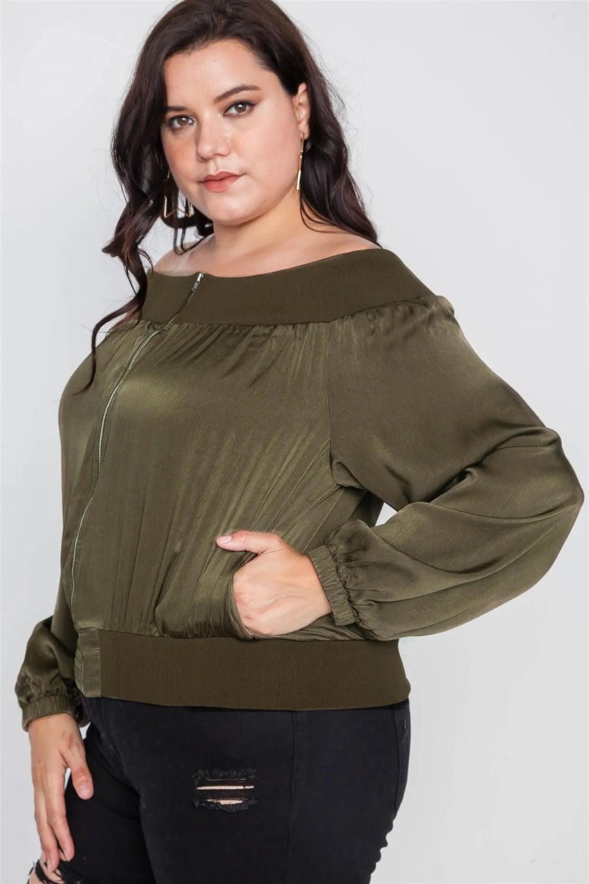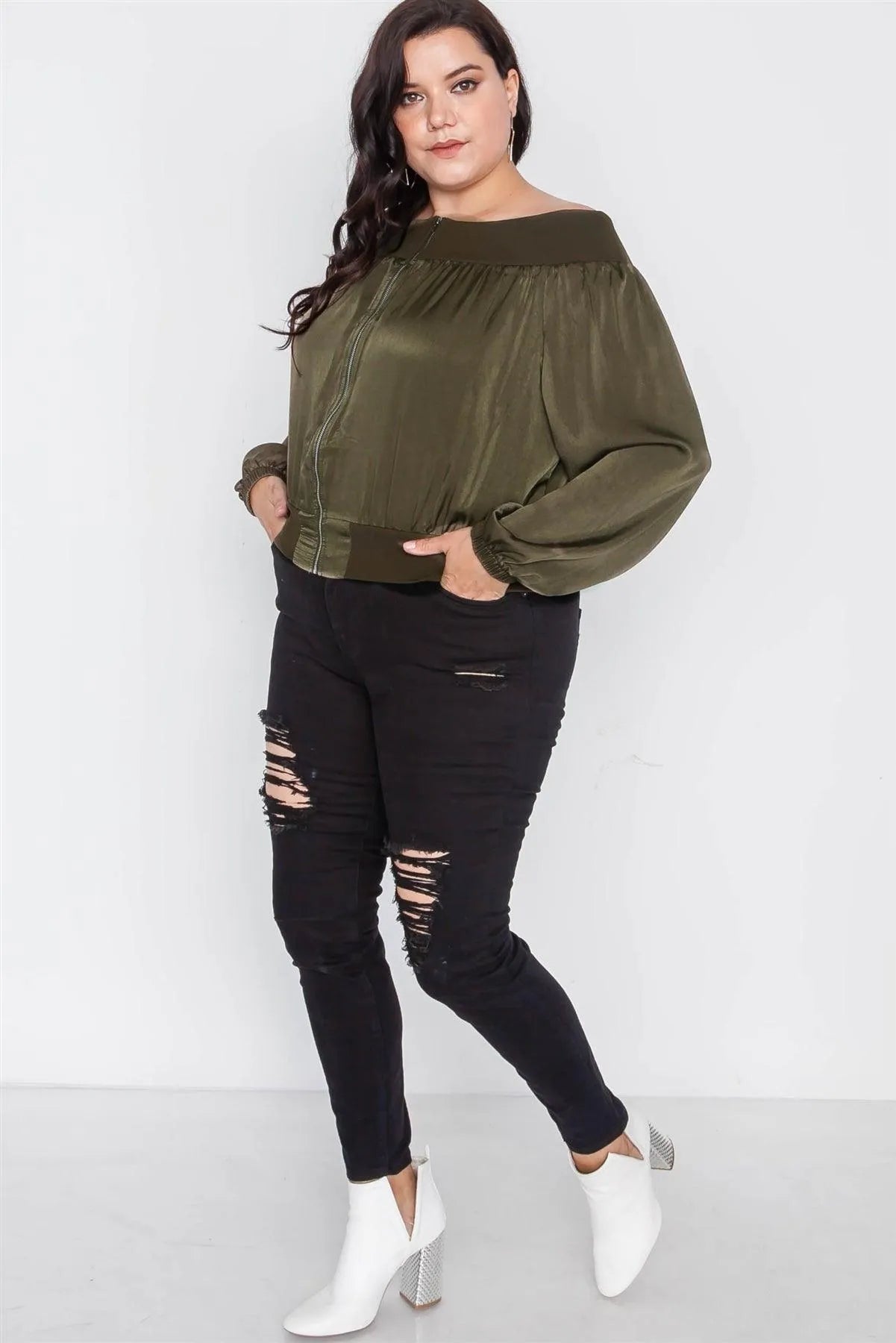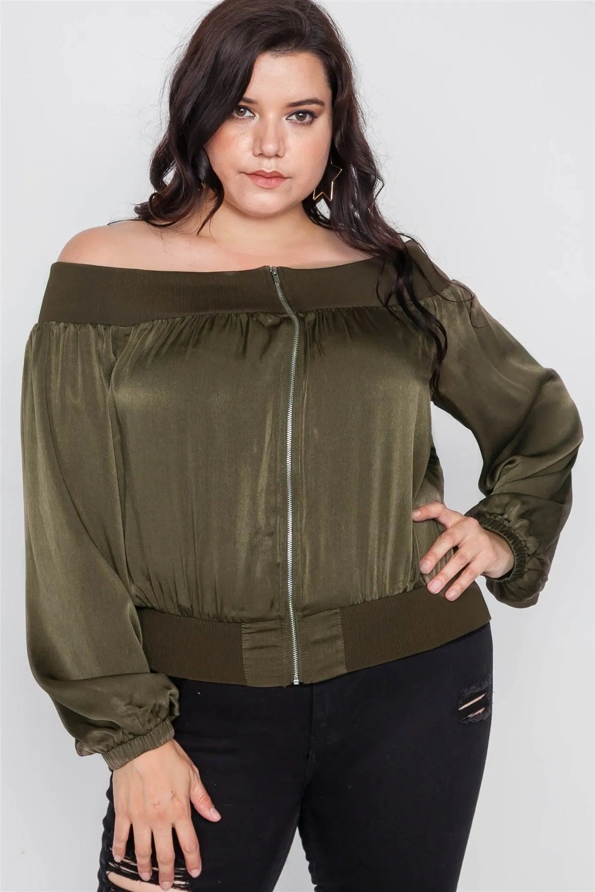 Plus Size Olive Off-The-Shoulder Light Bomber Jacket