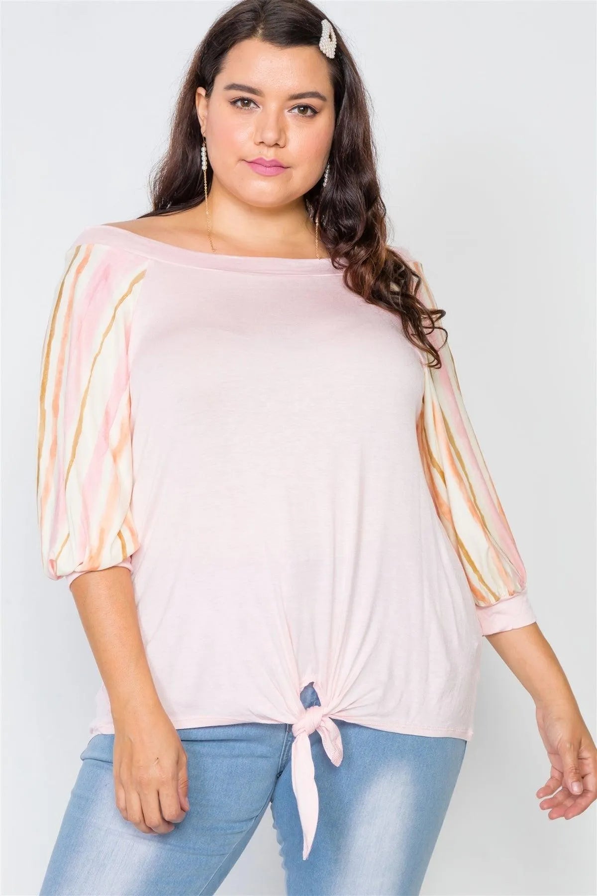 Plus Size Top features: scoop-neck, watercolor stripe design on sleeves, front knot on hem, unlinedModel is 5'6 and wearing a 1X ( Bust: 38DD", Waist: 39", Hips: 50")Item Measurements 1X: Length: 25", Bust: 48" Sleeves: 18"True to size