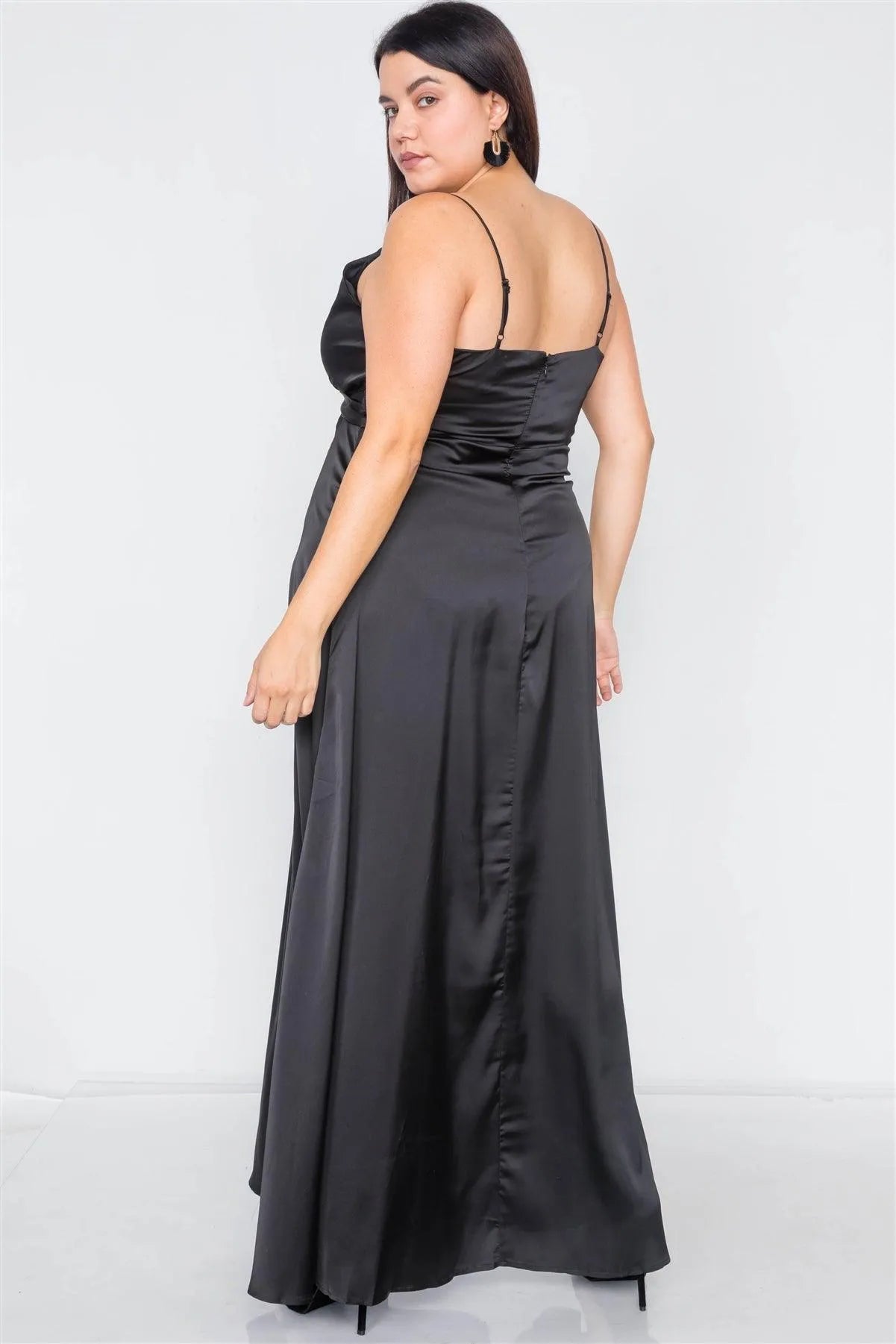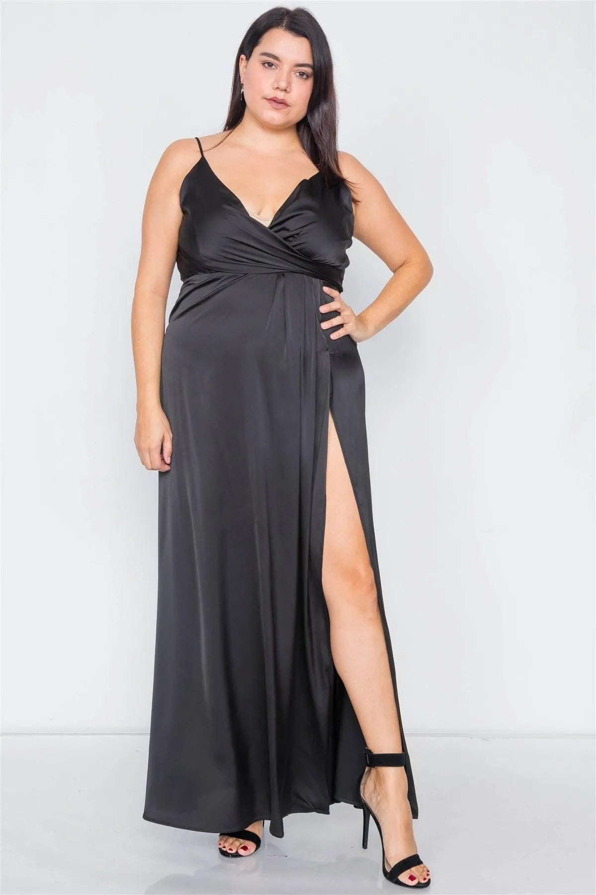 Plus Size Silk Black Pleated Slit Classic Maxi Dress