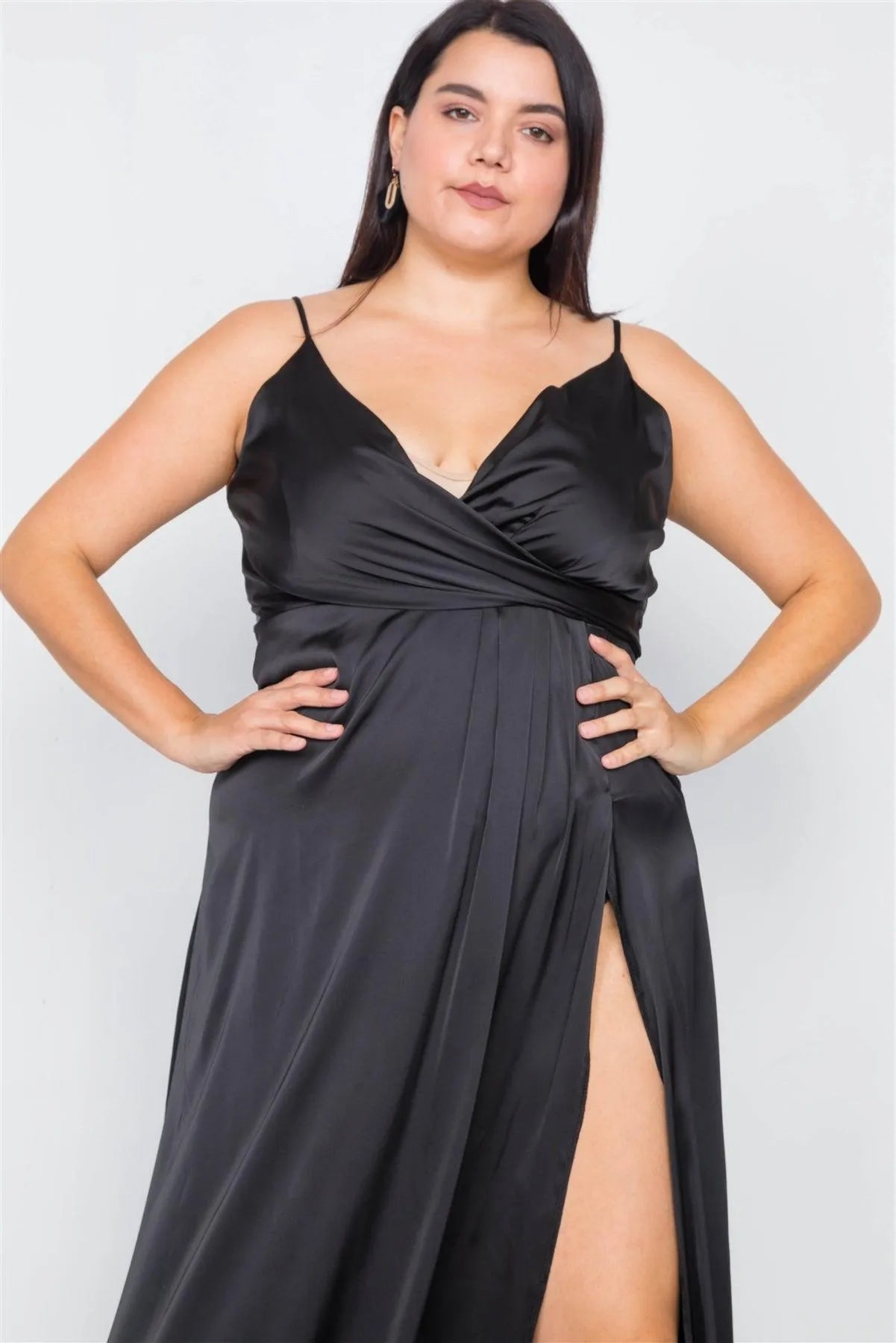 Dress features: silk, maxi length, classy, cocktail dress, adjustable cami straps, v-neckline, drape front detail, pleated maxi slit, hidden back zipper and clasp closure, unlined, slight stretch.Model is 5'6 and wearing a 1X ( Bust: 38DD", Waist: 39", Hips: 50")Item Measurements: Length: 64", Bust 40"True to size