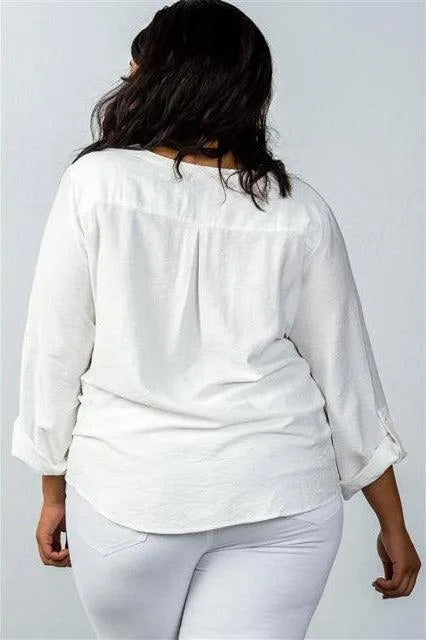 Junior Junior Plus Size Blouse features: long sleeves, roll tab sleeve, crew neck, hidden front button closure, relaxed fit, solid.