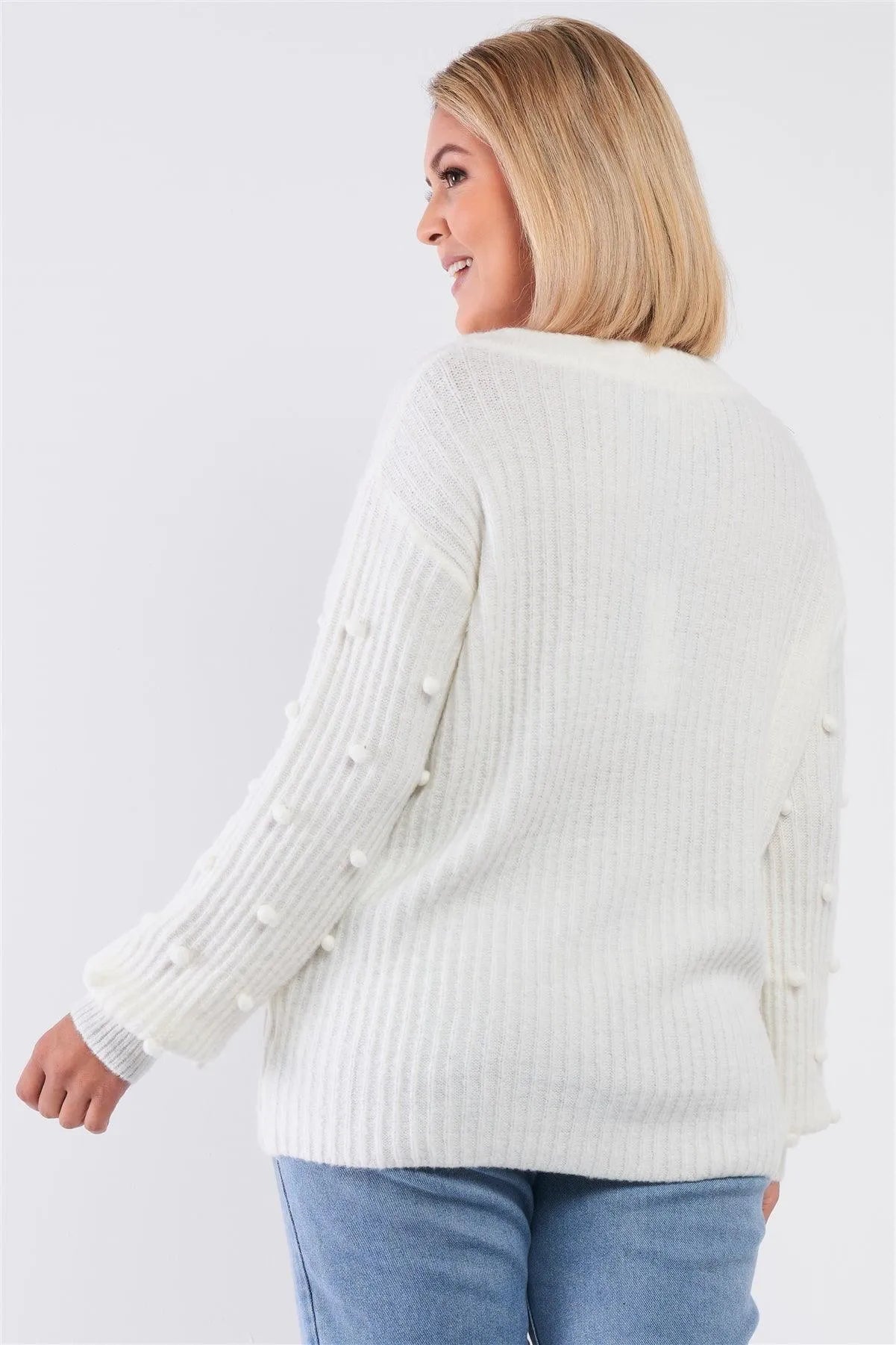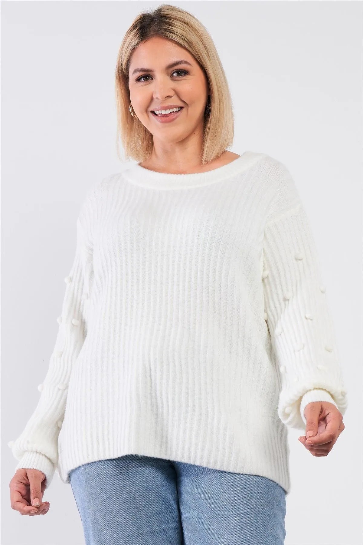 Junior Plus Cozy White Crew Neckline Long Beads Detail Ballon Sleeve Sweater /2-2-1-1