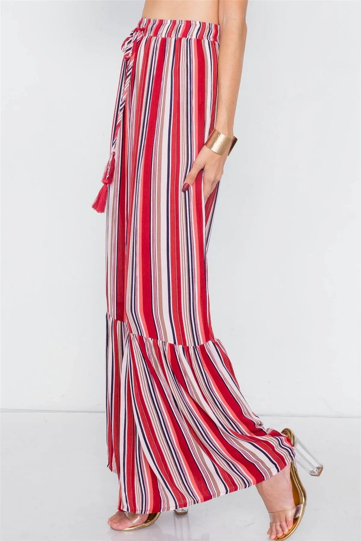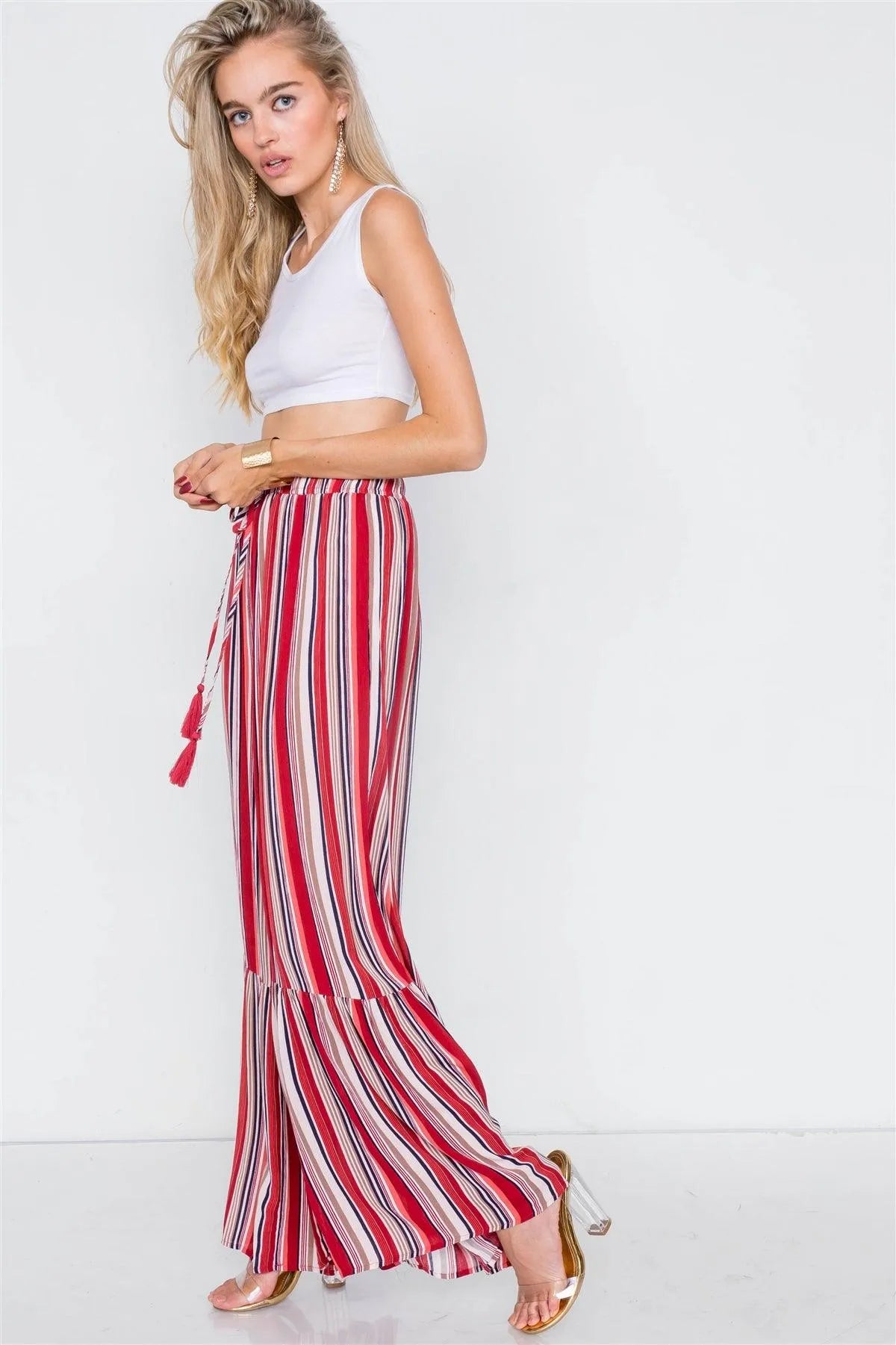 Pant features: elastic waist, flare leg, ankle length, self tie tassel waist, multi stripe design, unlined.Model is 5'8 wearing a size Small ( Waist: 26", Bust: 32B, Hips: 34")Item Measurements: Length: 44", Waist, 24"True to sizeAlso available in Mustard