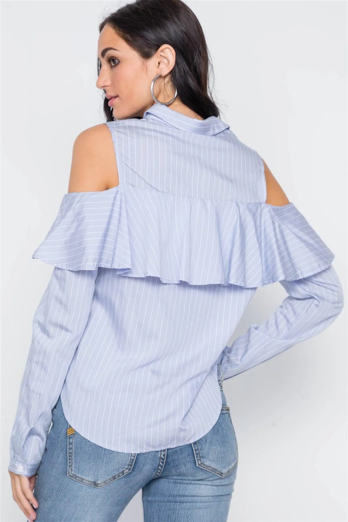 Powder Blue Stripe Cold Shoulder Button Down Top /3-2-1