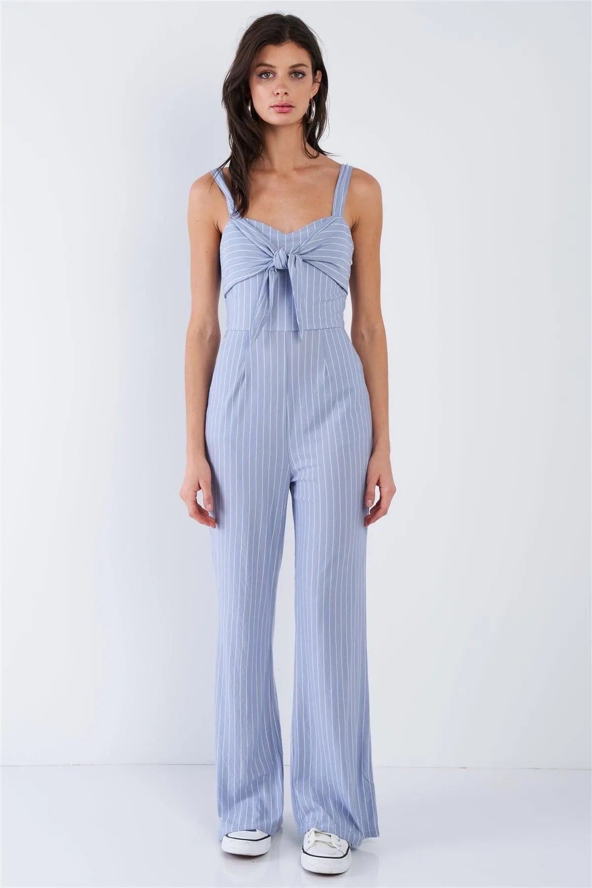Jumpsuit Features: white and blue stripes, front and back self tie bow, hidden side zipper closure, wide leg, side pockets, maxi length, casual, festival, tank straps, lined, stretchy. Model is 5'9 wearing a size Small ( Waist: 23.5", Bust: 32B, Hips: 36")Item Measurements: Length: 60" , Bust: 30"Item comes pre-packed with hang tagsTrue to size