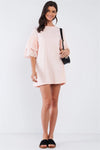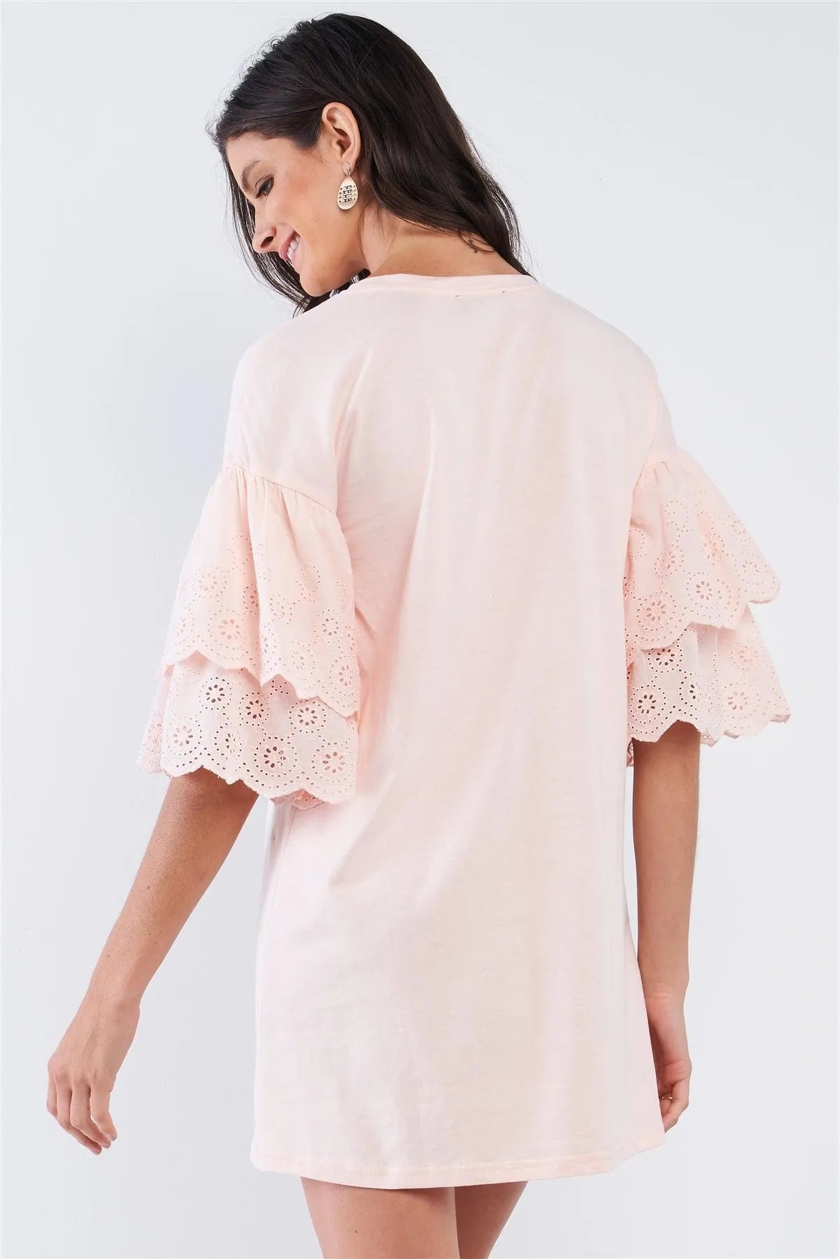 Powder Pink Cotton Loose Fit Crew-Neck Tunic Mini Dress With Layered Crochet Embroidered Scalloped Hem Sleeve /1-3-2
