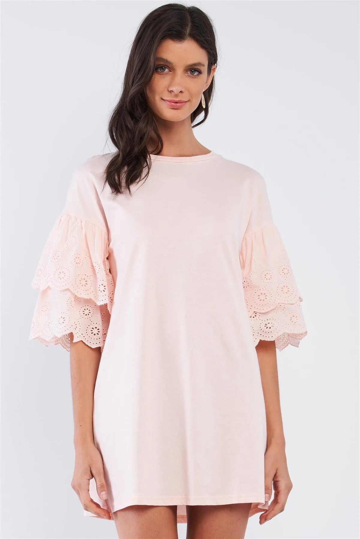 🖤 Item features: Light pink, cotton, simplistic T-shirt tunic cut, crew neckline, accentuated layered crochet embroidered short sleeves with scalloped hem, loose fitting, unlined, semi-stretch, casual, cute, girly, summer vibe, breathable, light