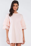 Powder Pink Cotton Loose Fit Crew-Neck Tunic Mini Dress With Layered Crochet Embroidered Scalloped Hem Sleeve /1-2-2-1