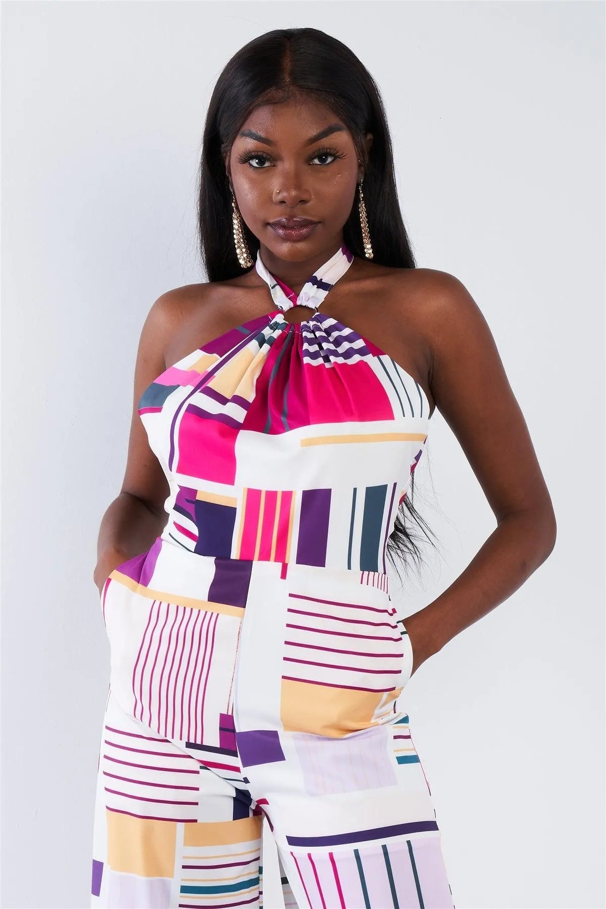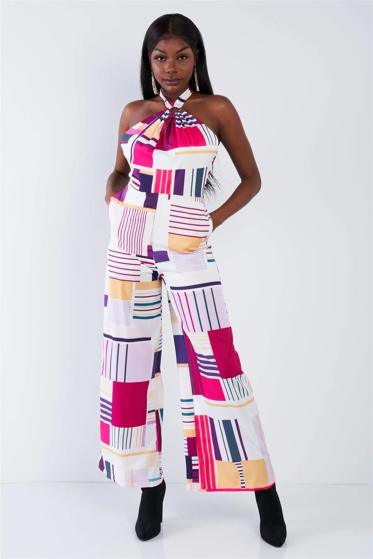 Jumpsuit Features: multi print, halter neck, open back, wide leg, self-tie back, lined, spring, summer, boho, unlined, slight stretch.Model is 5'8 and wearing a Small ( Bust: 34D", Waist: 25", Hips: 36")Item Measurements: Length: 57" , Bust: 32" Item comes pre-packed with hang tagsTrue to size Also available in White Multi