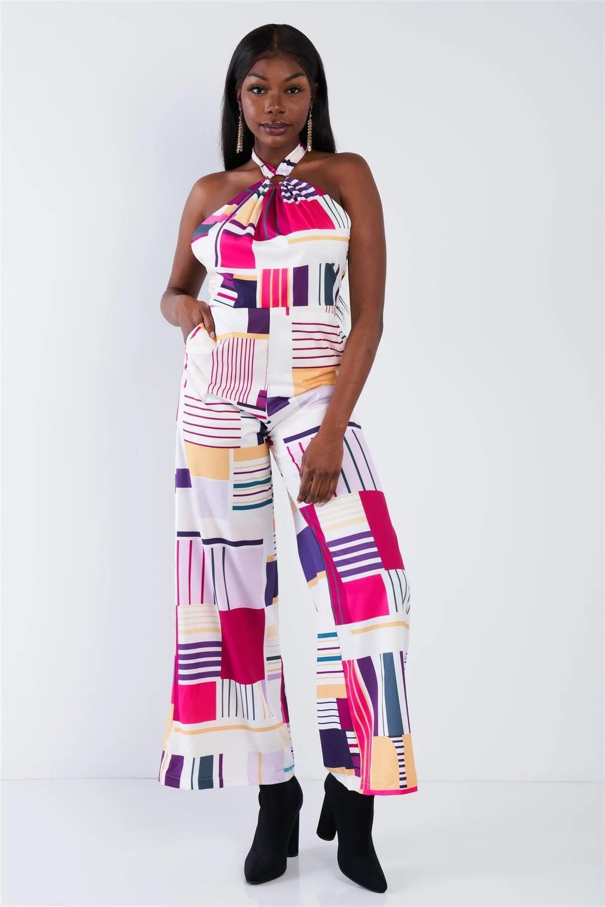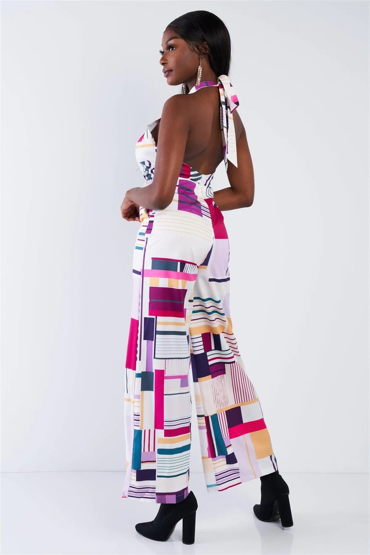 Purple Multi Halter Neck Self Tie Open Back Wide Leg Jumpsuit /1-2-2