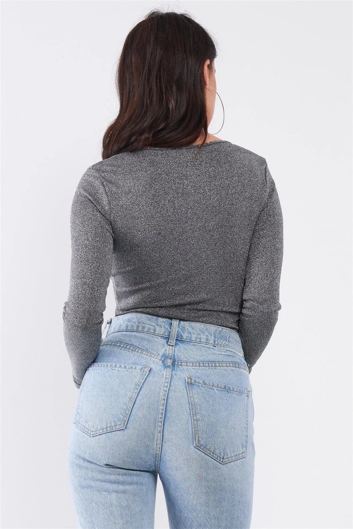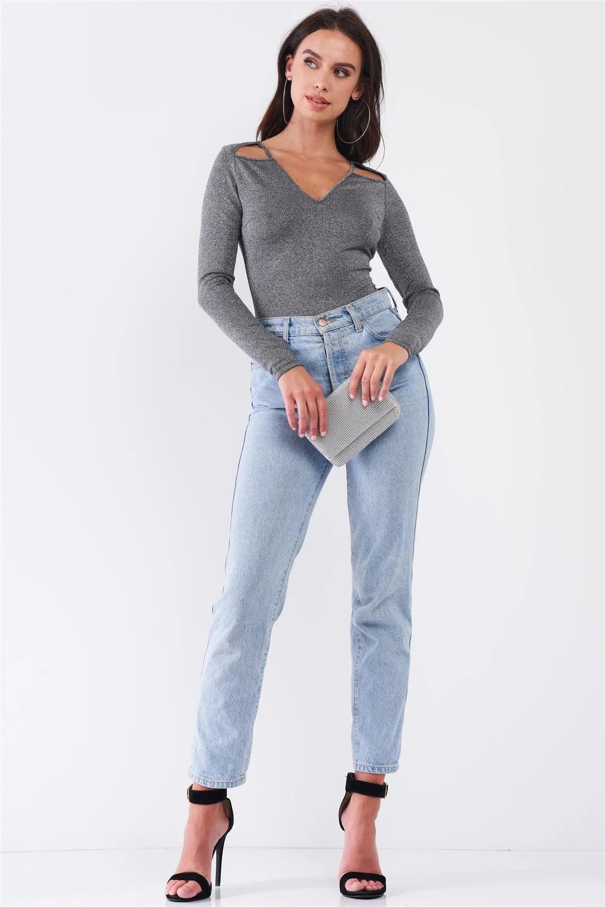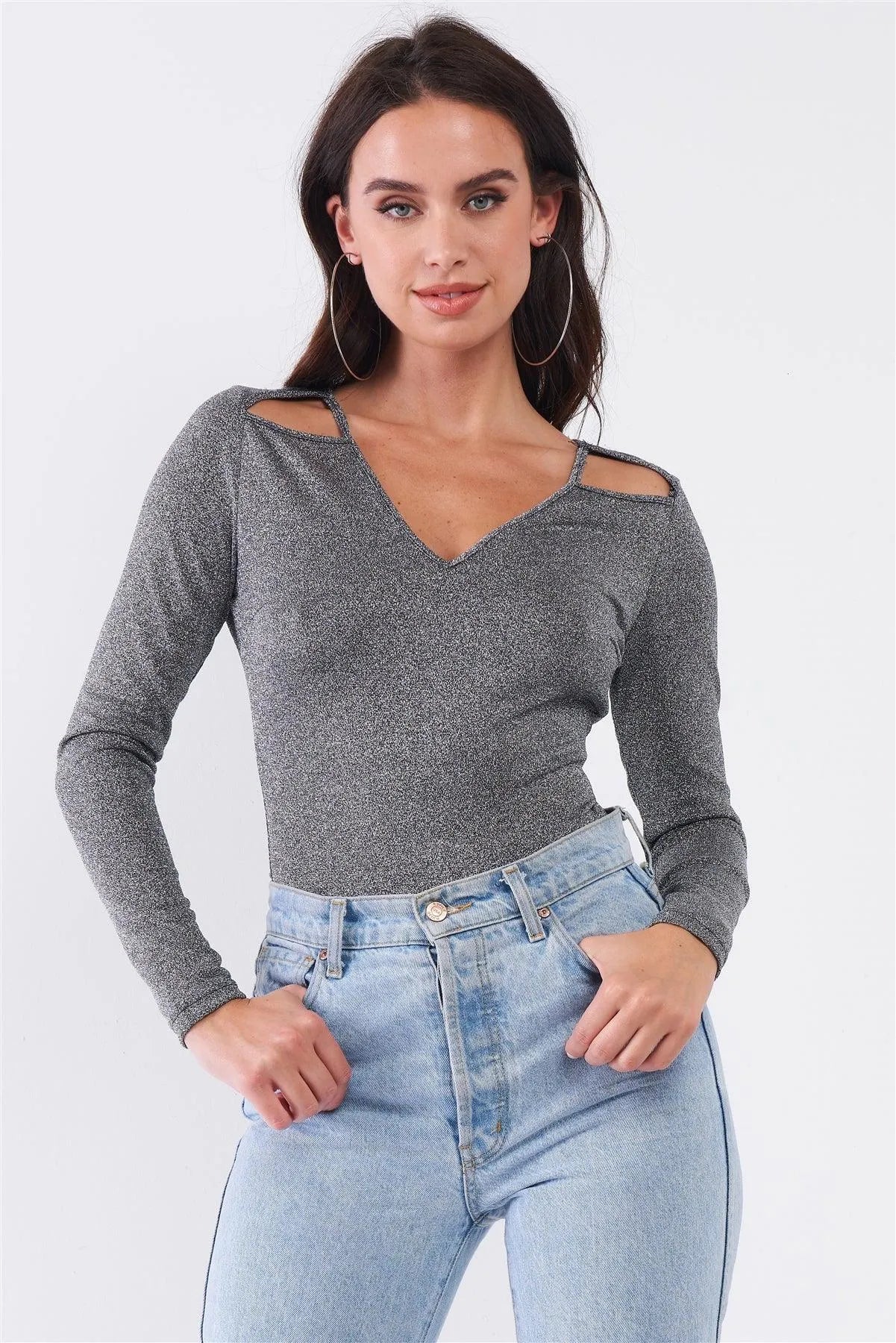 Quick Silver Glittery V-Neck Long Sleeve Cut-Out Shoulder Detail Bodysuit /3-2-1
