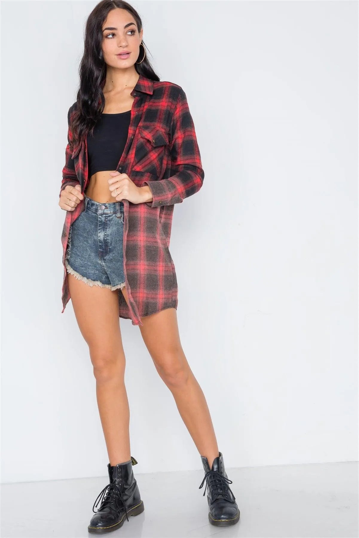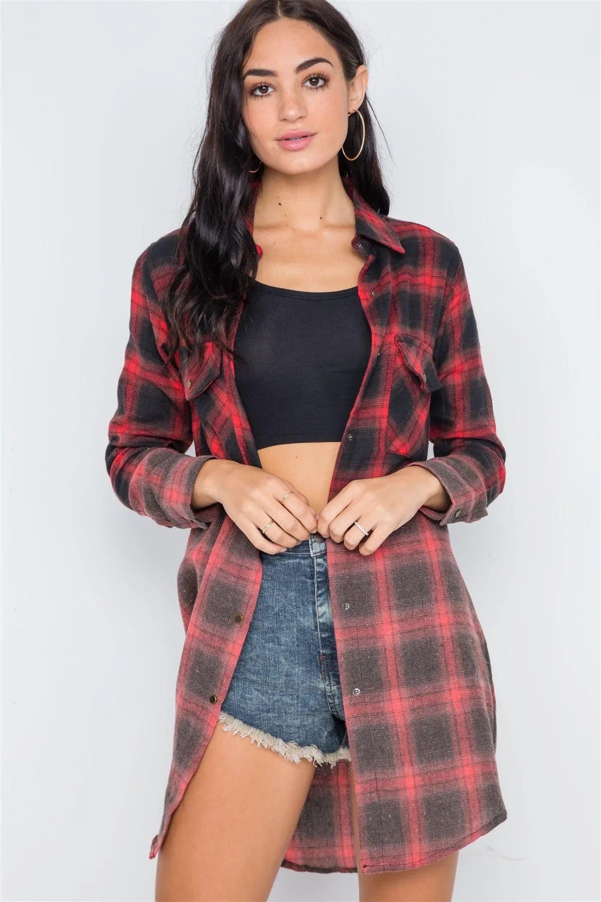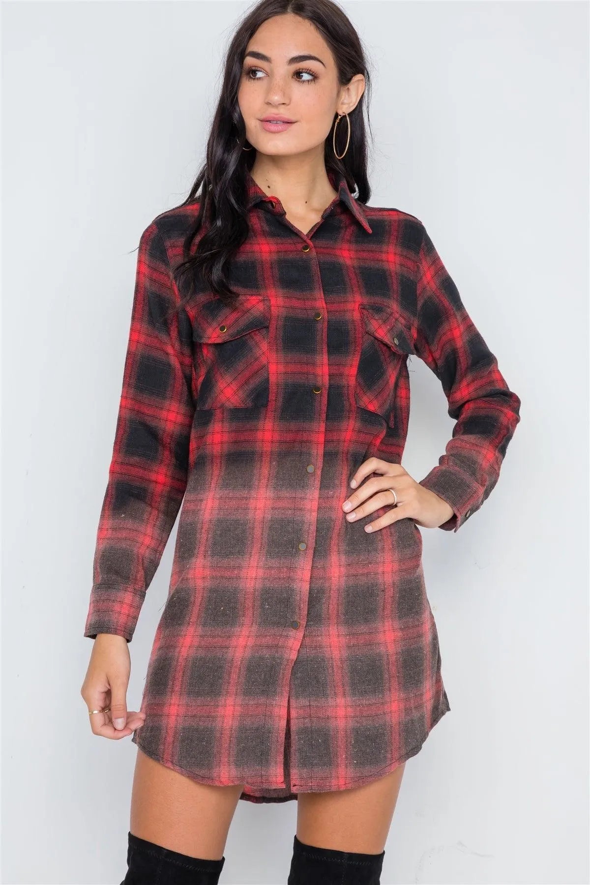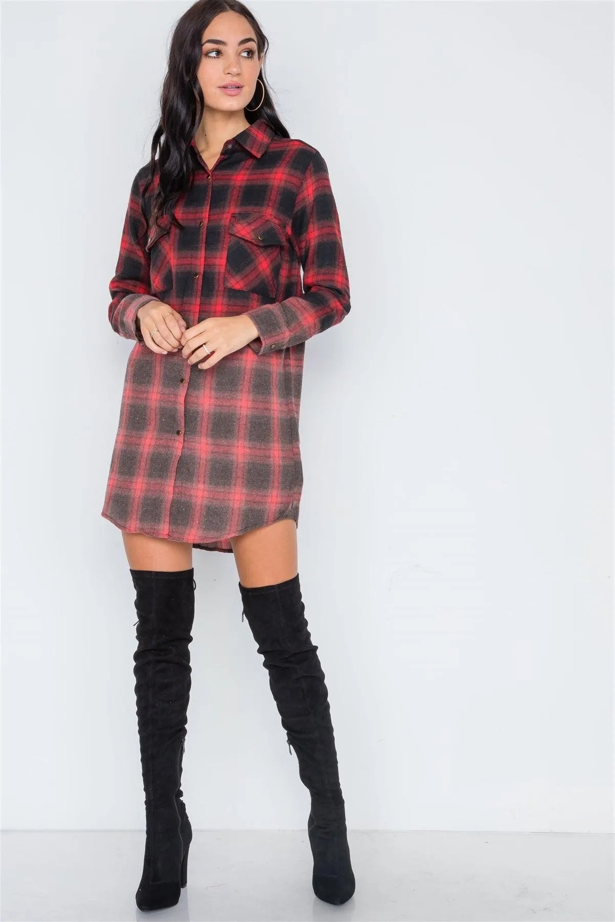 Red Black Plaid Flannel Long Sleeve Shirt Dress /3-2-1