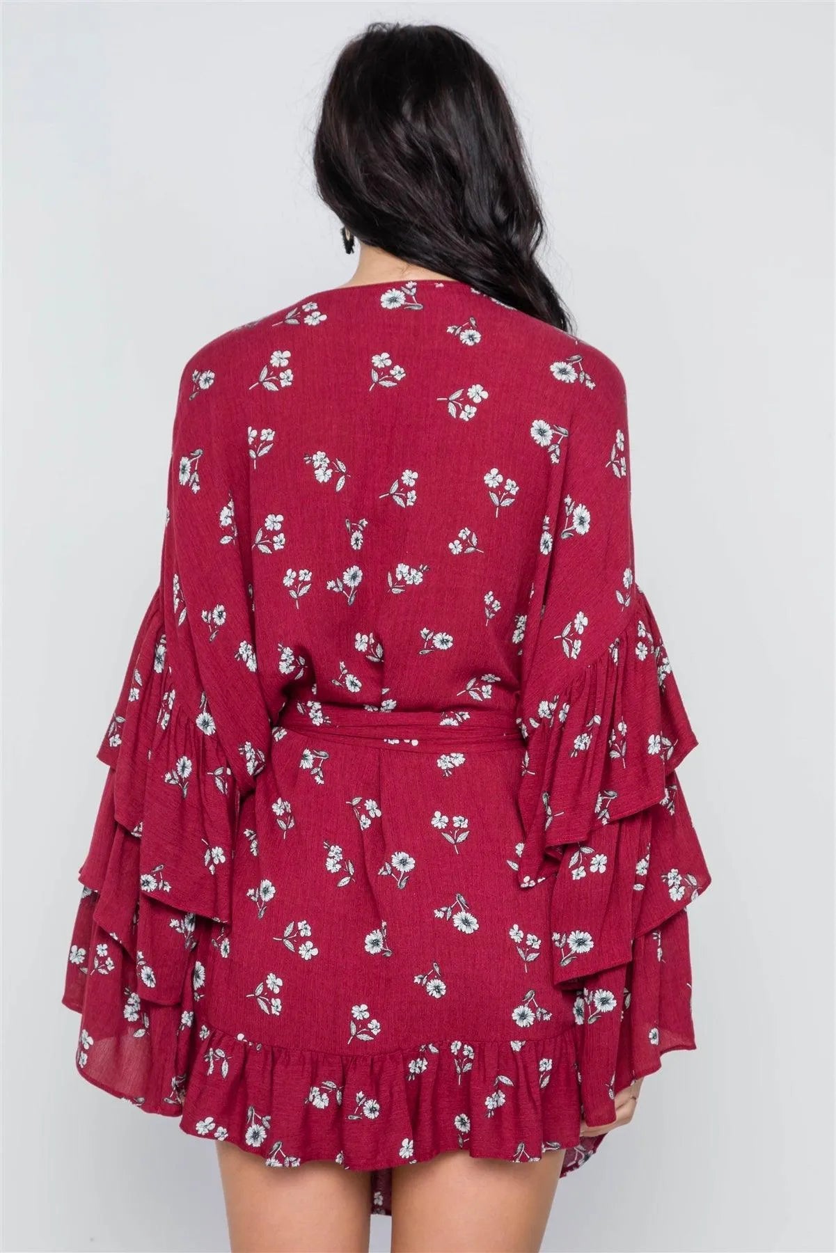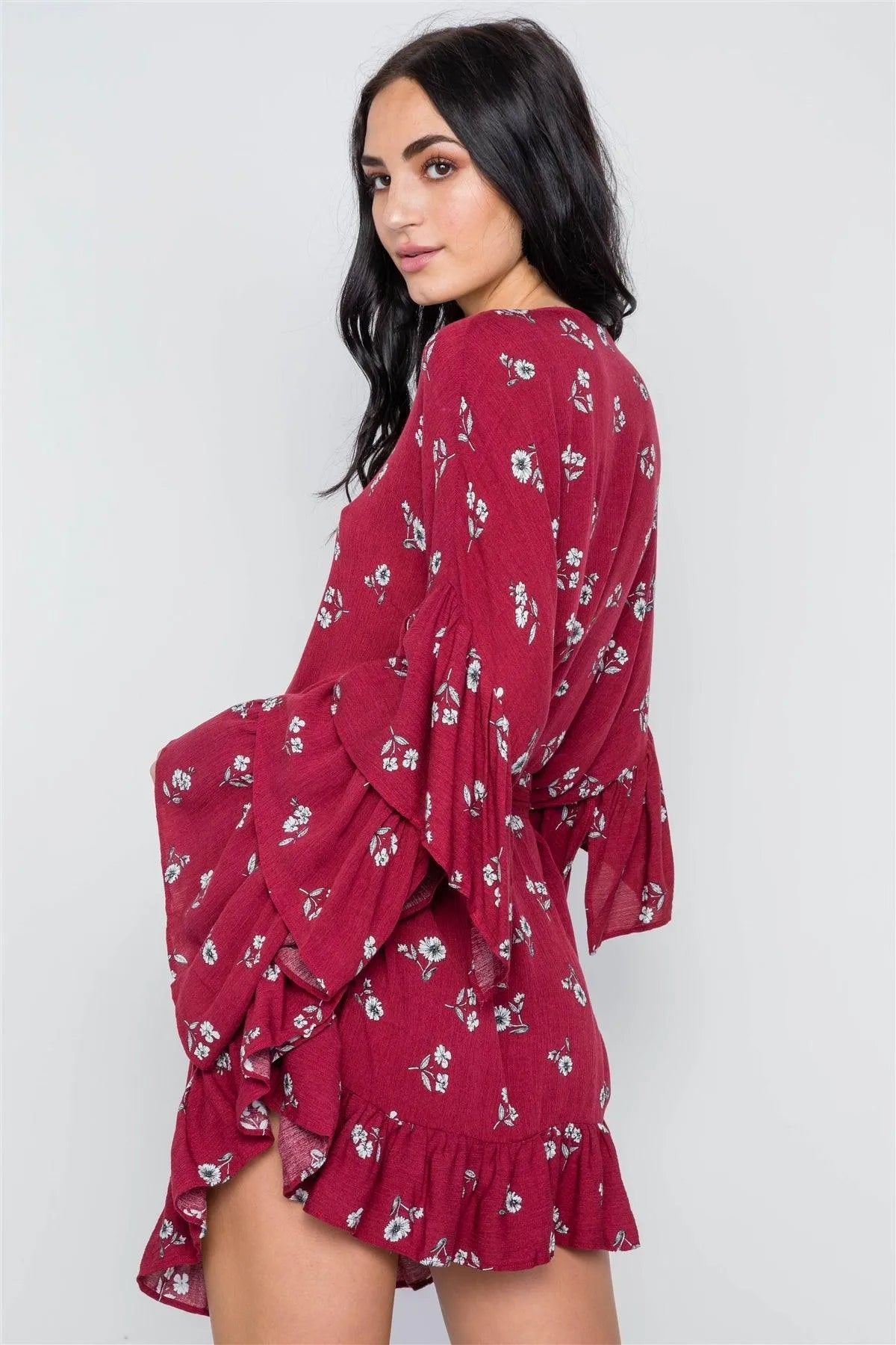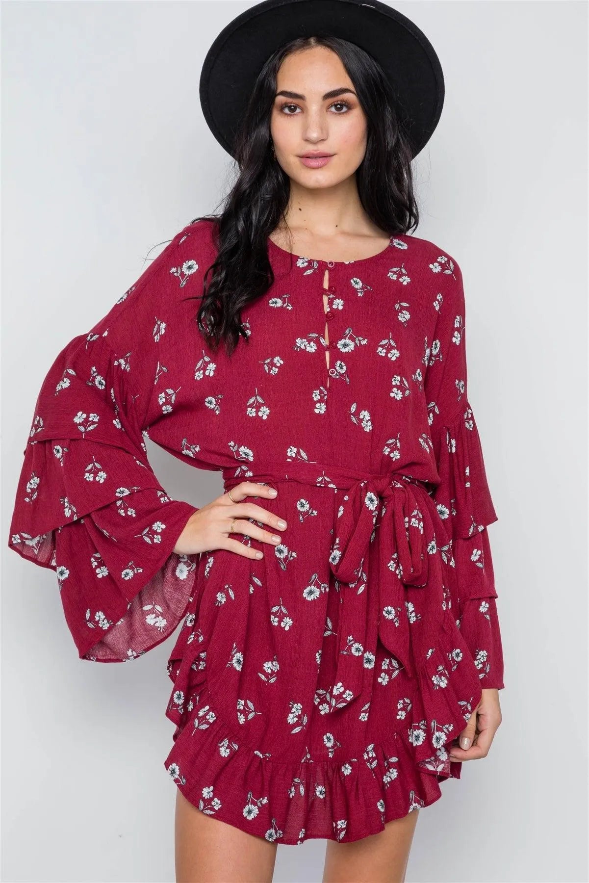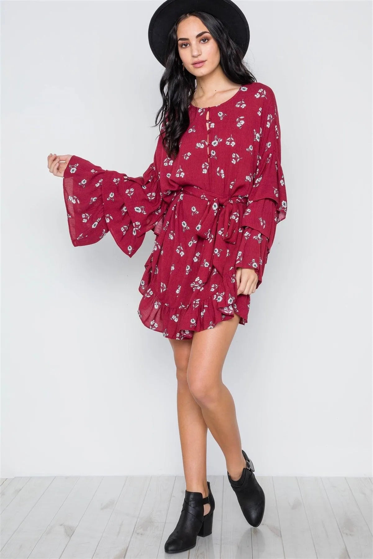 Red Burgundy Floral Print Long Bell Sleeves Dress /2-2-1