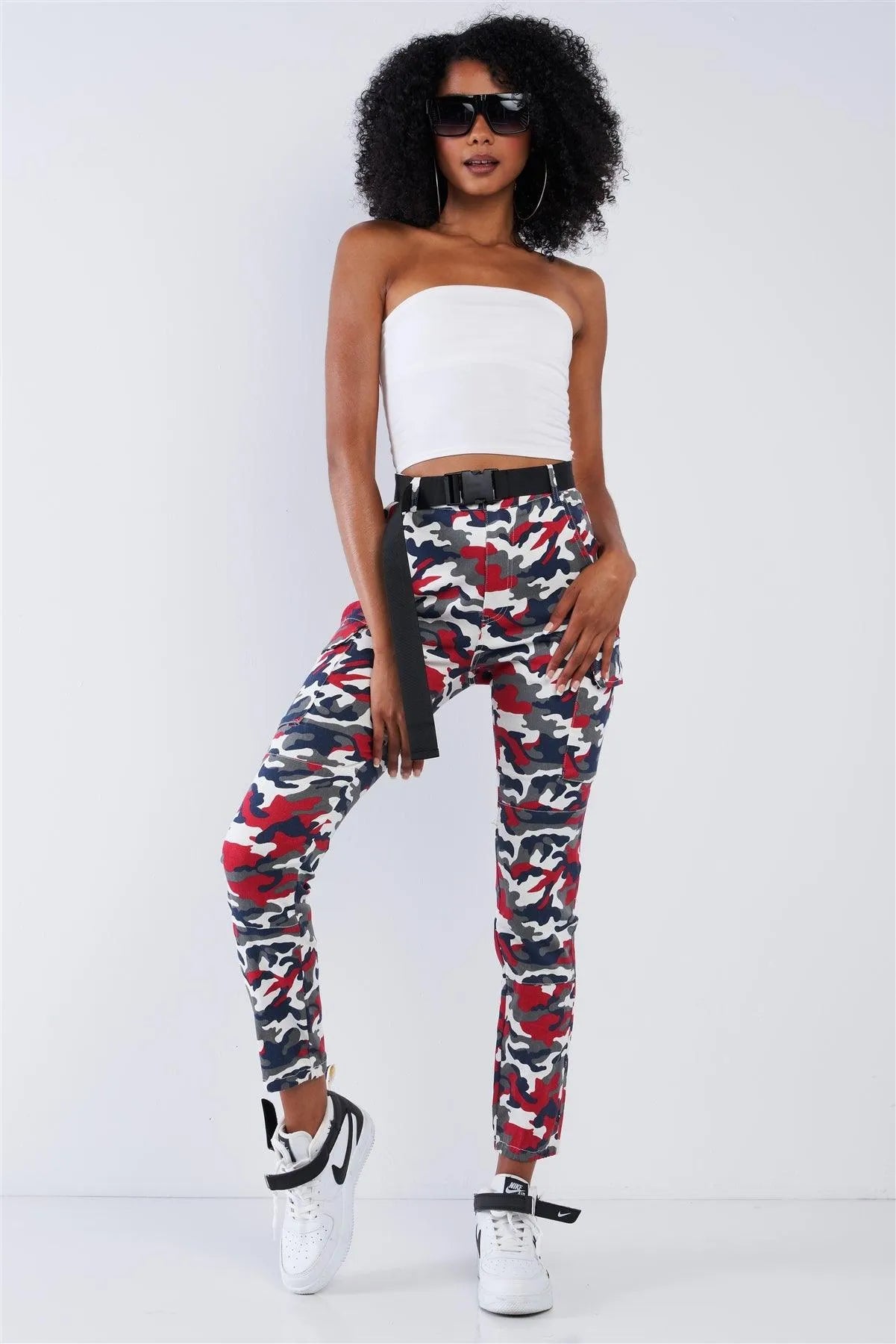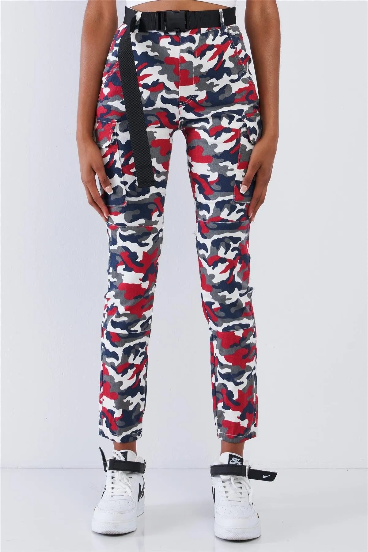 🖤 Item features: Camouflage print, red, white, grey, navy, high waisted, semi-stretchy, elastic leg hem, unlined, front pockets, two big cargo pockets, silver button closure, fly zip, black plastic quick release seat belt.