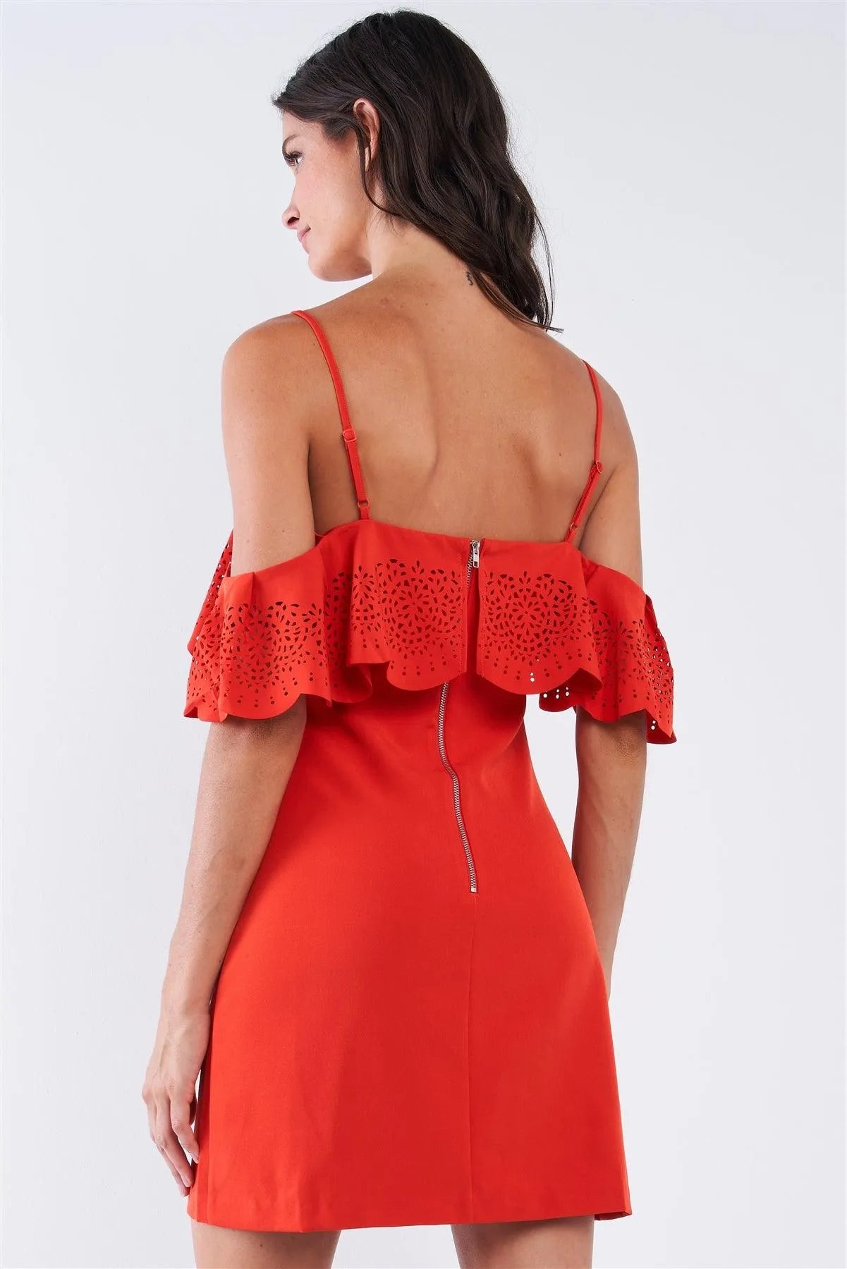Tomato Red Cocktail V-Neck Crochet Ruffle Off-The-Shoulder Hem Tube Mini Dress