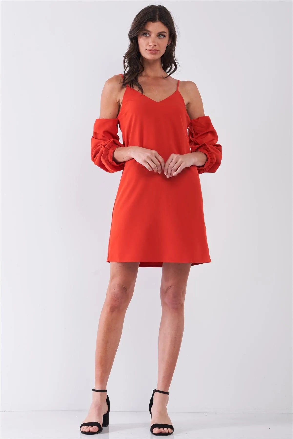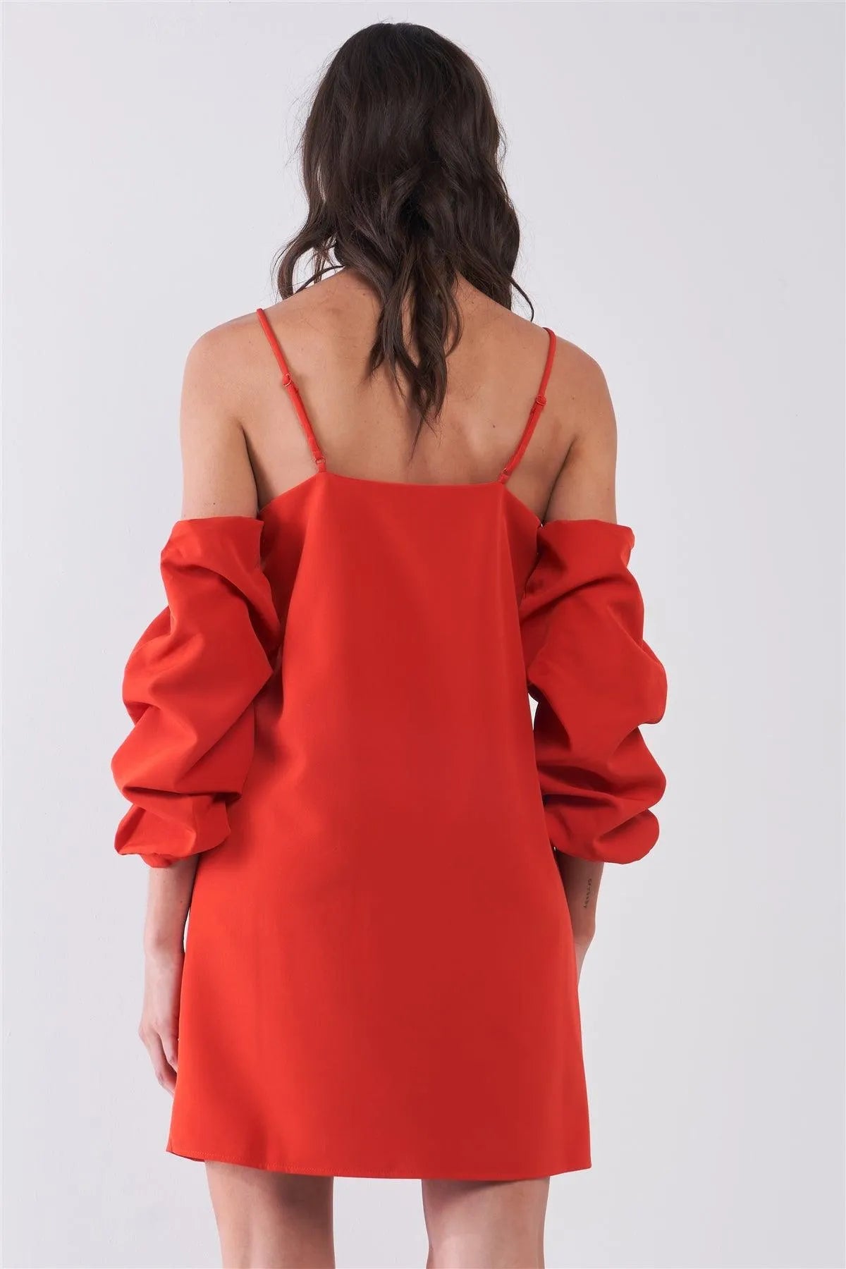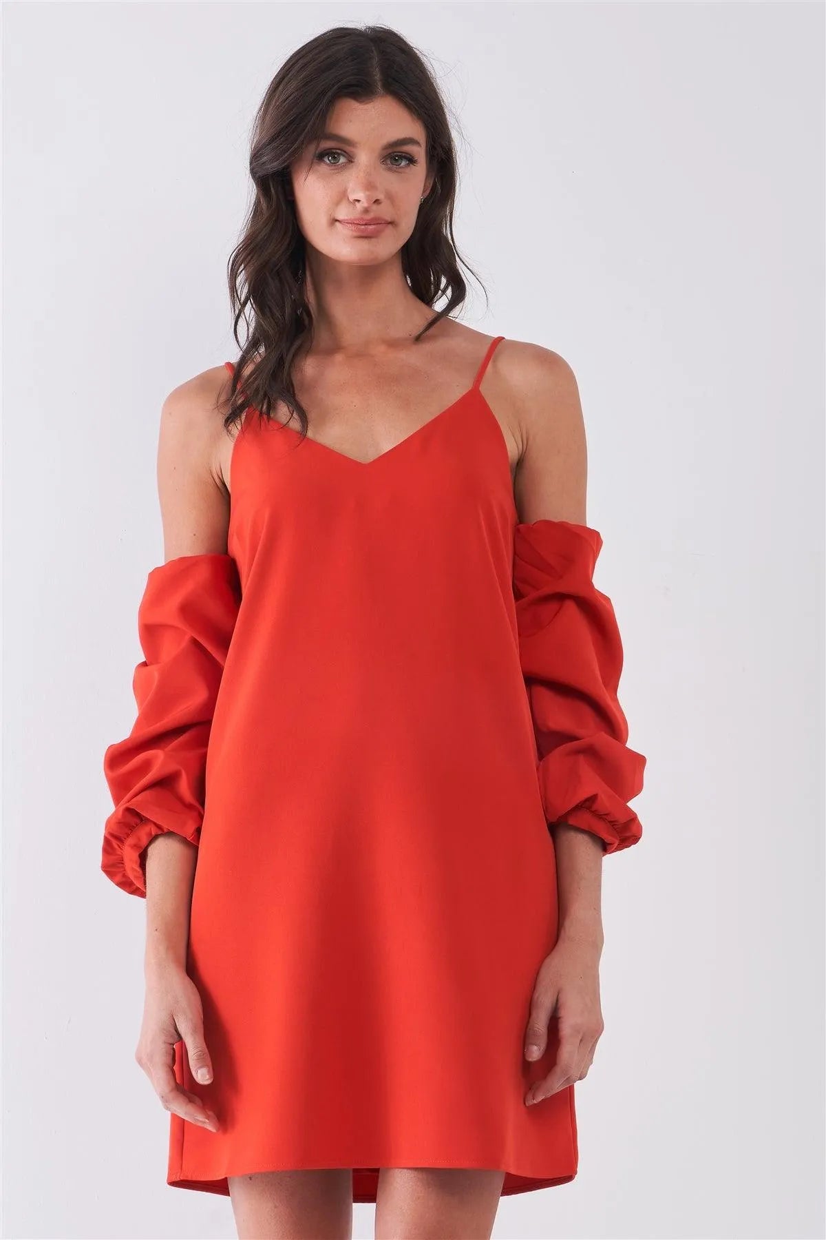 Crimson Red Cold-Shoulder Gathered Sleeve Detail V-Neck Relaxed Mini Dress /1-2-2-1