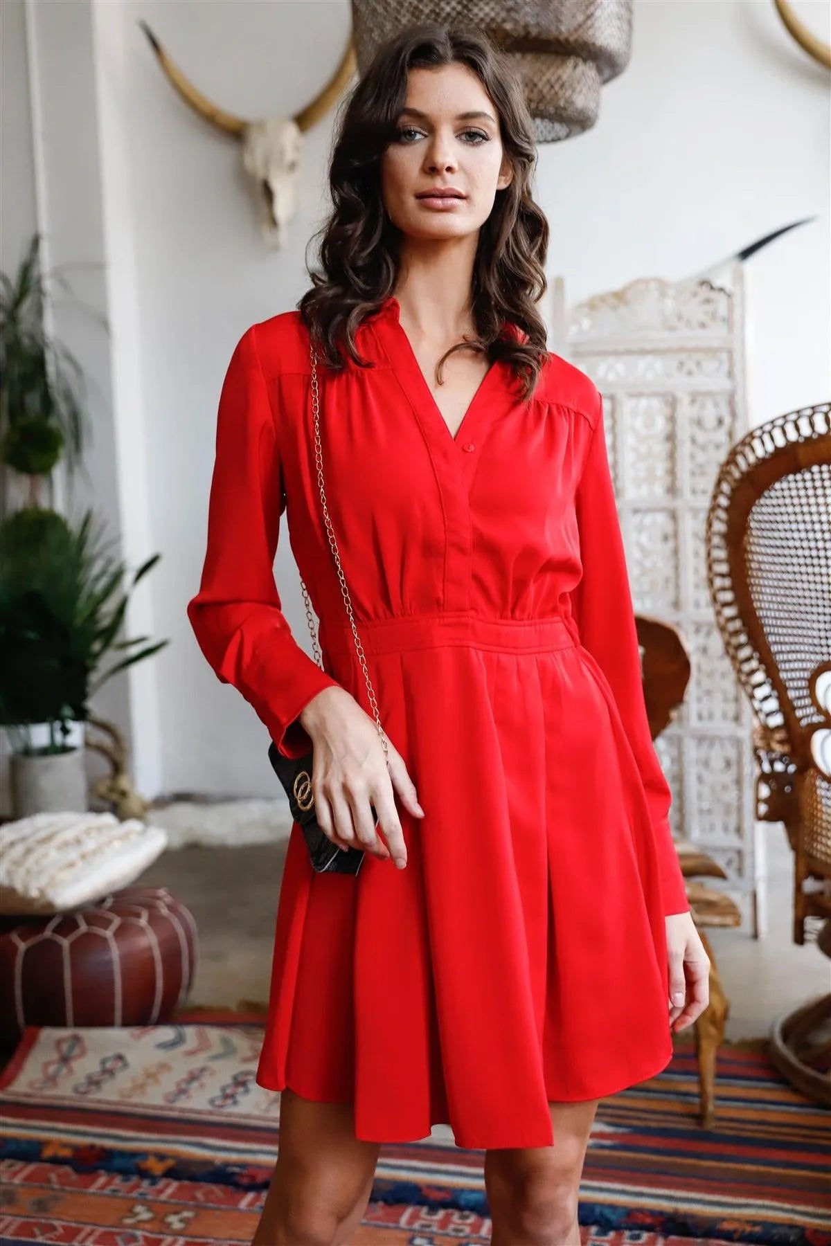 Red Collared Long Sleeve Pleated Mini Shirt Dress /1-2-2