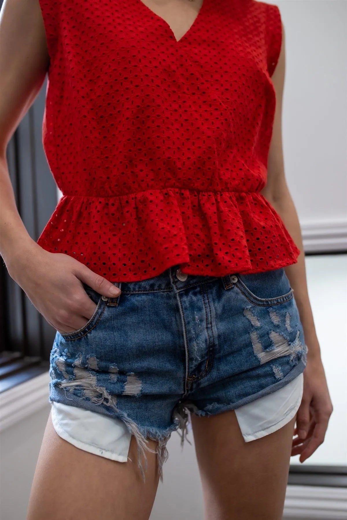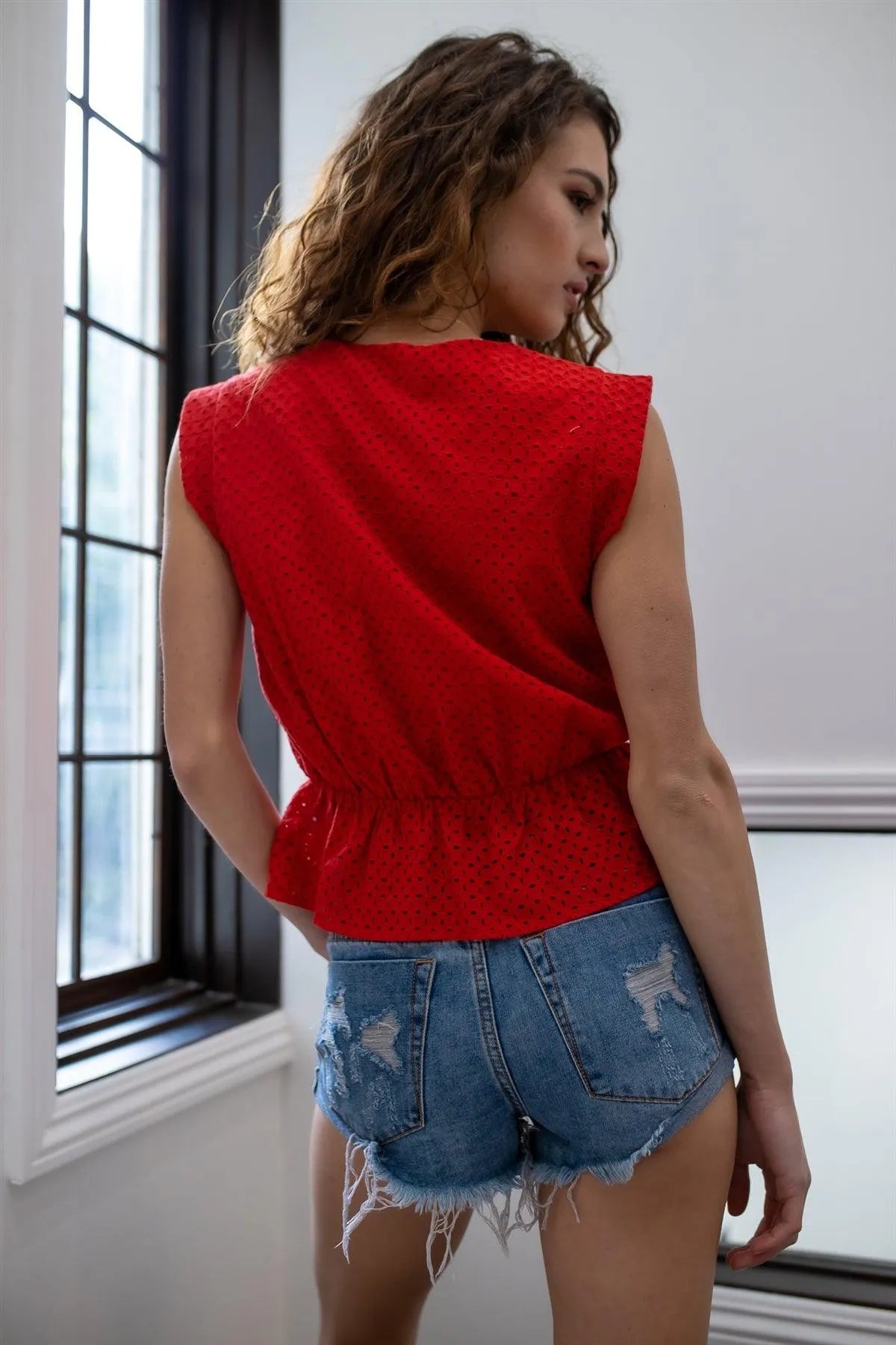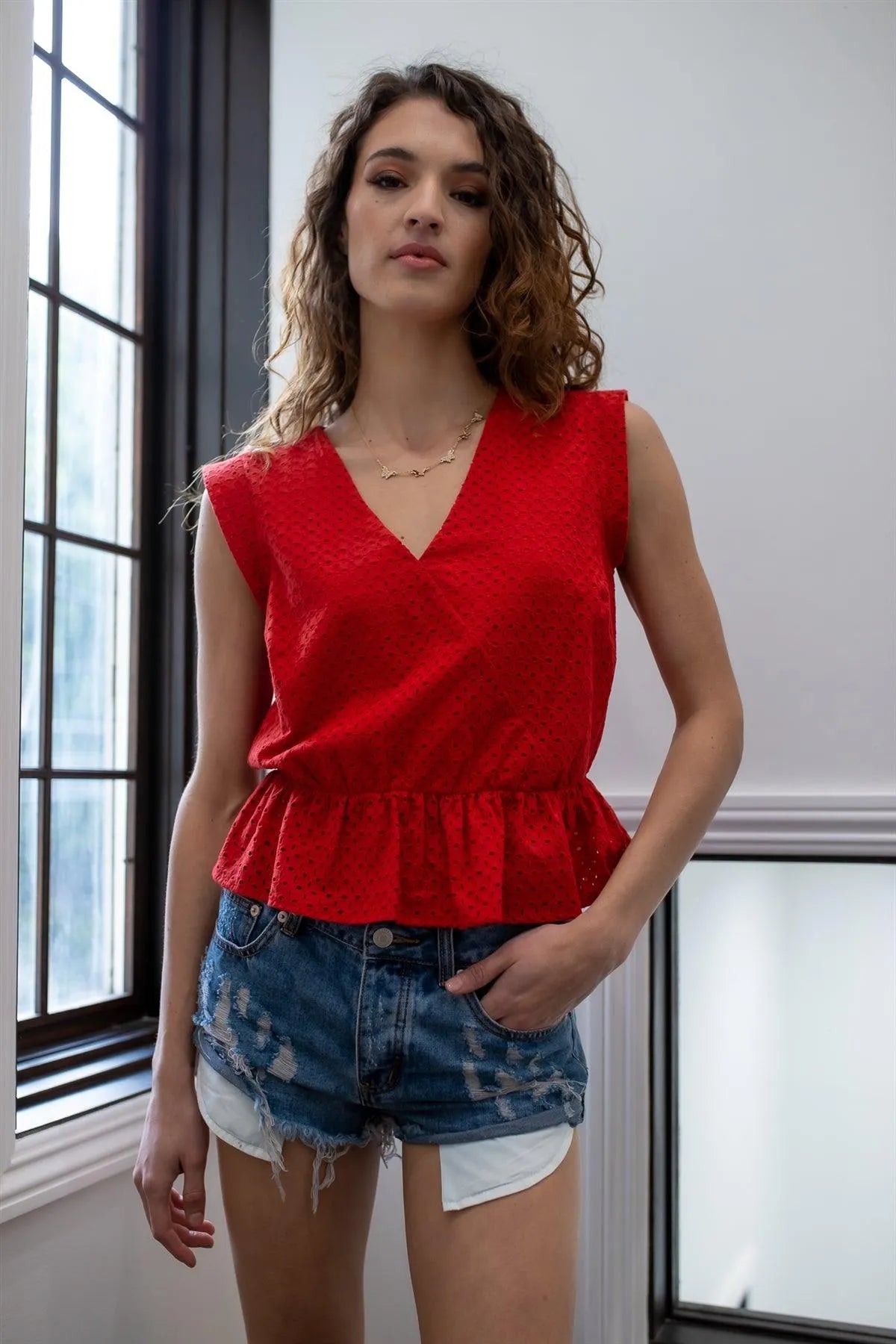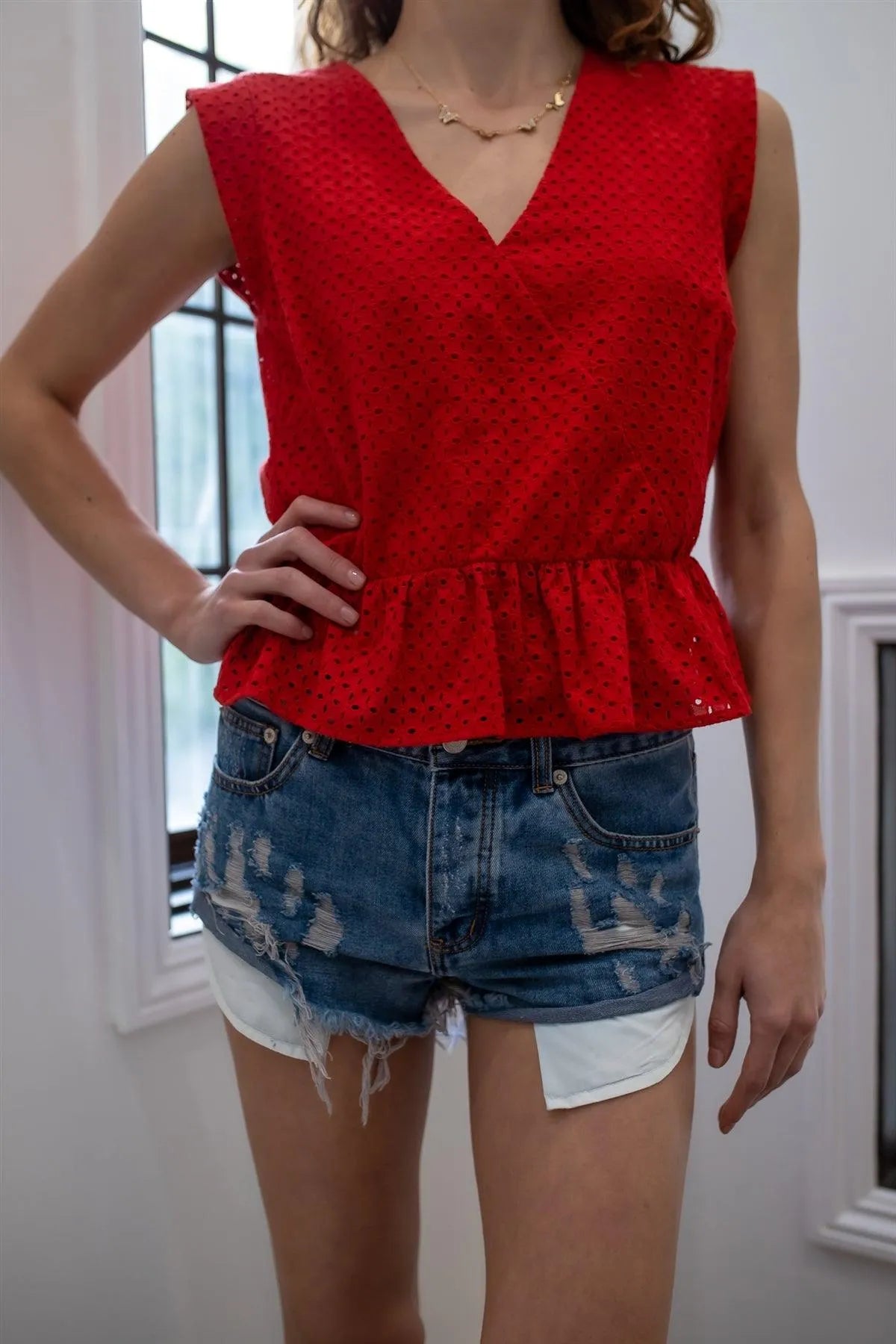 Red Cotton Embroidered Ruffle Hem Cap Sleeve Top /1-2-2