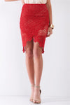 Red Crochet Embroidered High Waist Asymmetrical Midi Skirt With Golden Lining /1-2-2-1