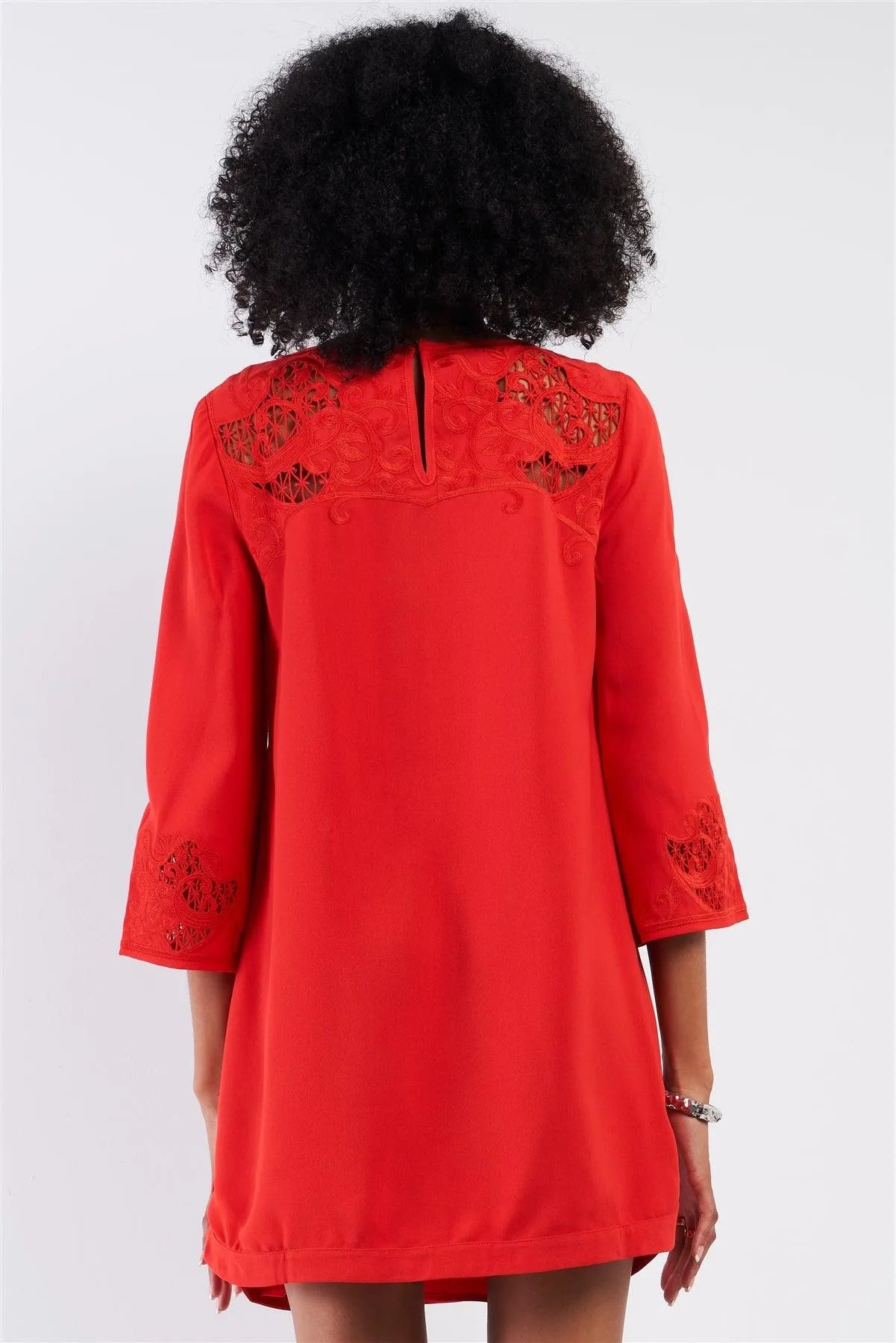 Red Crochet Embroidery Relaxed Fit Round Neck 3/4 Sleeve Mini Dress/2-2-1