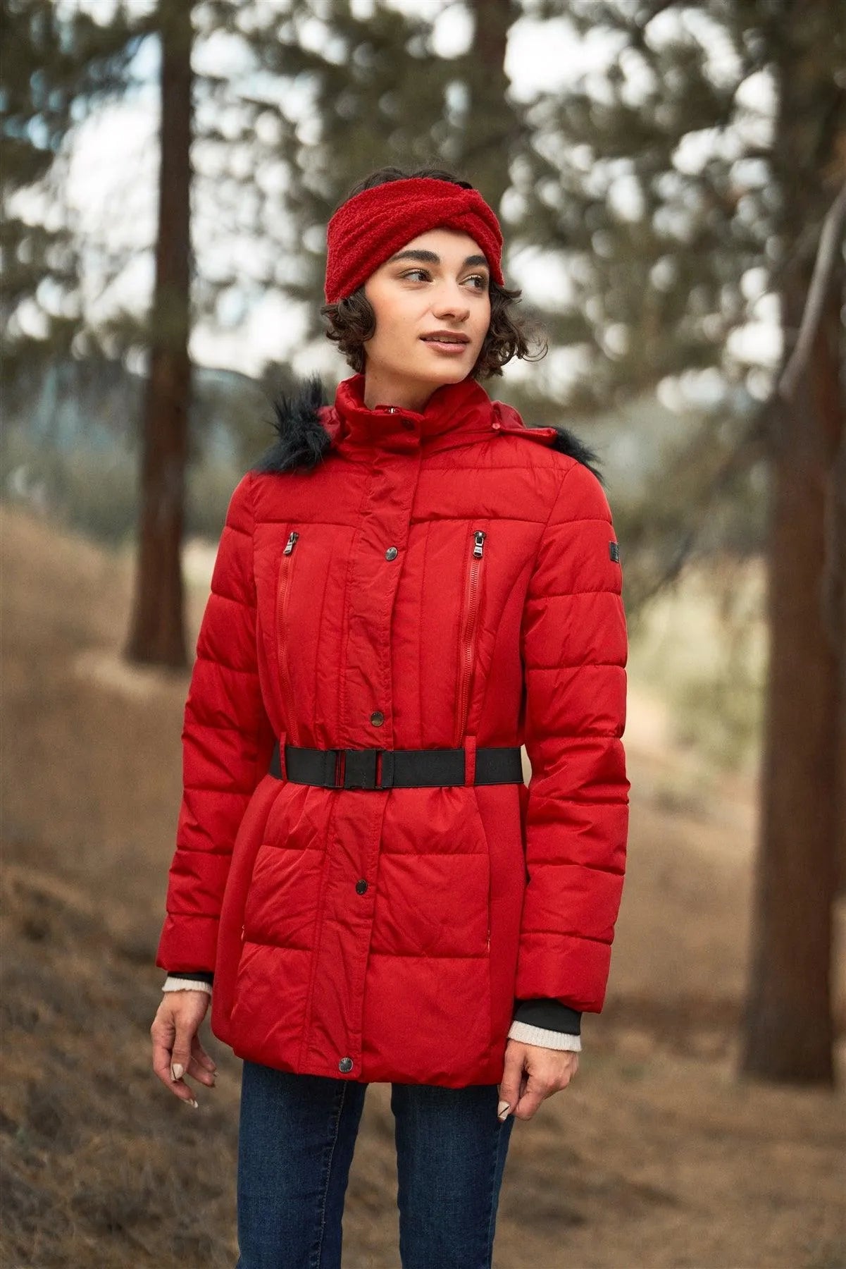 Red Faux Fur Harness Buckle Belt Detail Long Fitted Puffer Jacket /1-2-1-2