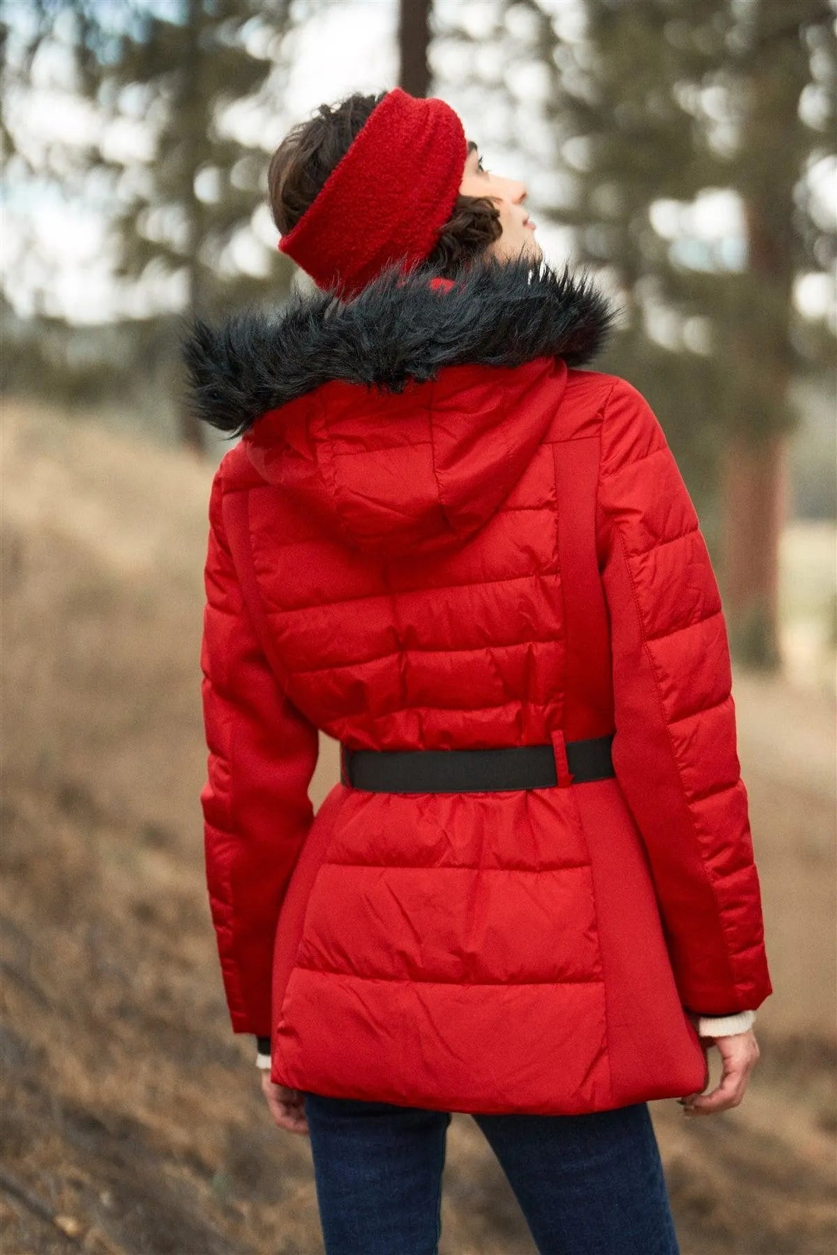 Red Faux Fur Harness Buckle Belt Detail Long Fitted Puffer Jacket /1-2-2-2