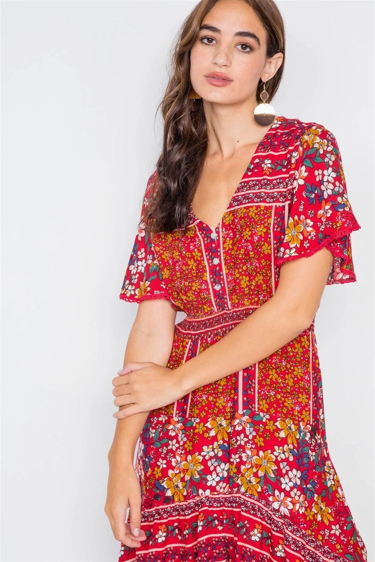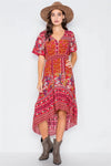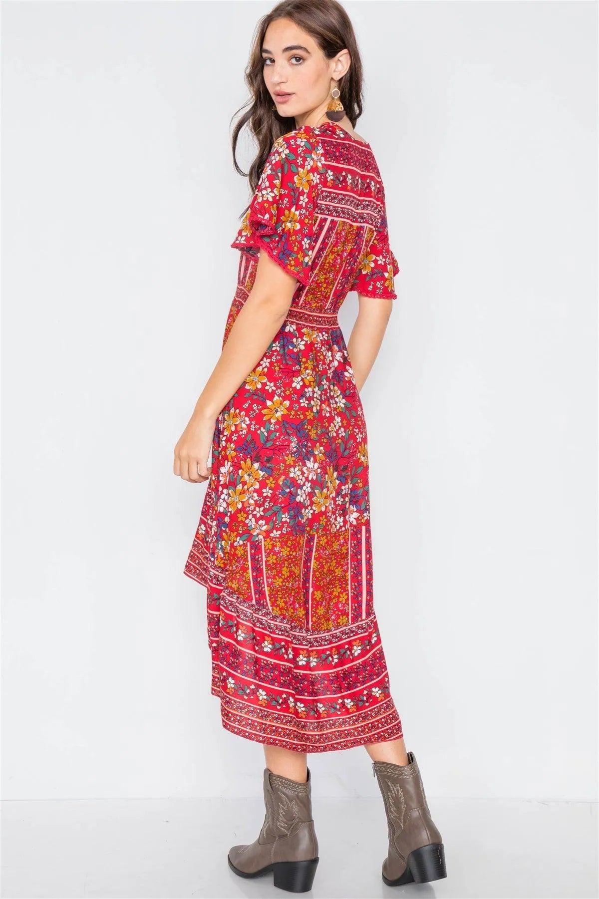 Red Floral High-Low V-Neck Midi Dress /2-2