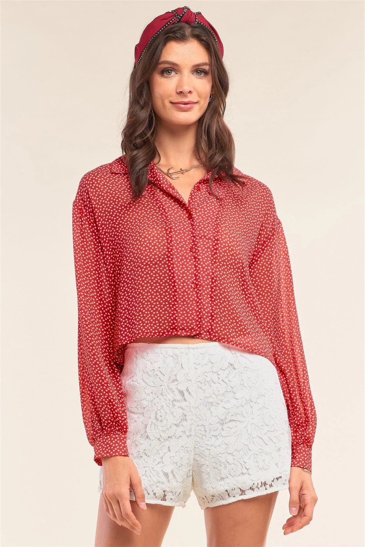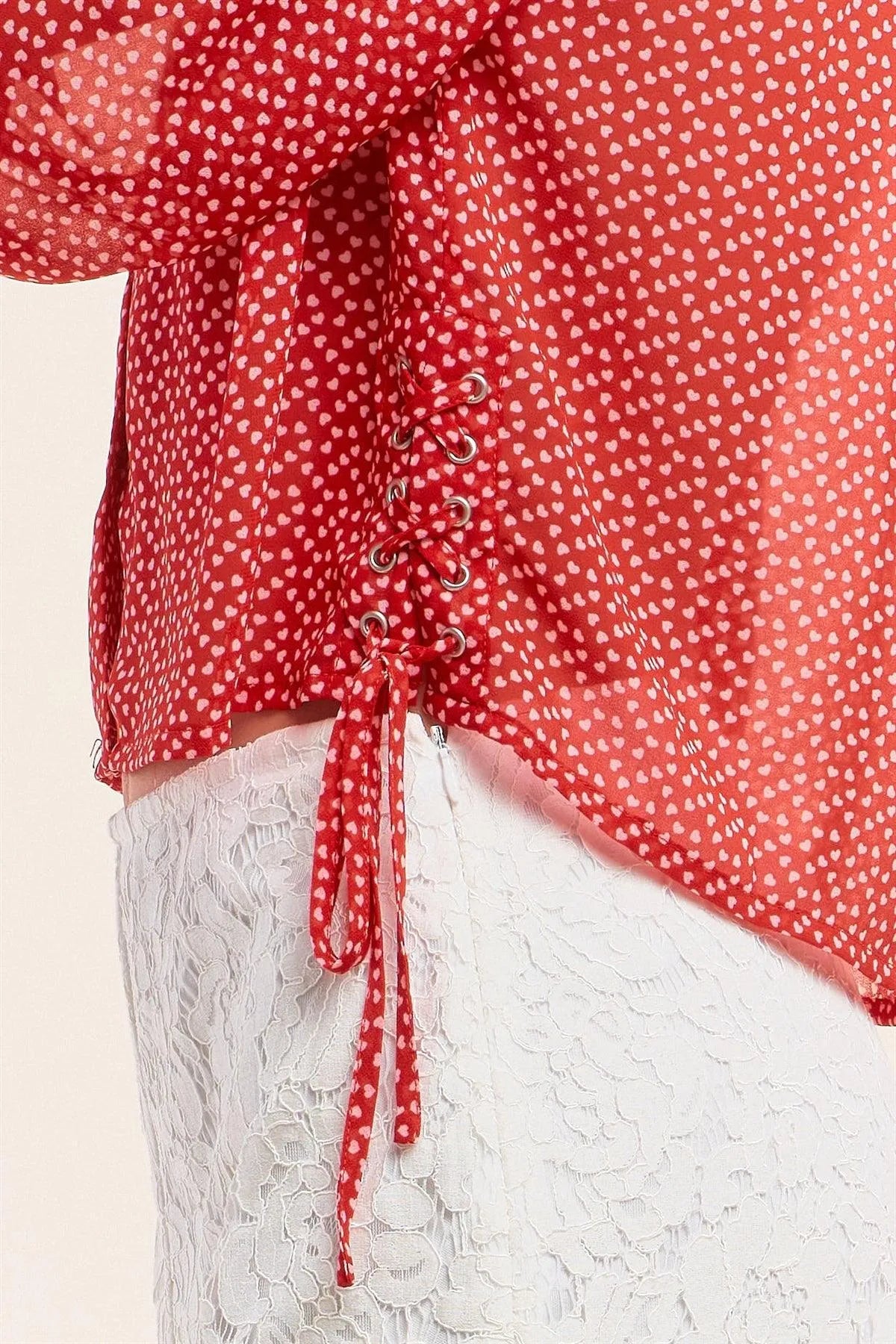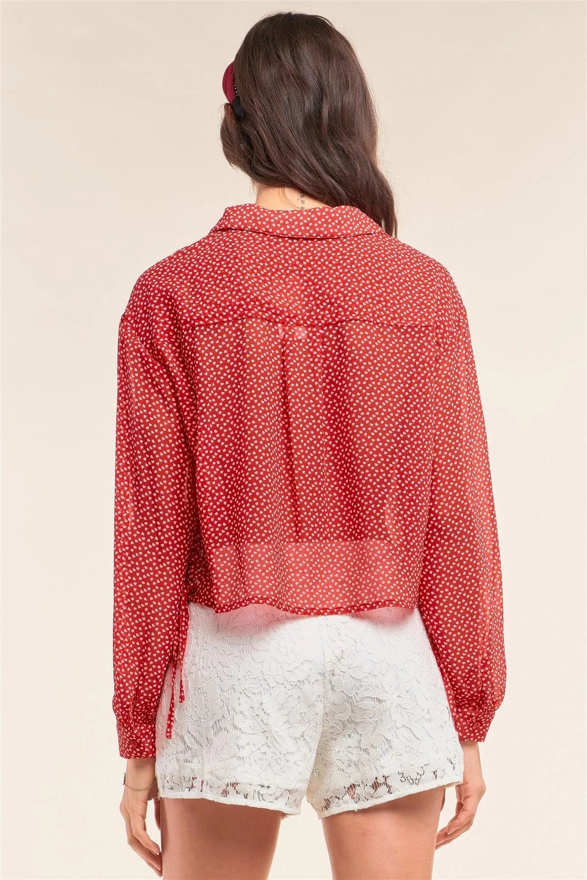 Red Retro Chic Heart Print Relaxed Fit Long Sleeve Criss-Cross Tie Up Detail Button Up Cropped Shirt /1-2-2