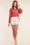 🖤 Item Features: Red, white heart print allover, long sleeve with buttoned cuff, collared, button up, criss-cross corset inspired draw string tie-up side detail, cropped length, relaxed fit, unlined, non-stretch, semi-sheer, casual, retro chic style, vintage looking, cute, girly, gentle, comfy, fall/winter collection