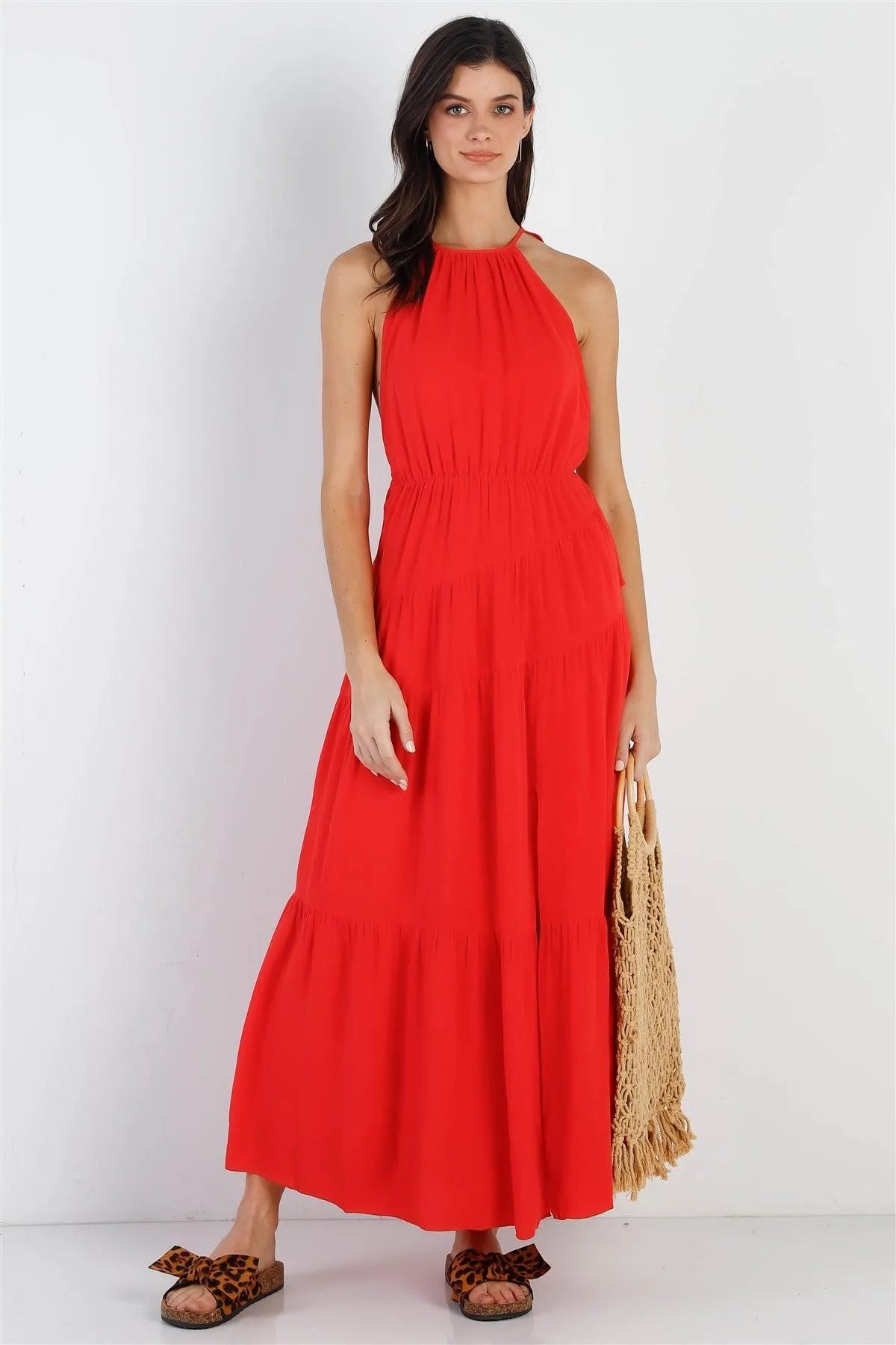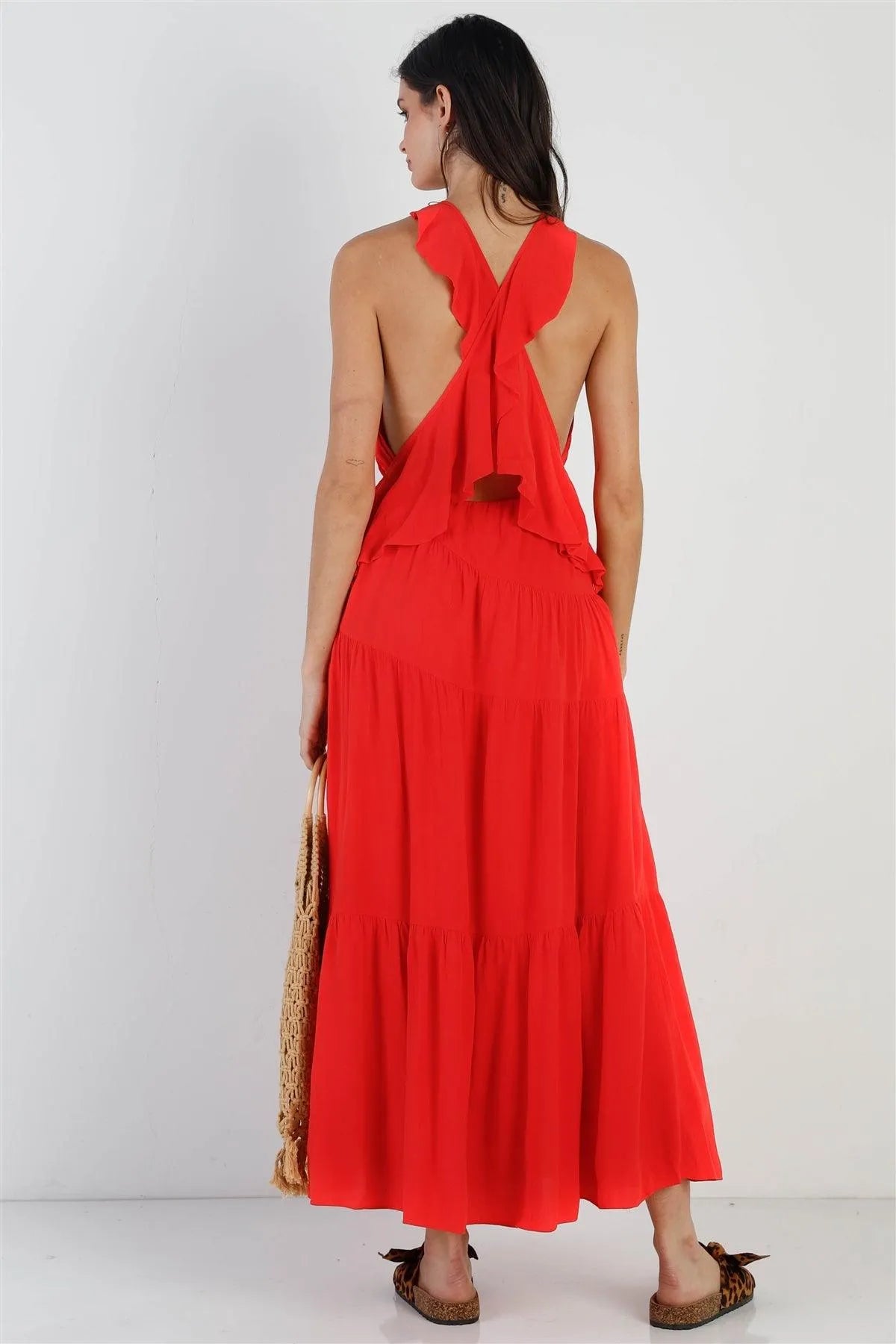 🖤 Item Features: Red, solid color, linen material, criss cross back straps, sleeveless, round neckline, ruffled, elasticized waistline, side slit detail, maxi length, lined, non-stretchy, non-sheer, casual, cute, bright, stylish, trendy