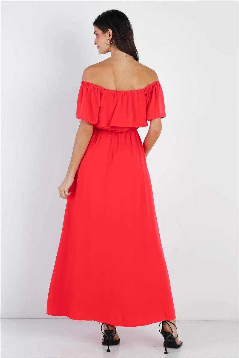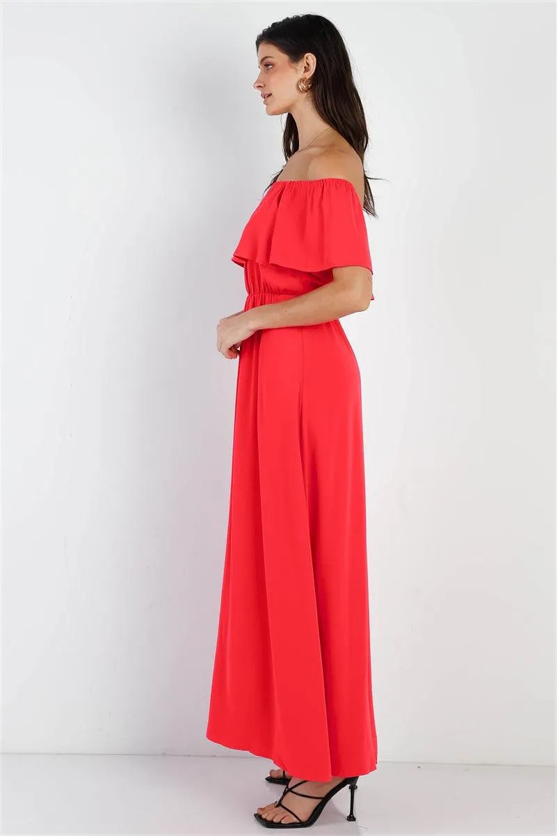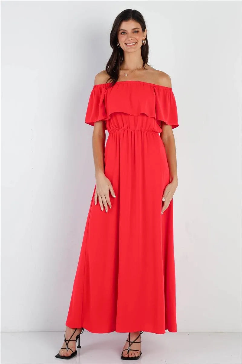 🖤 Item features: solid, red, off the shoulder, tiered ruffle, elastic waistband, maxi length, lined, loose fit, lined, stylish, trendy, cute, boho style