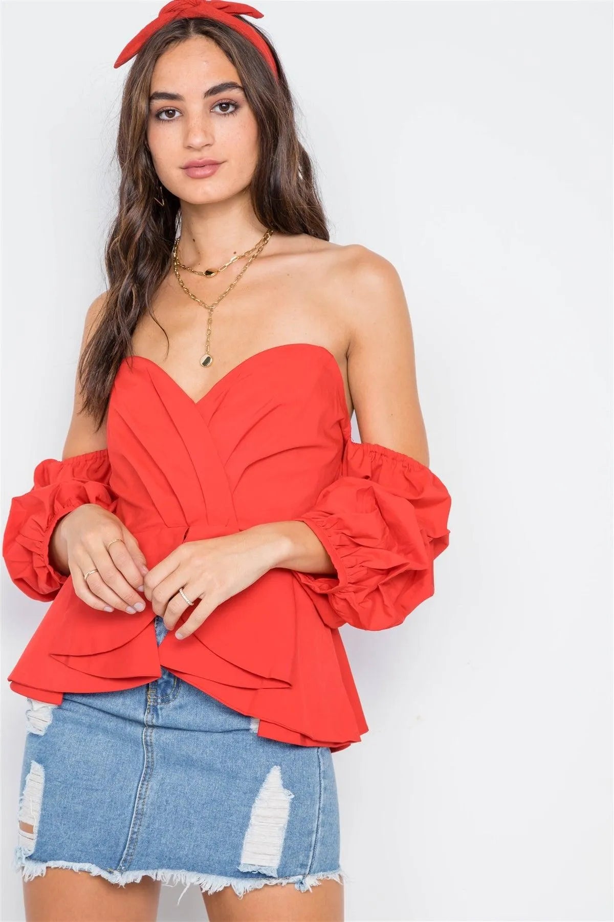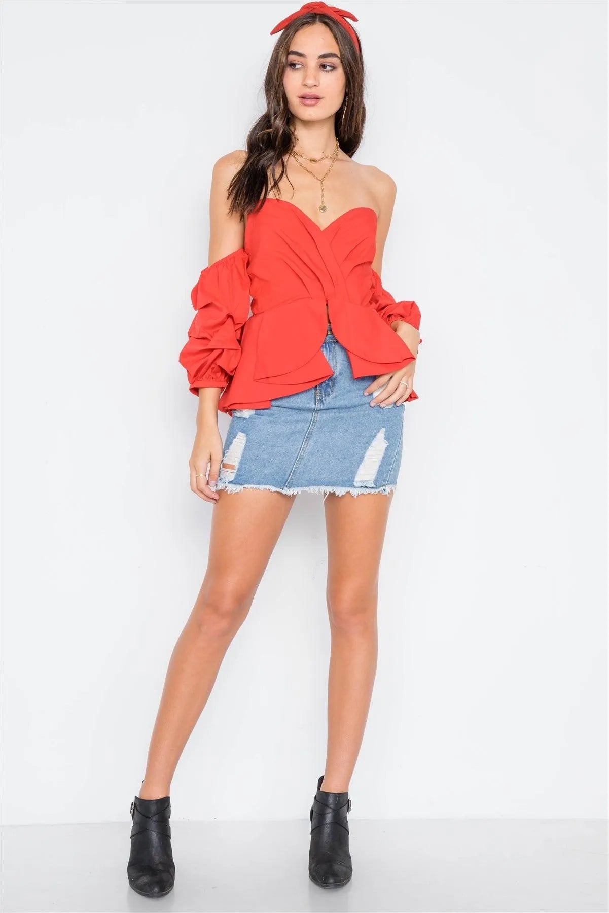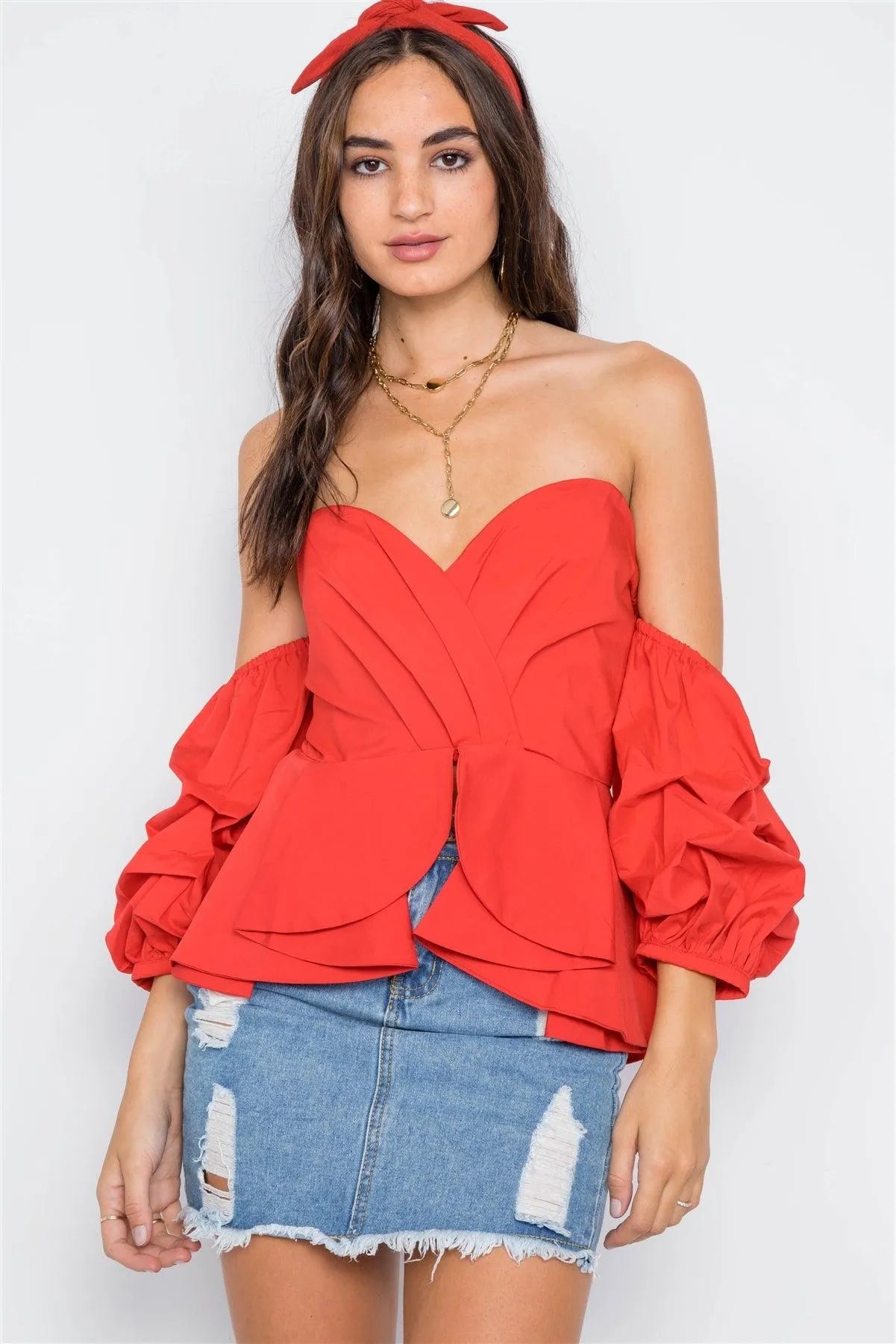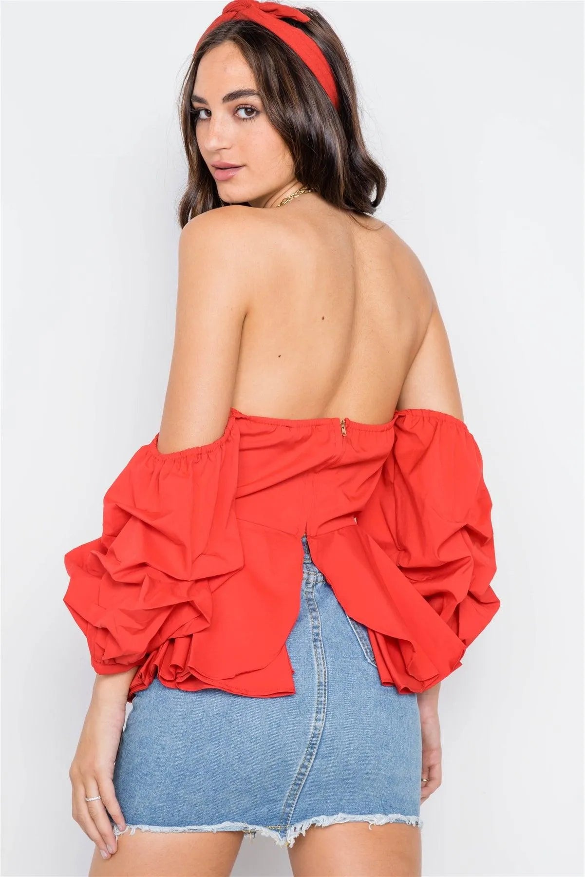 Red Off-The-Shoulder Bell Sleeve Crop Top