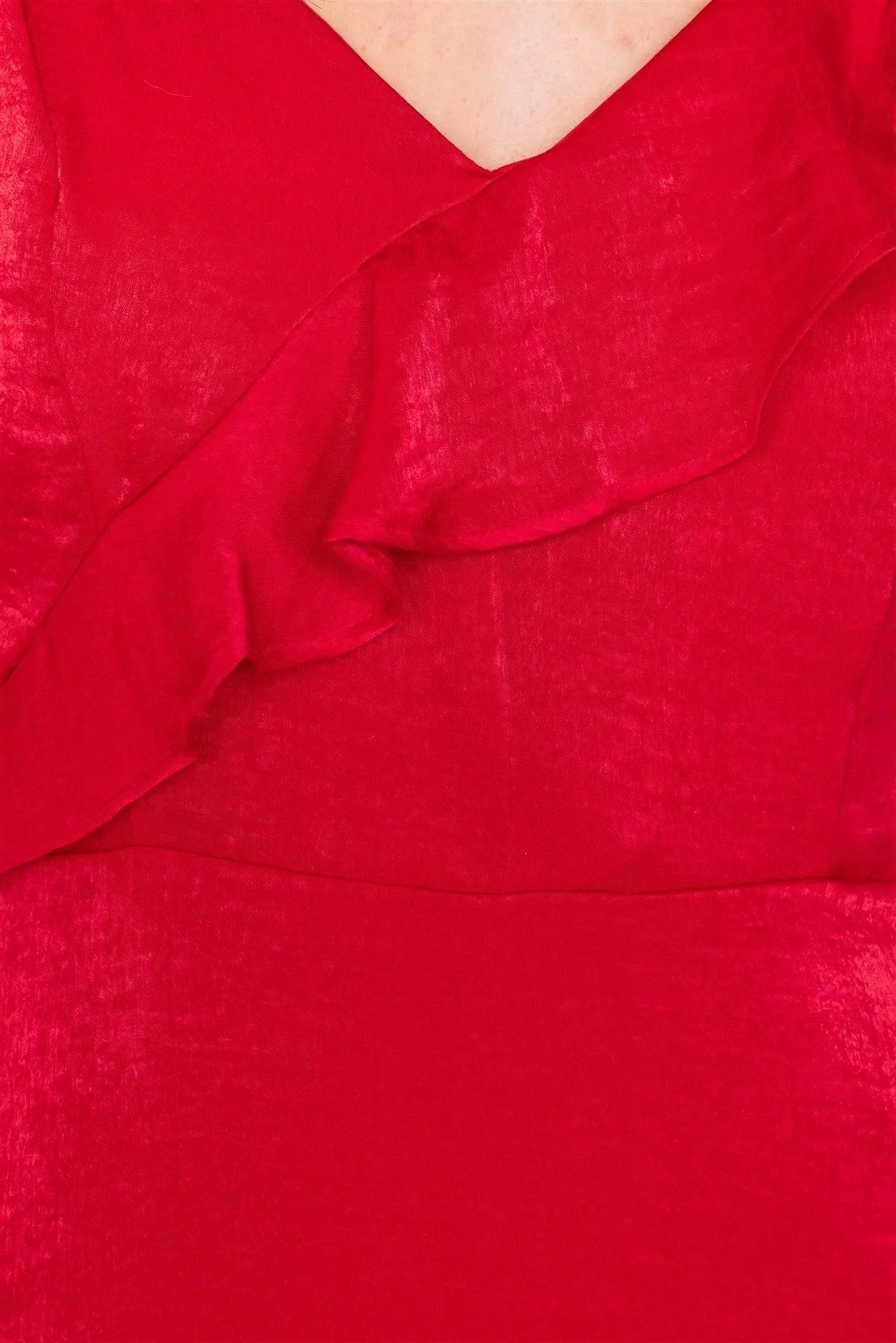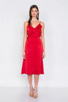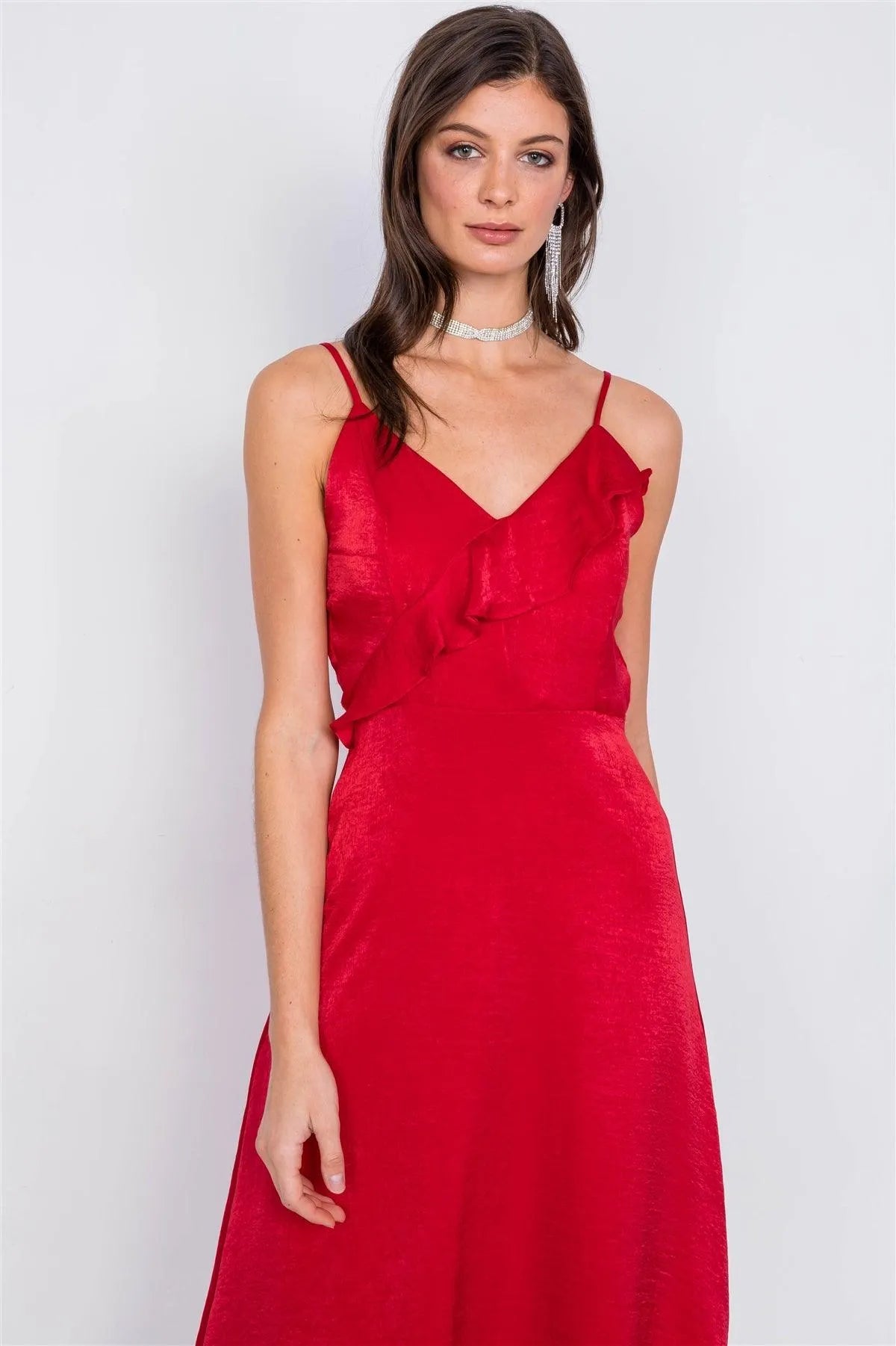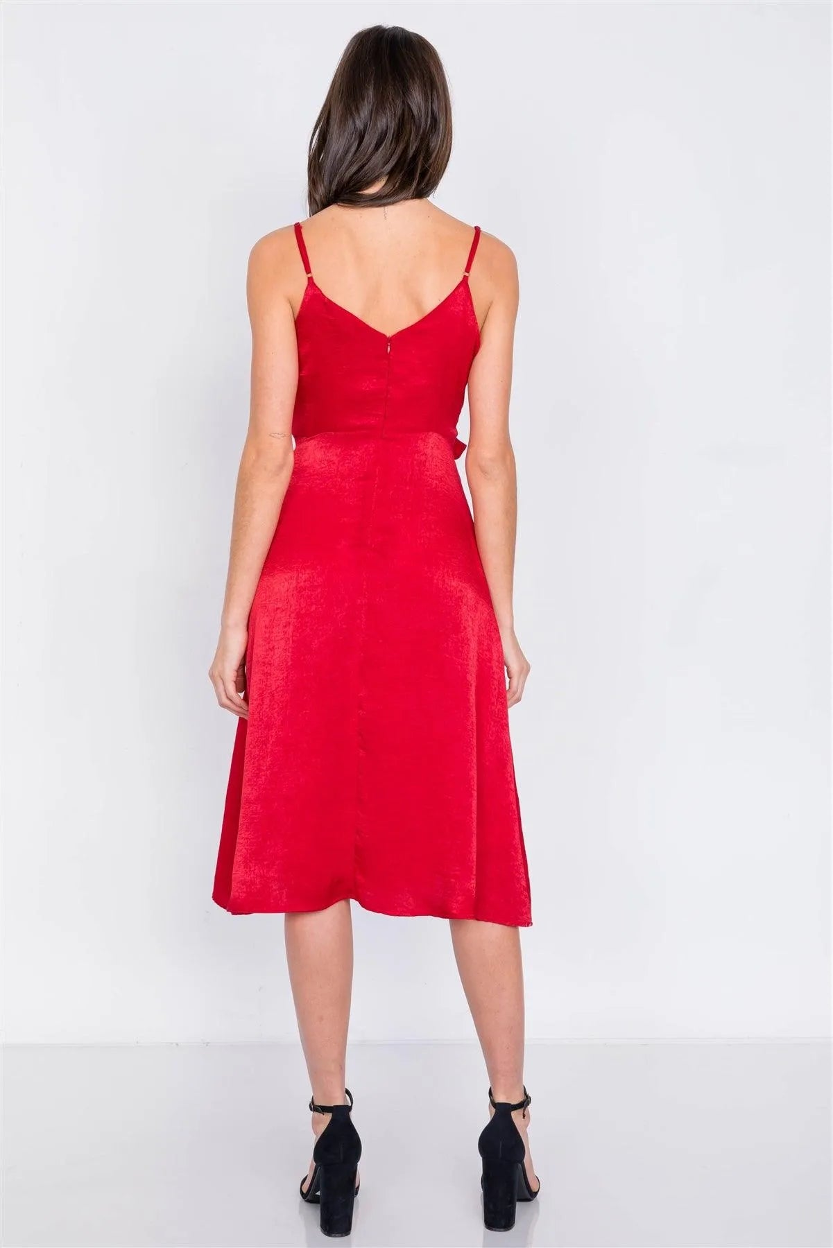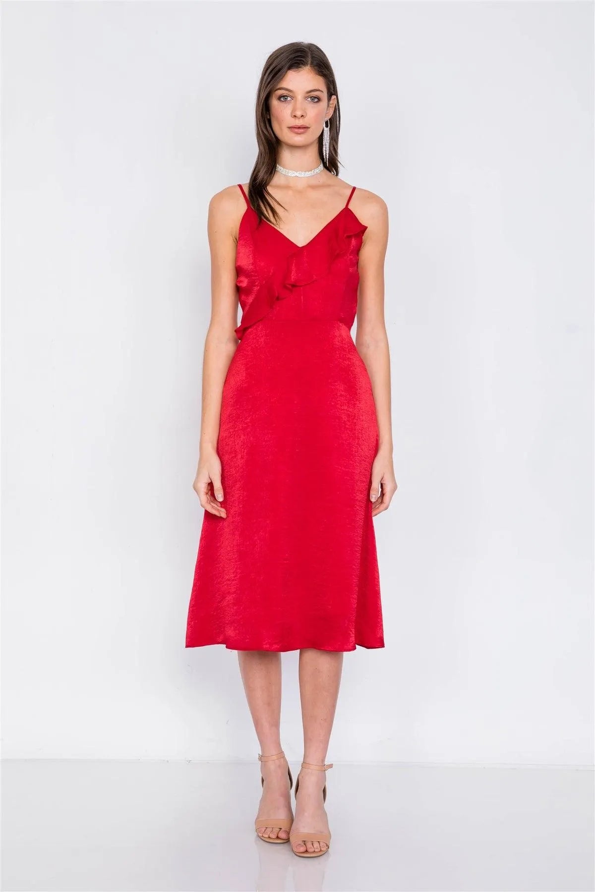 Red Satin Flounce Trim V-Neck A-Line Midi Chic Dress /2-2-2