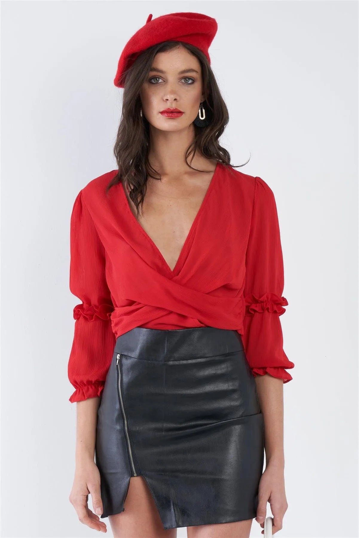 Top features: sheer chiffon, red, solid, chic, tiered frill puff sleeve, front cross, v-neck, back button closure, chic, crop length, mini, elastic back, unlined, stretchy. Model is 5'8 wearing a size Small ( Waist: 26", Bust: 32B, Hips: 34")Item measurements: Length: 15'', Bust: 36", Sleeve: 18.5"Item comes pre-packed with hang tagsTrue to size