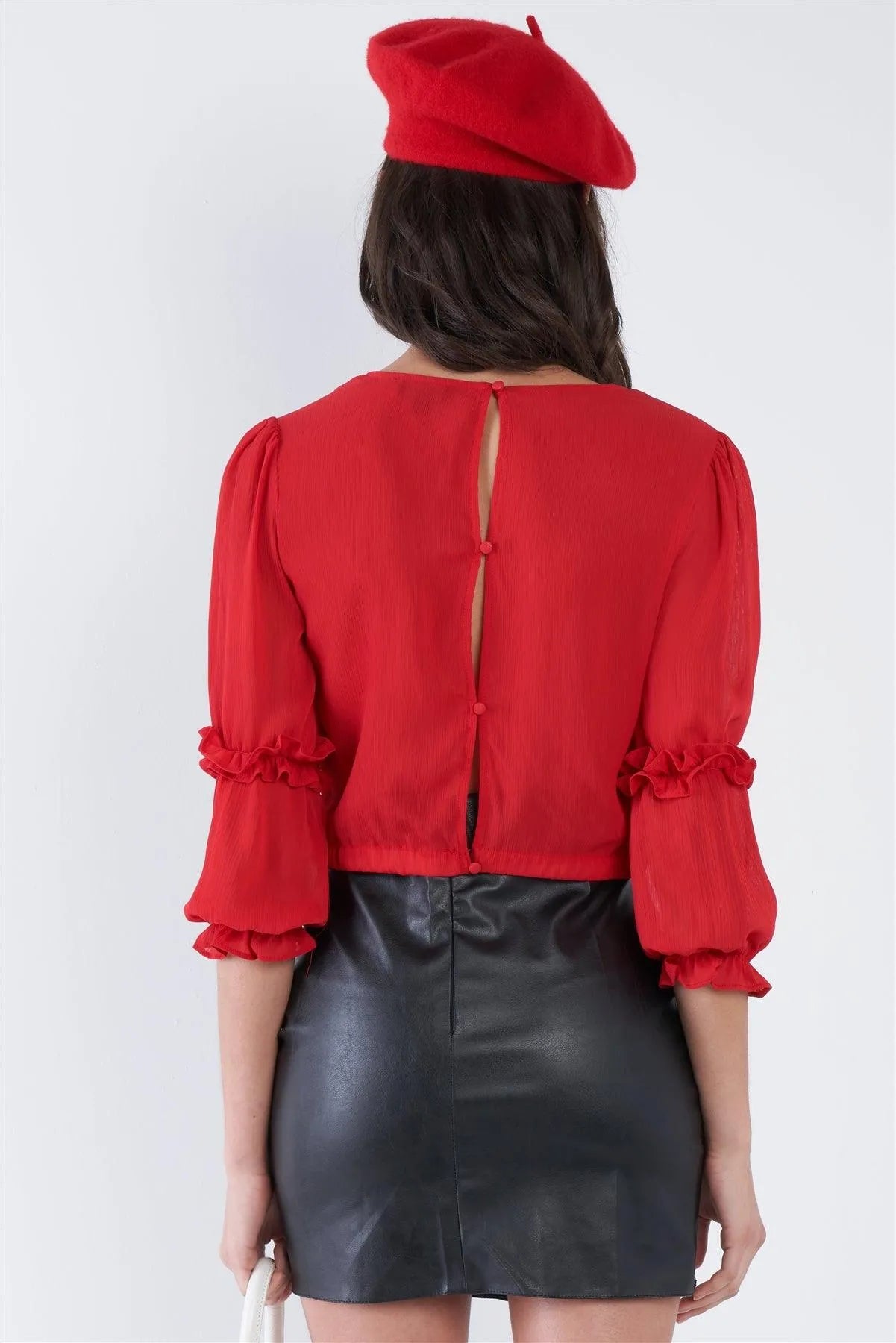 Red Sheer Chiffon Tiered Ruffle Puff Sleeve Crop V-Neck Top /2-2-2