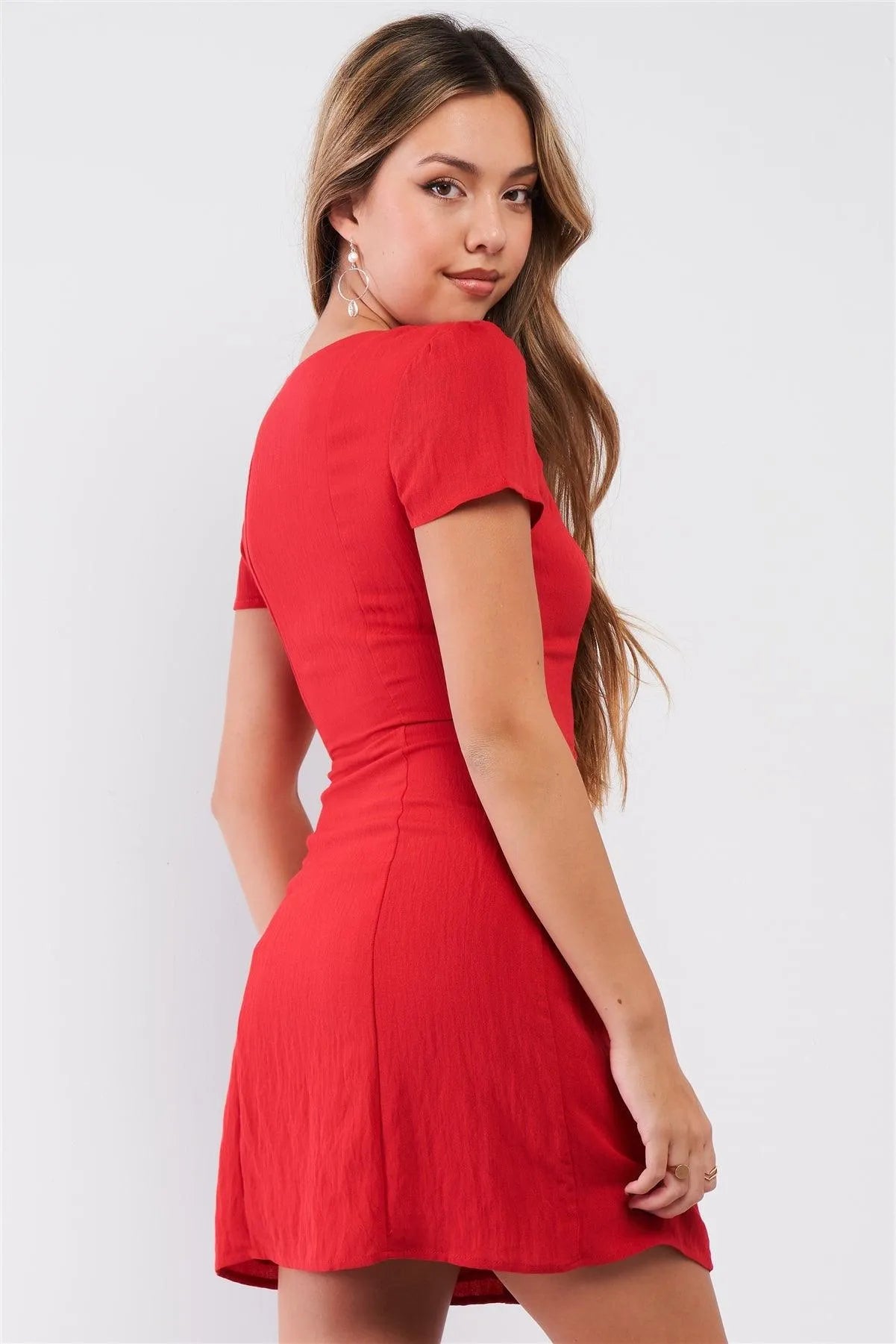 🖤 Item Features: Red, solid, short sleeve, scoop neckline, front self-tie corset inspired lace-up detail, A-line fit, top stitched, fitted, non-stretchy, lined, mini length, casual, comfy, stylish, date look, cute, flirty, spring/summer collection