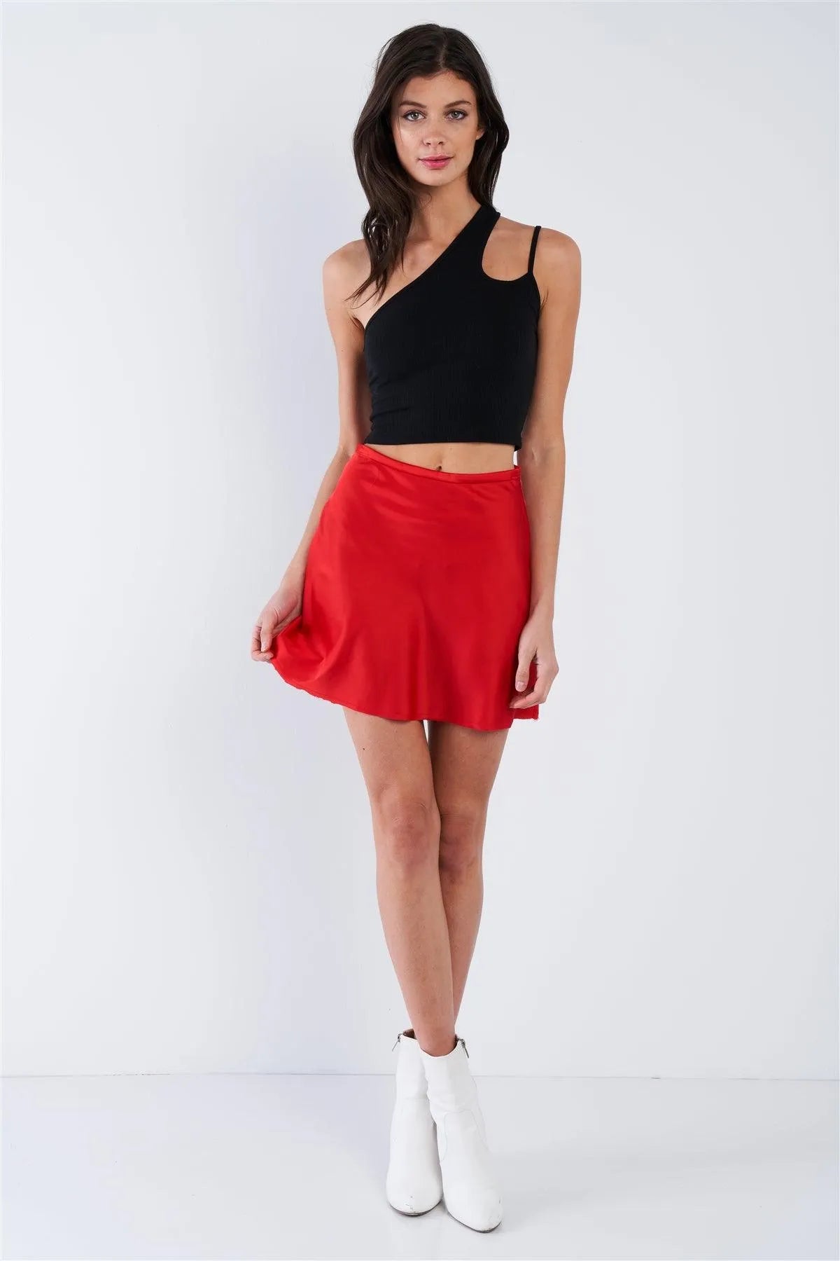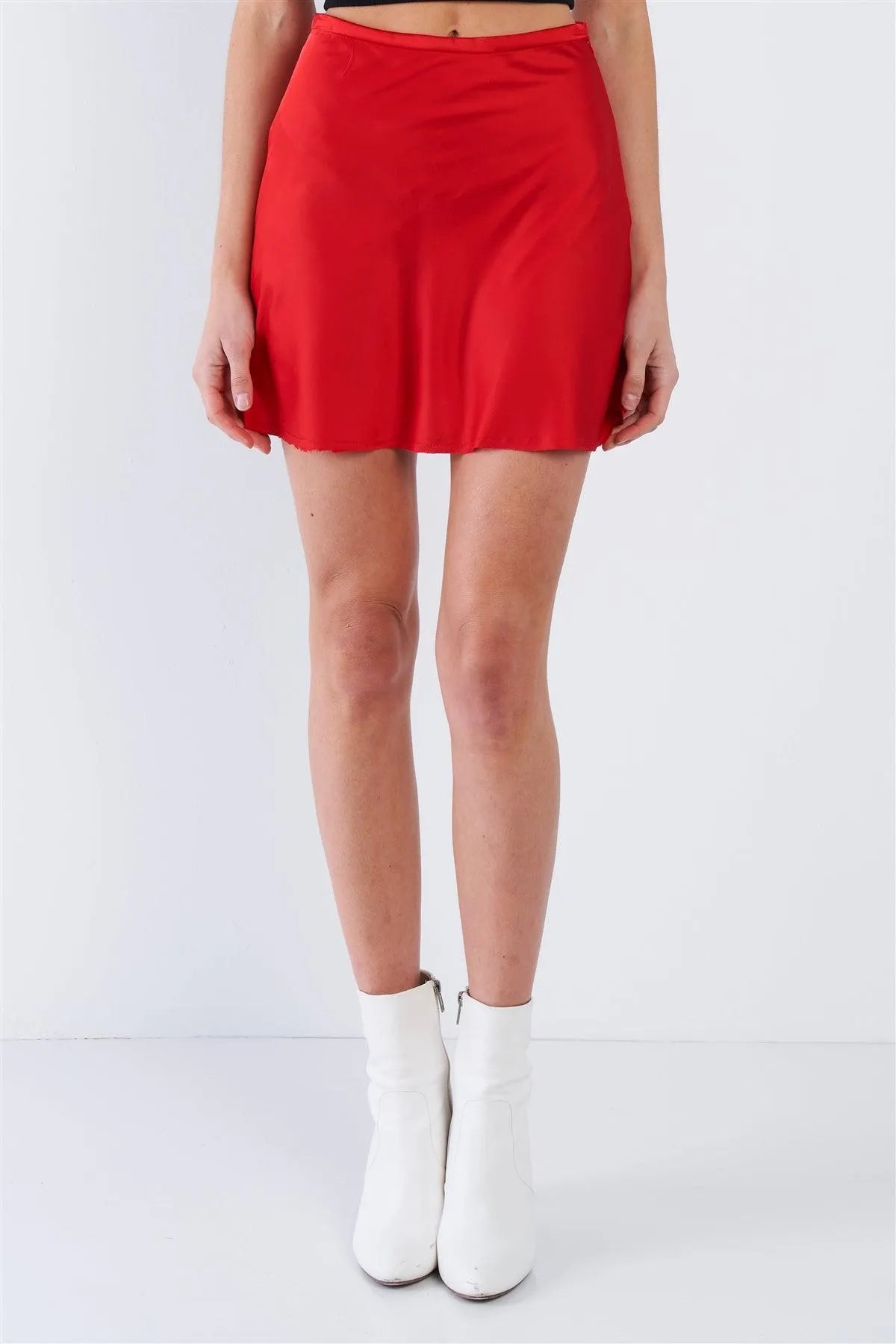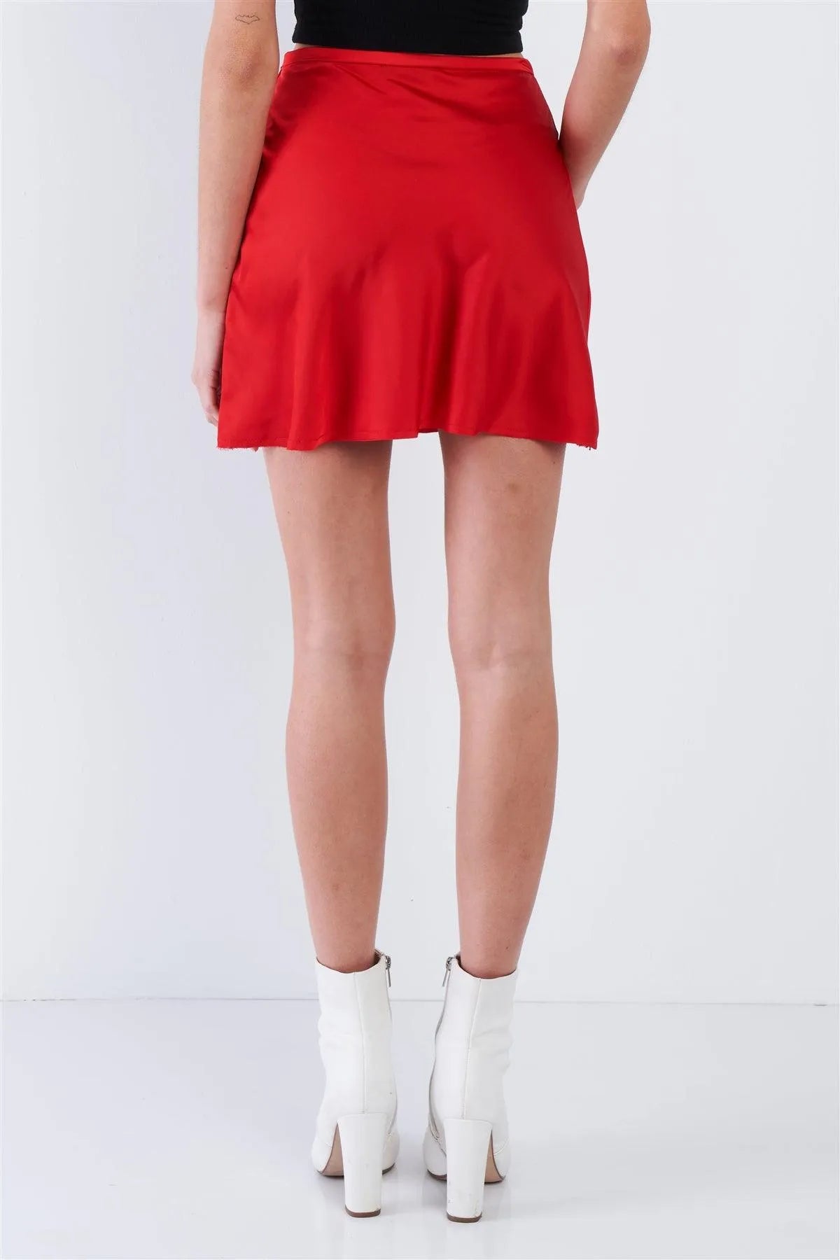 Red Silk Flare Raw Hem Solid Mini Skirt /3-2-1