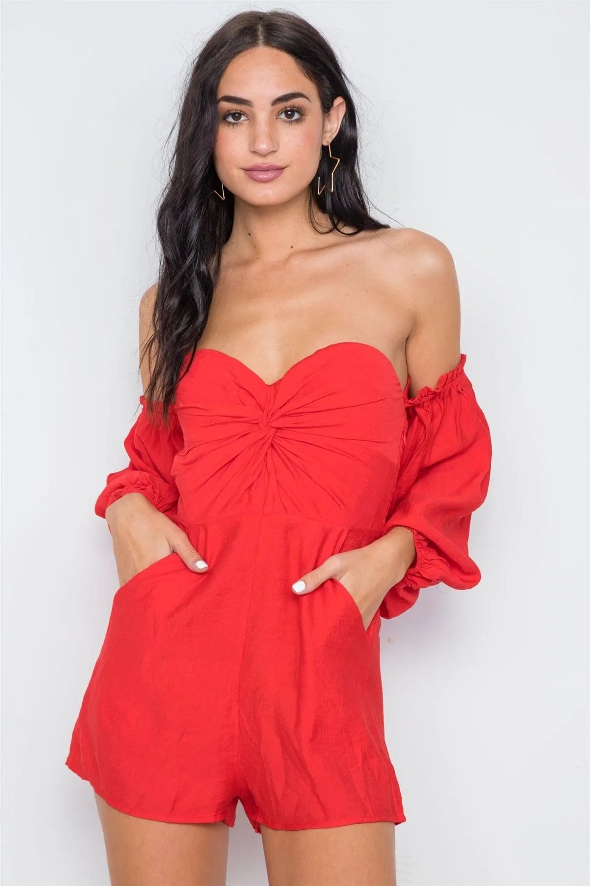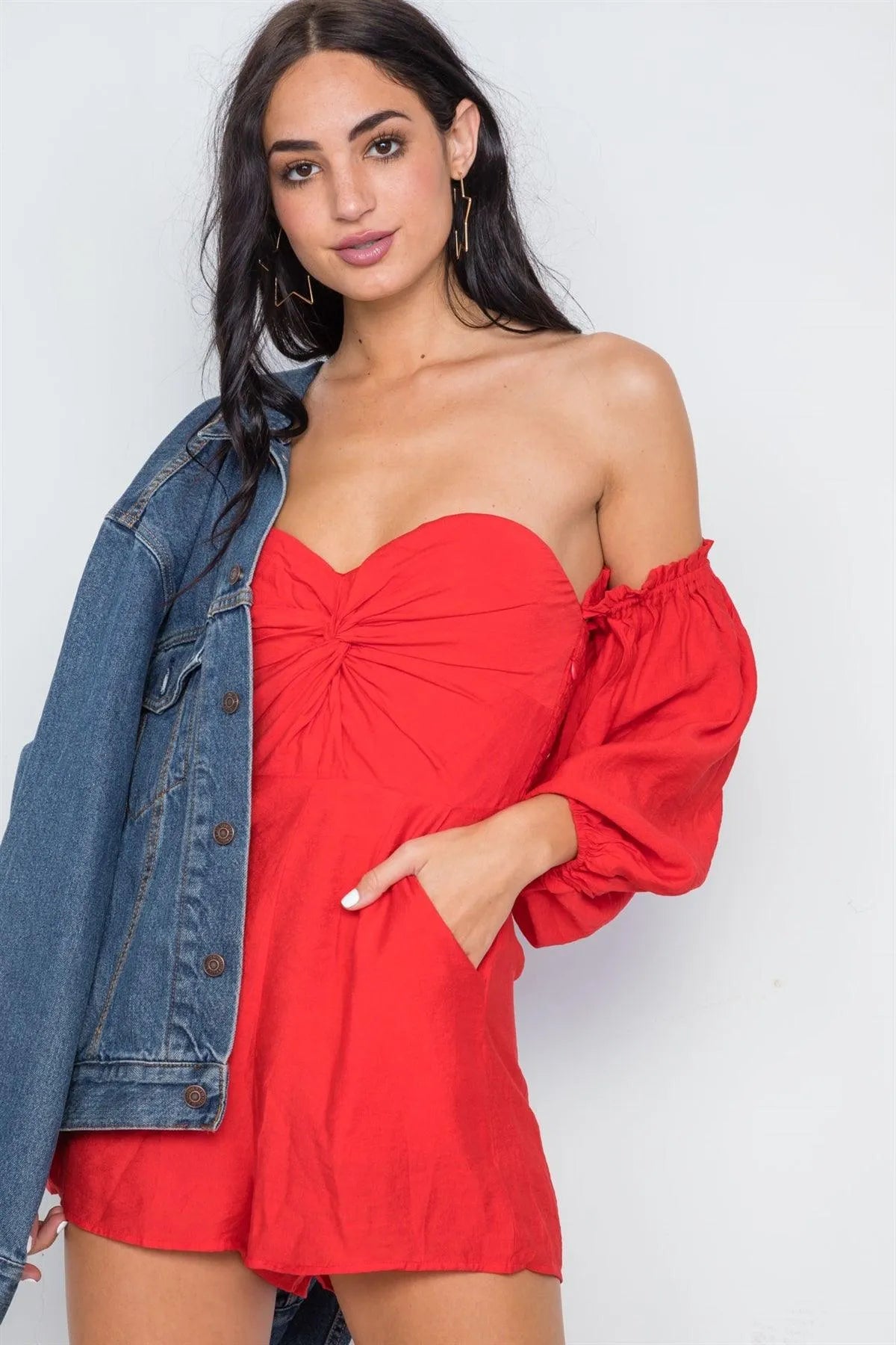 Red Sweetheart Neckline Puff Sleeves Romper /1-3-2-1