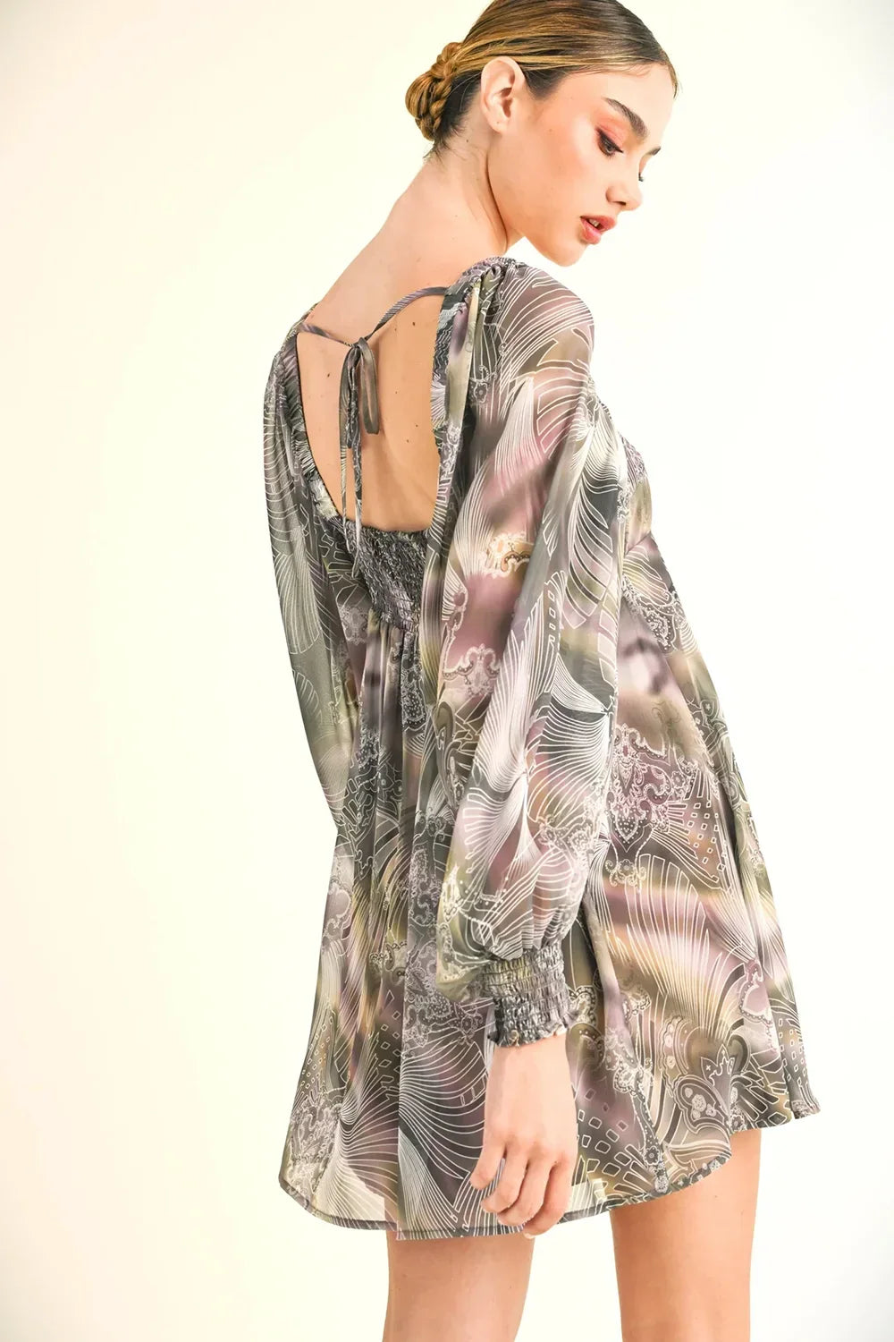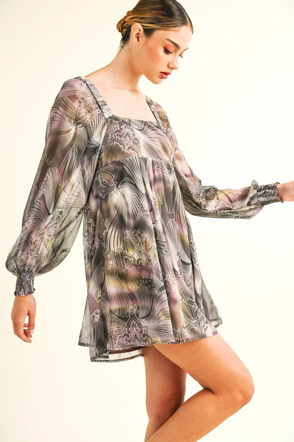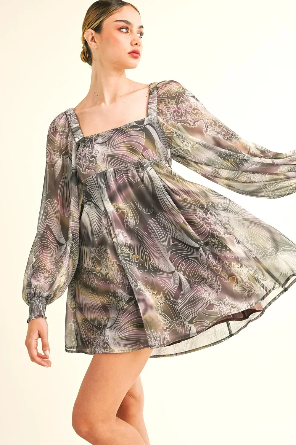 🖤 Features: Lightweight flowing chiffon, square neckline, dramatic balloon sleeves, elasticated cuffs, open back with tie closure, flowing A-line silhouette, mini dress length, long sleeve design, abstract artistic print, true to size fit