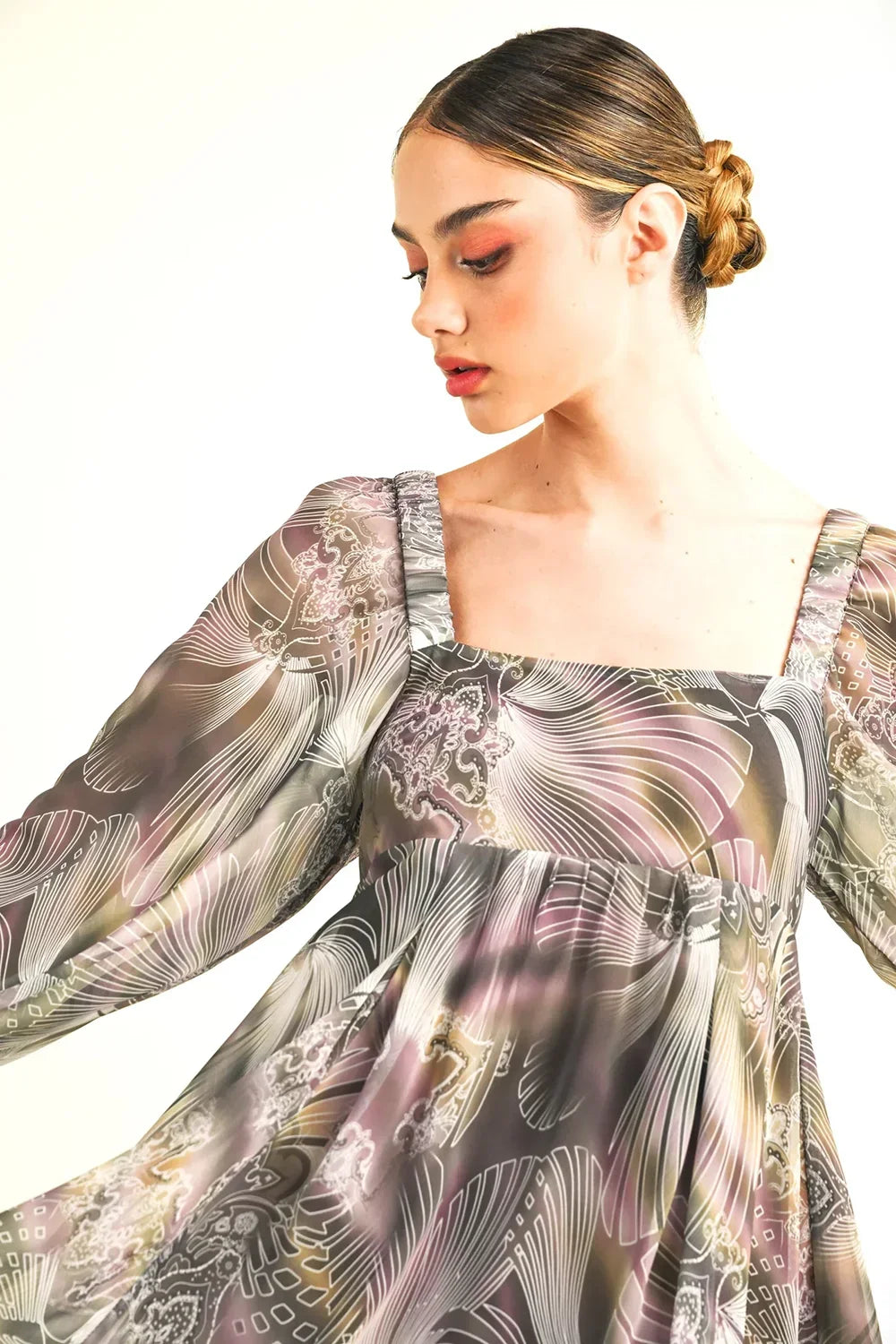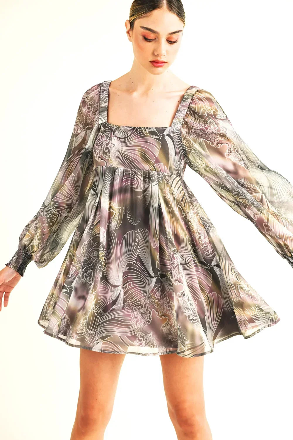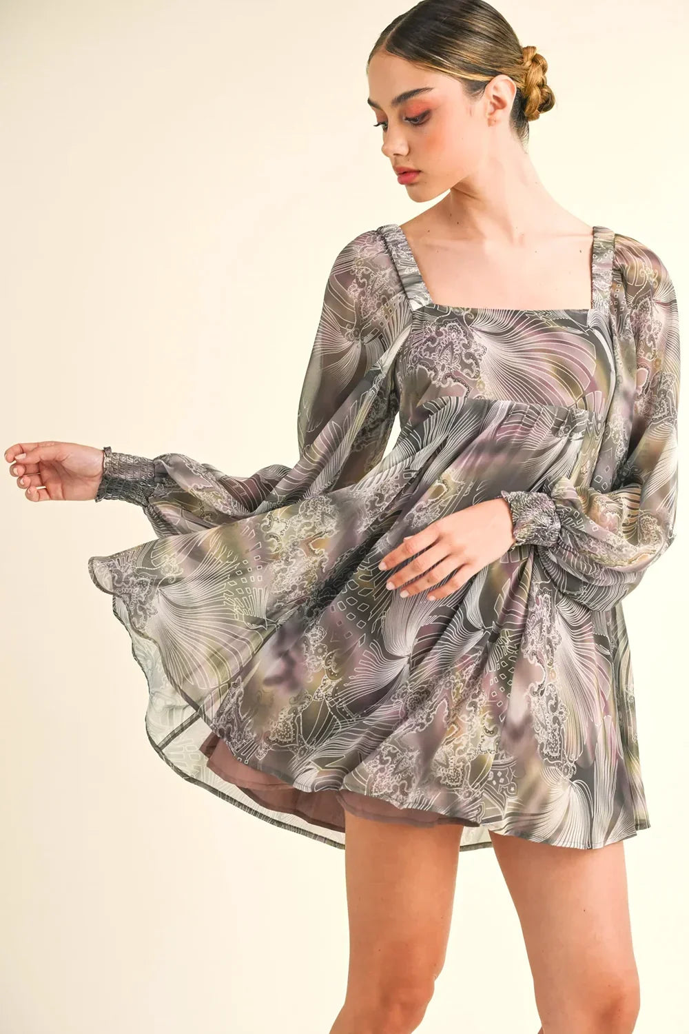 🖤 Features: Lightweight flowing chiffon, square neckline, dramatic balloon sleeves, elasticated cuffs, open back with tie closure, flowing A-line silhouette, mini dress length, long sleeve design, abstract artistic print, true to size fit