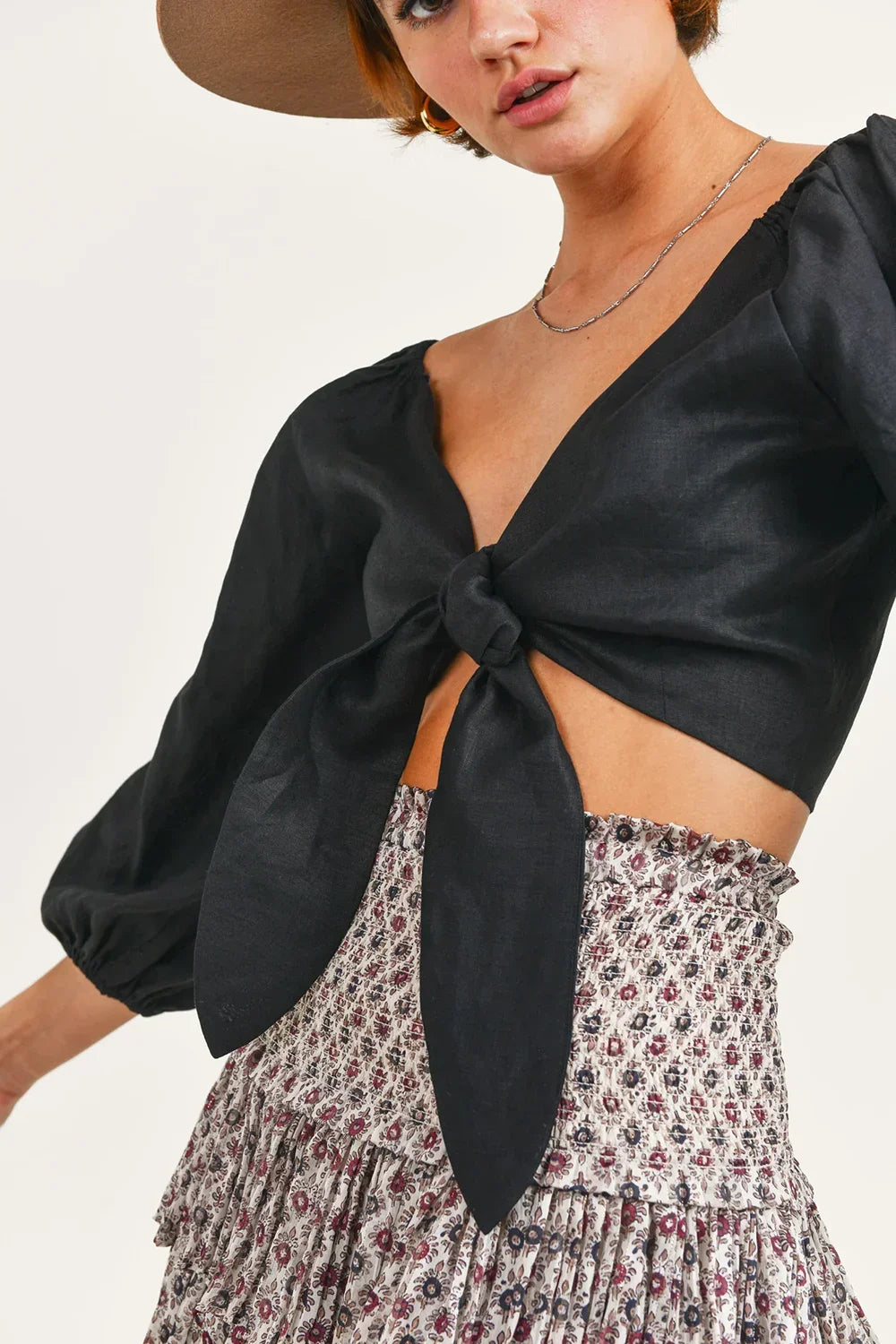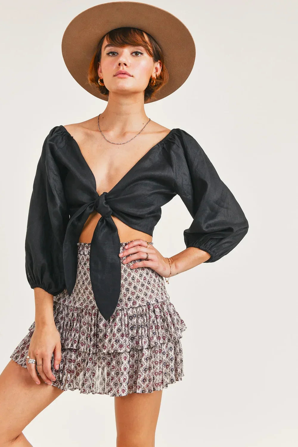 Linen Front Tie Puff Sleeve Deep V-Neck Cropped Boho Summer Bolero Malibu Blouse